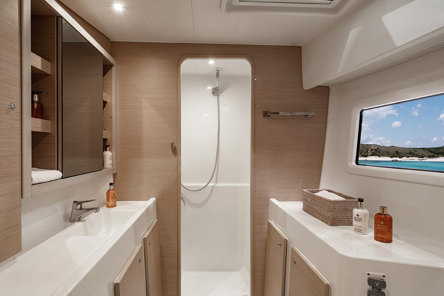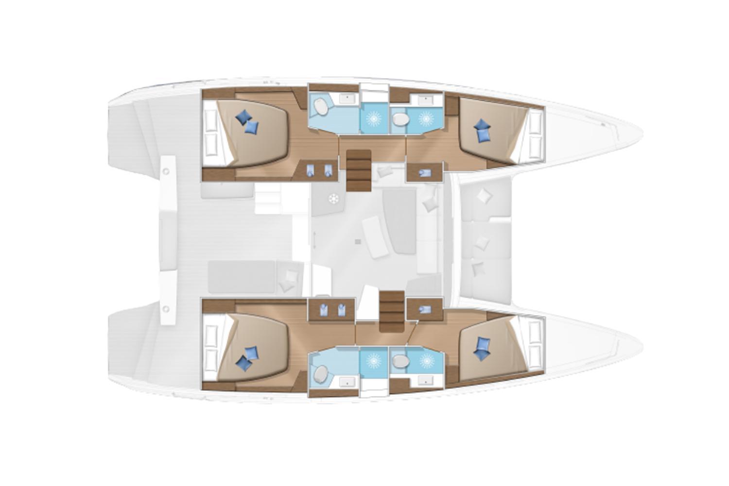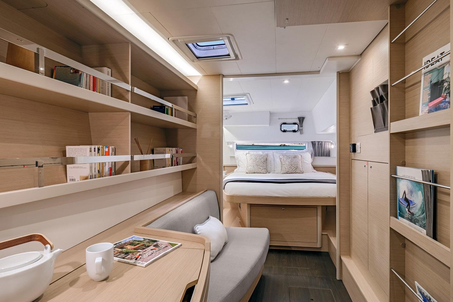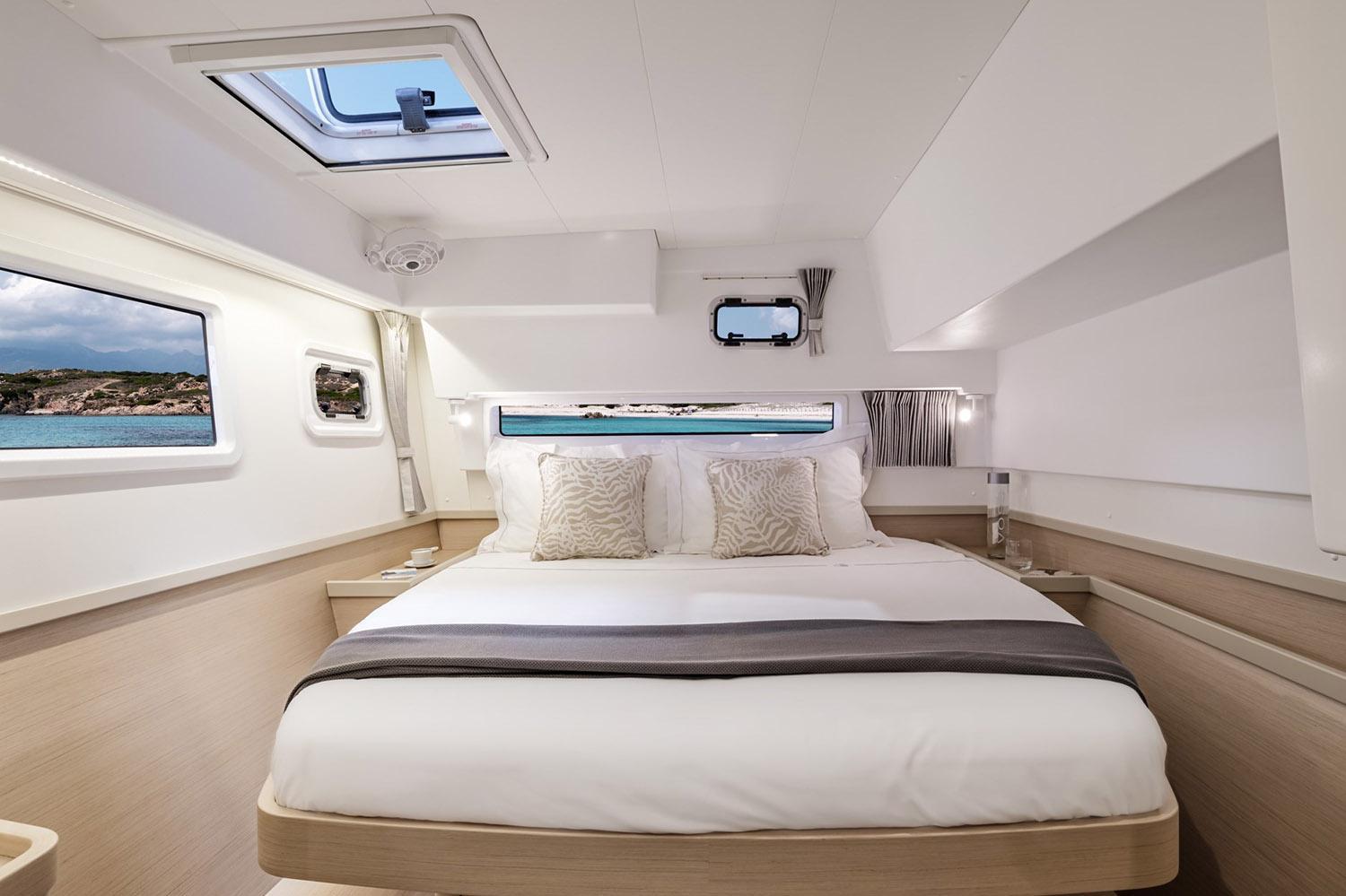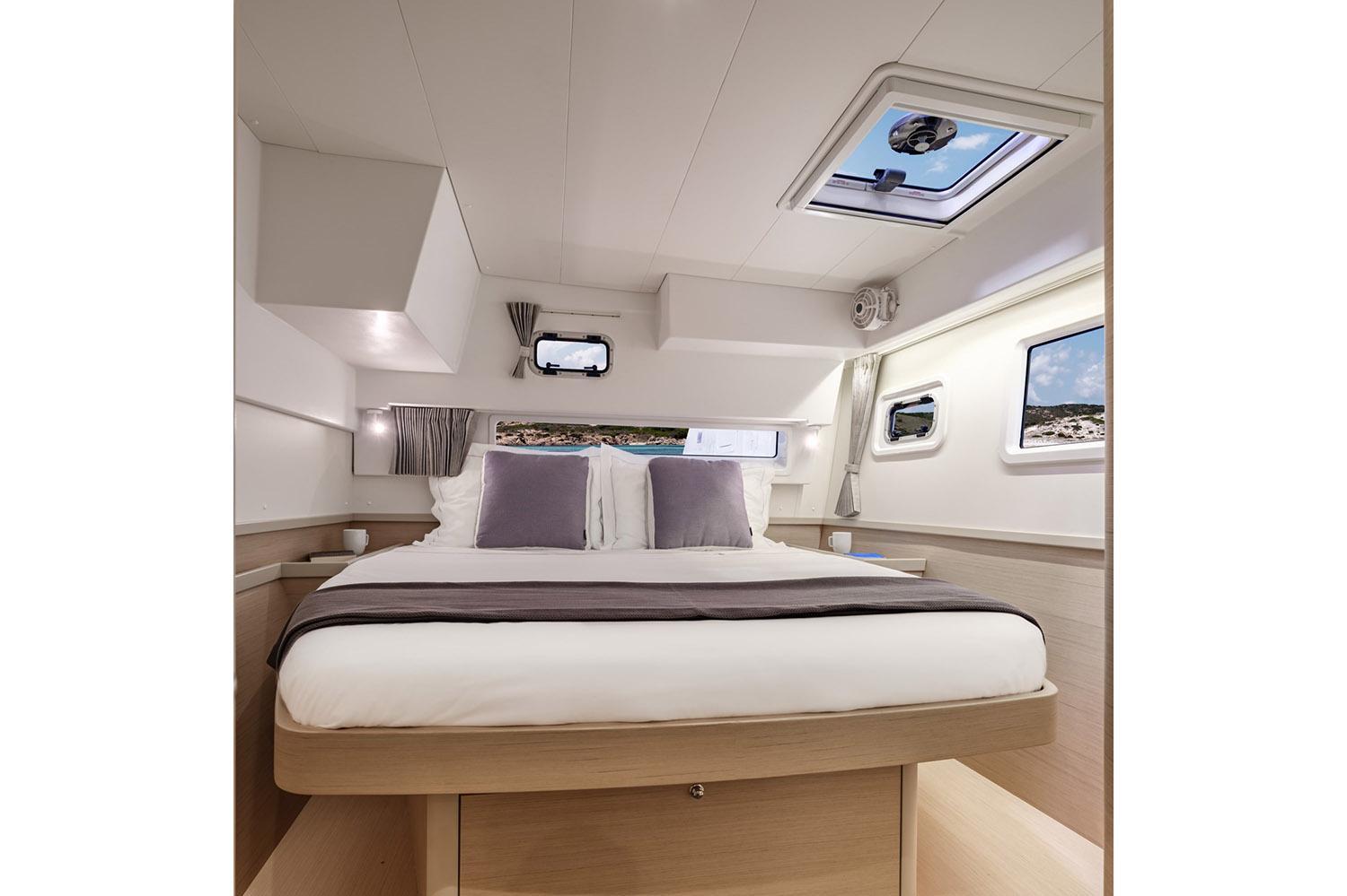 FACTORY OPTIONSBERTH IN PORT BOW COMPARTMENT ALPI SAND OAK STANDARD INTERIOR WOOD IN ALPI SAND OAK WITH DARK OAK FLOOR 3 CABIN VERSION Version 220 V 50 Hz 3-CABIN VERSION, 3 HEADS, 2 x 57 HP (Yanmar 4JH57) ESSENTIAL EQUIPMENT 3 CABIN ALPI SAND OAK STANDARD UPHOLSTERY DUNE (salon & settees) - 3-CABIN VERSION DARK GREY / GRAPHITE AMBIANCE AFT COCKPIT CUSHIONS (Color: Dark Grey) FORWARD COCKPIT SUNBEDS (Color: Dark Grey) SUNLOUNGING AREA CUSHIONS ON THE ROOF (Color: Dark Grey) SET OF REINFORCED STANDARD SAILS WITH LAZY BAG + COVER (Color: Graphite) COCKPIT FRIDGE 144L (not compatible with cockpit ice-maker) STANDARD ENGINES 2 x 57 HP (Yanmar 4JH57) LAUNCHED, RIGGED, ANTIFOULING, FENDERS, MOORING LINES, DIESEL, ANCHOR SET-UP