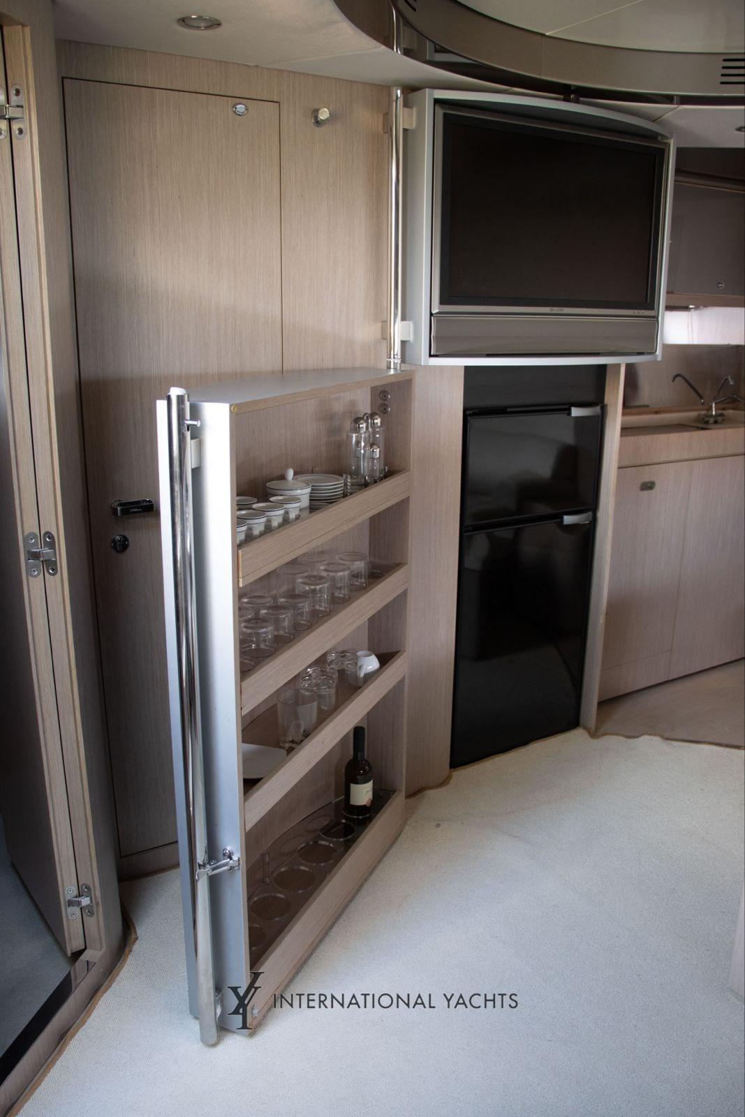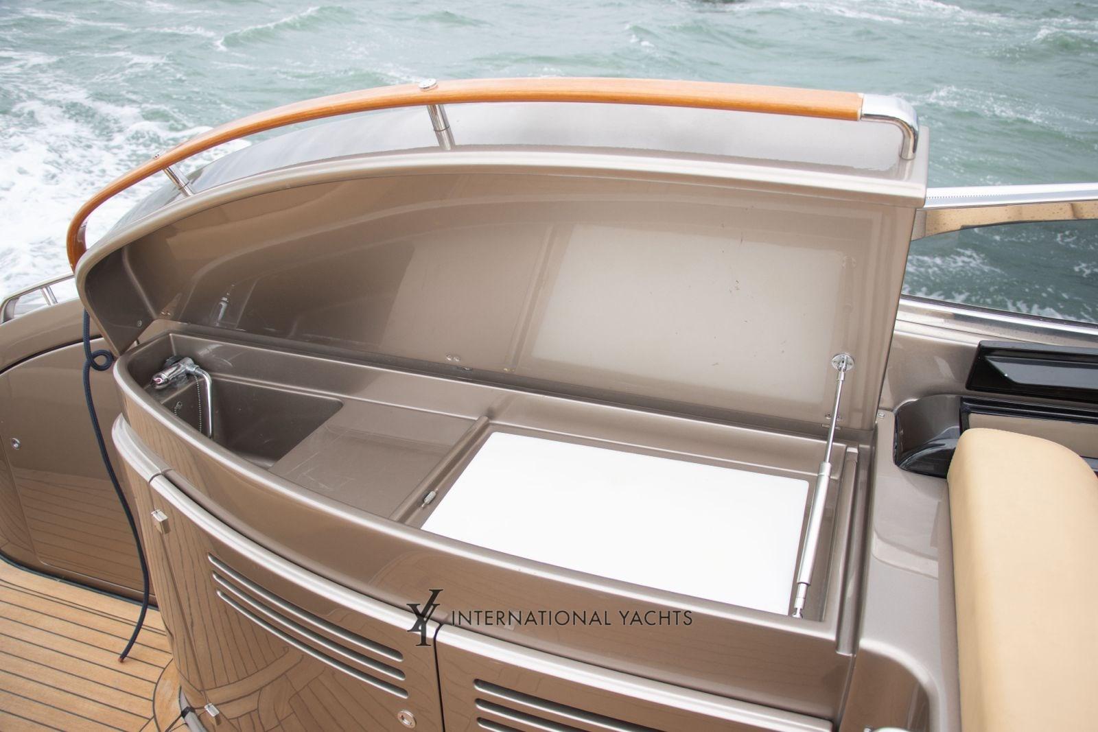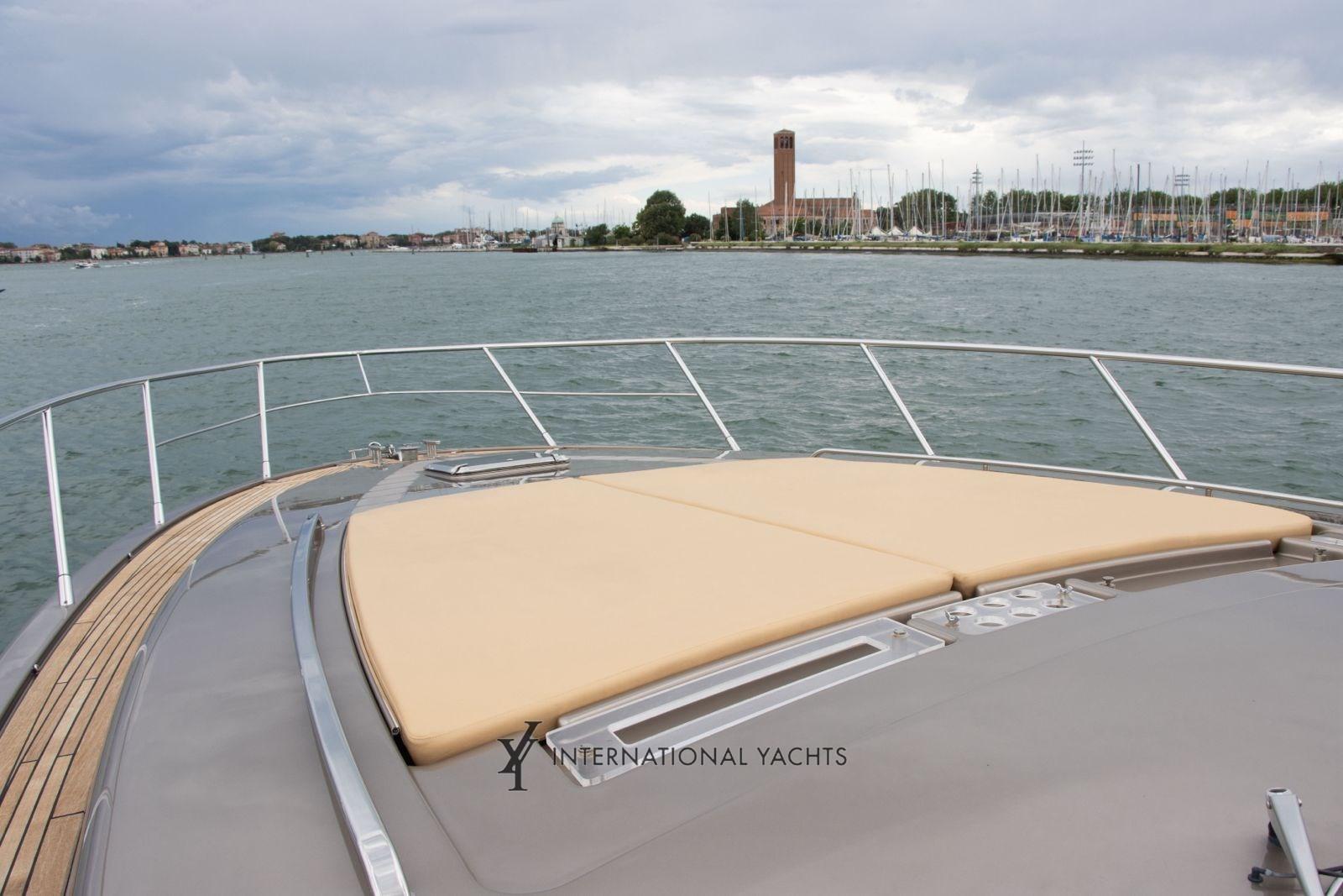 Engine Alarm, Bilge Alarm, Electric Engine Compartment Opening, Self-inflating, Teak Side Walkways, Special Coloring, Deck Shower, Stern Thruster, Bow Thruster, Hydraulic Flaps, Tender Garage, Fire Extinguishing System, Flaps Indicators, Courtesy Lights, Underwater Lights, Gangway (Retractable Hydraulics), Platform, Automatic Bilge Pump, Manual Bilge Pump, Teak Cockpit, 220V dock socket, Rectifier, Electric Windlass, Swimming ladder, Cockpit table, Folding saloon table, Trumpet, Winch, Electric Winch, Stern mooring winch, Bow mooring winch.