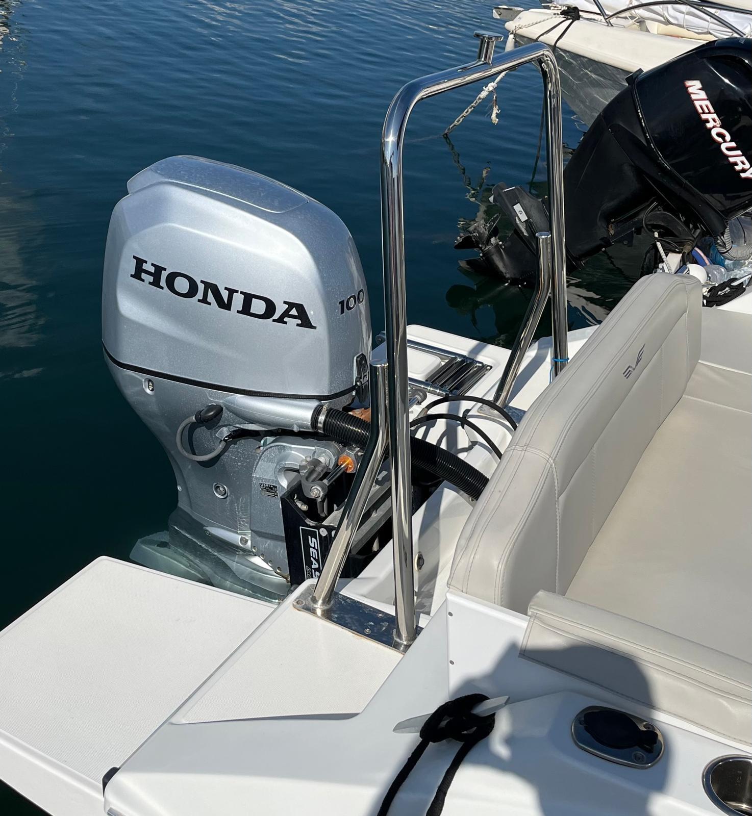 Braket, hydraulic steering, comfort equipment, aluminum t-top + bow cockpit seat extension, sundeck, rollbar, water ski, 2 rod holders, awning