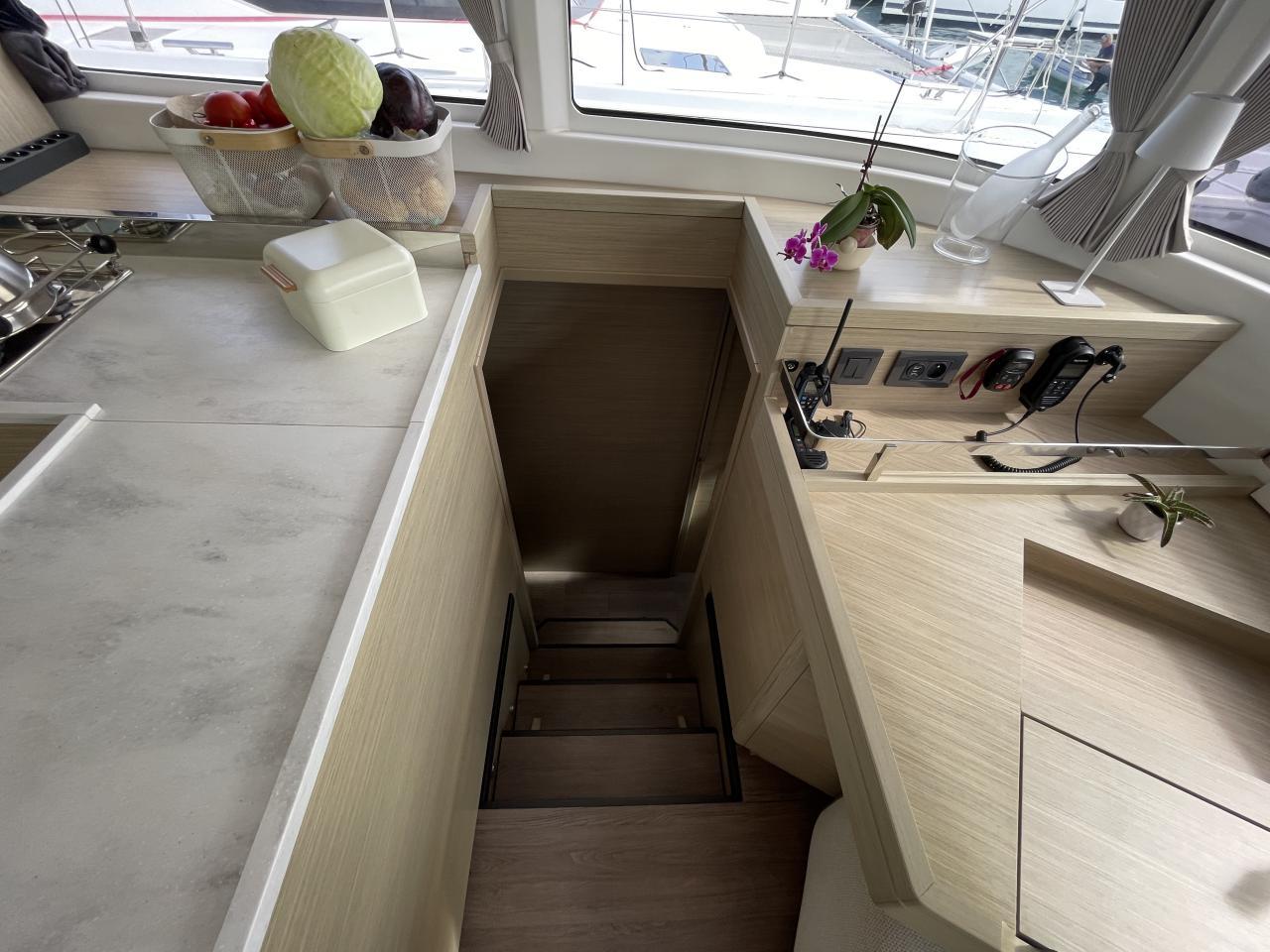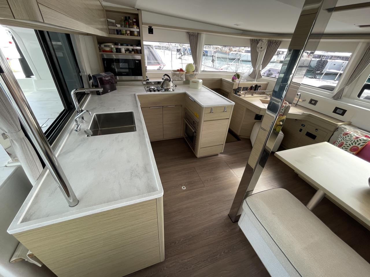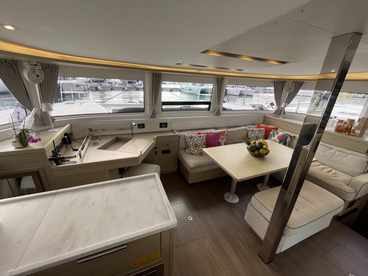 Spacious saloon with large table and L-shaped galley