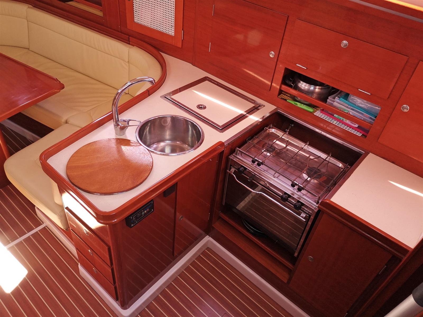 L-shaped galley complete with double stainless steel sink, 2-burner hob, oven and chest fridge