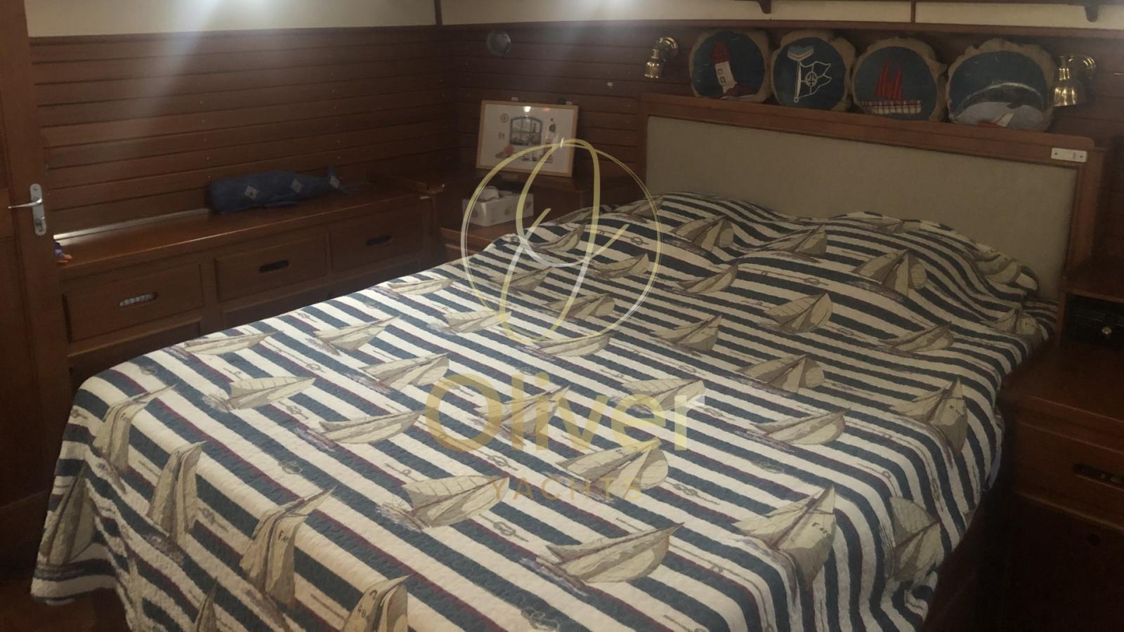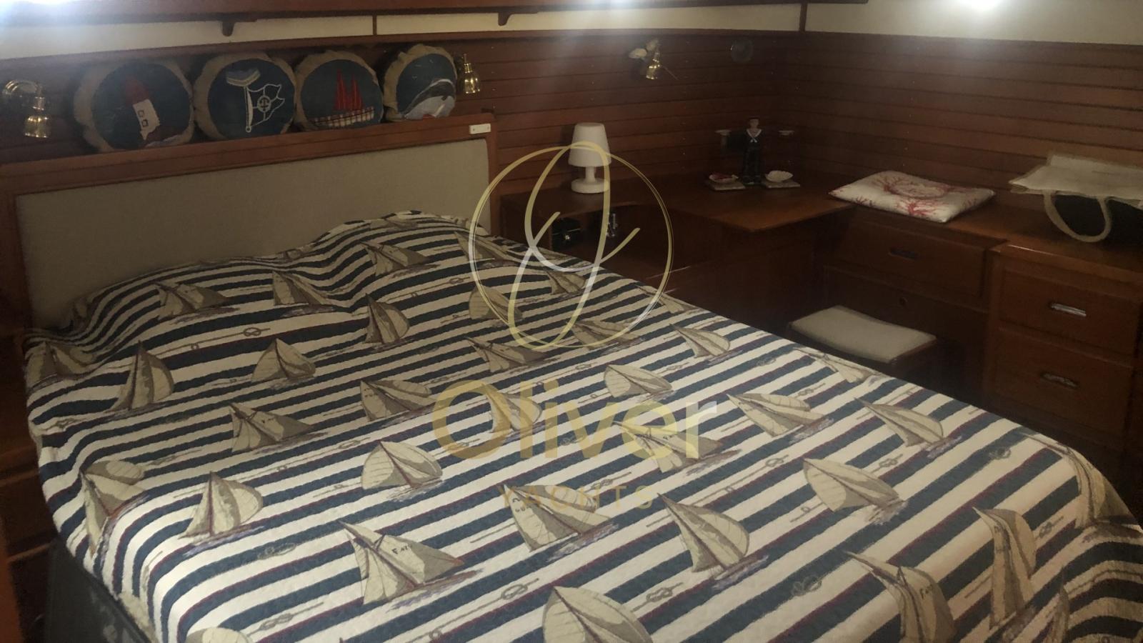 The interior layout is designed for comfortable and functional cruising, offering spacious cabins: an aft master cabin, with a double bed and large wardrobe, and a side guest cabin,