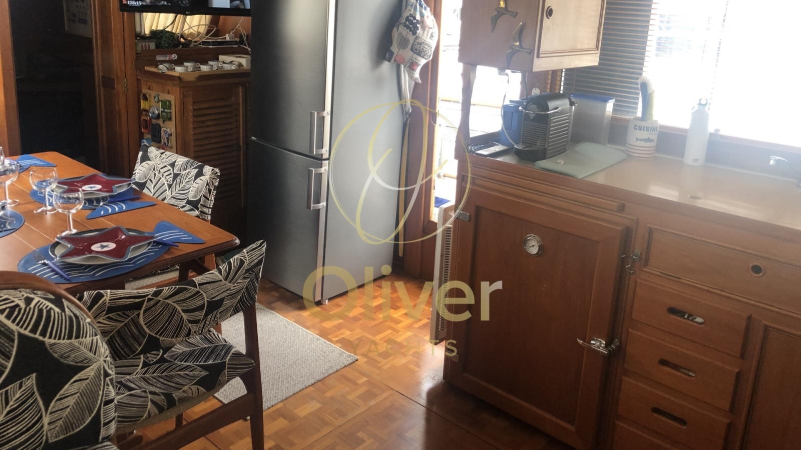The raised dinette, bright and well ventilated, houses a comfortable dining area with a folding wooden table and large windows that offer a panoramic view of the sea. Opposite is the kitchen, fully equipped with stove, oven, refrigerator and plenty of storage space.