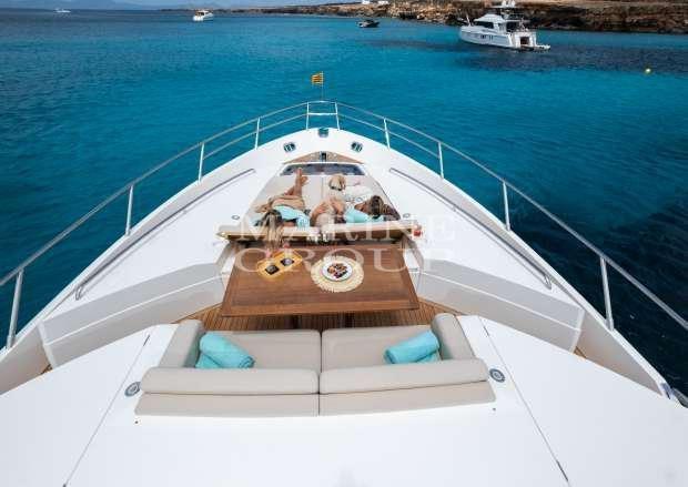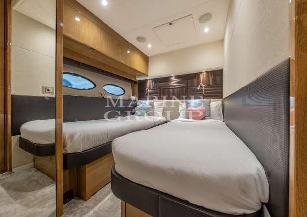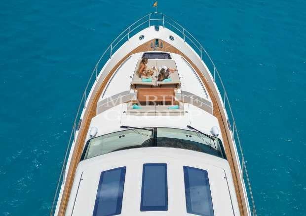 Renewed upholstery and new vinyl finishes for a modern and refined look; large living room with "U" shaped sofa; fully equipped kitchen complete with washing machine and dryer units; full-width master cabin with ensuite bathroom complete with shower cubicle and bidet; VIP cabin in the bow with double bed and private bathroom; double cabin with single beds on the floor and third full bathroom; Double crew cabin aft with separate bathroom.