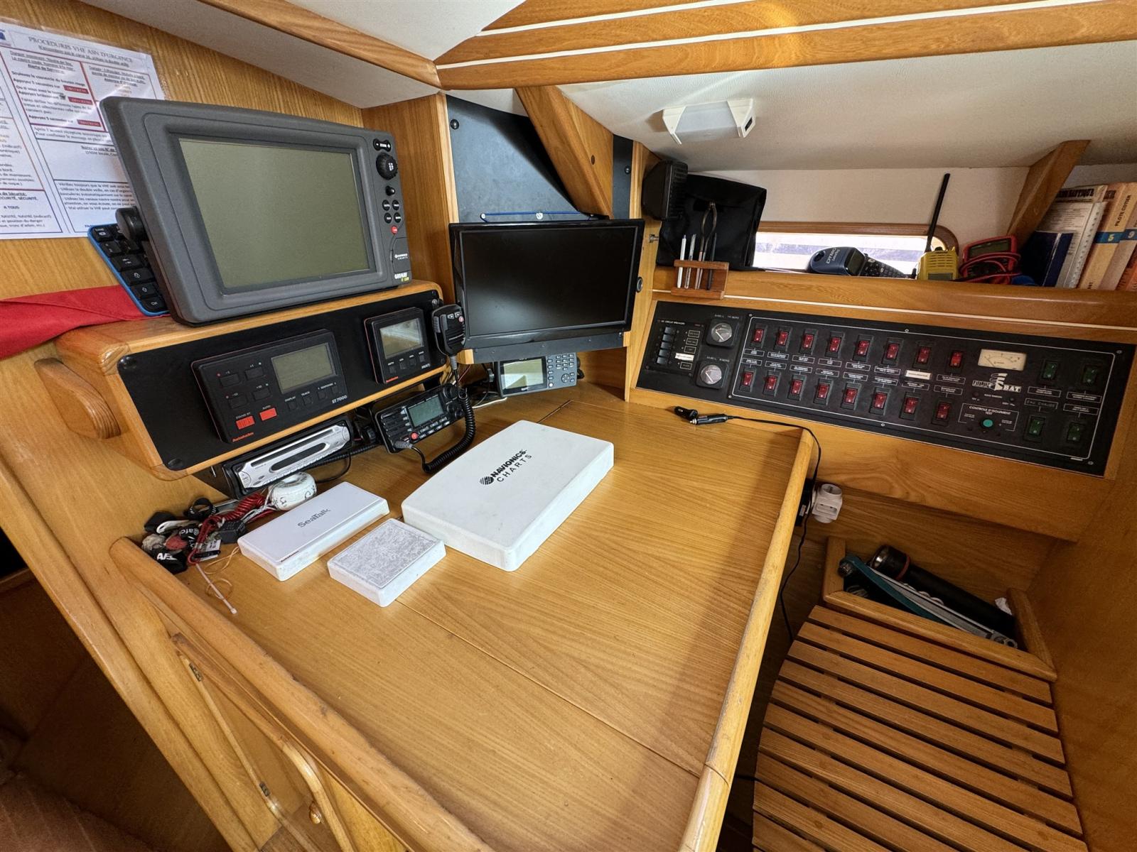 Compass (Plastimo), Chain counter, DSC vhf (AIS/GPS/DSC), Autopilot (Autohelm ST7000 cockpit), Plotter with GPS antenna (Geonav 11), VHF Radio (portable - 2020), Sonar, Wind Station (Raymarine - 2019), Satellite Phone (Iridium Go - 2021).