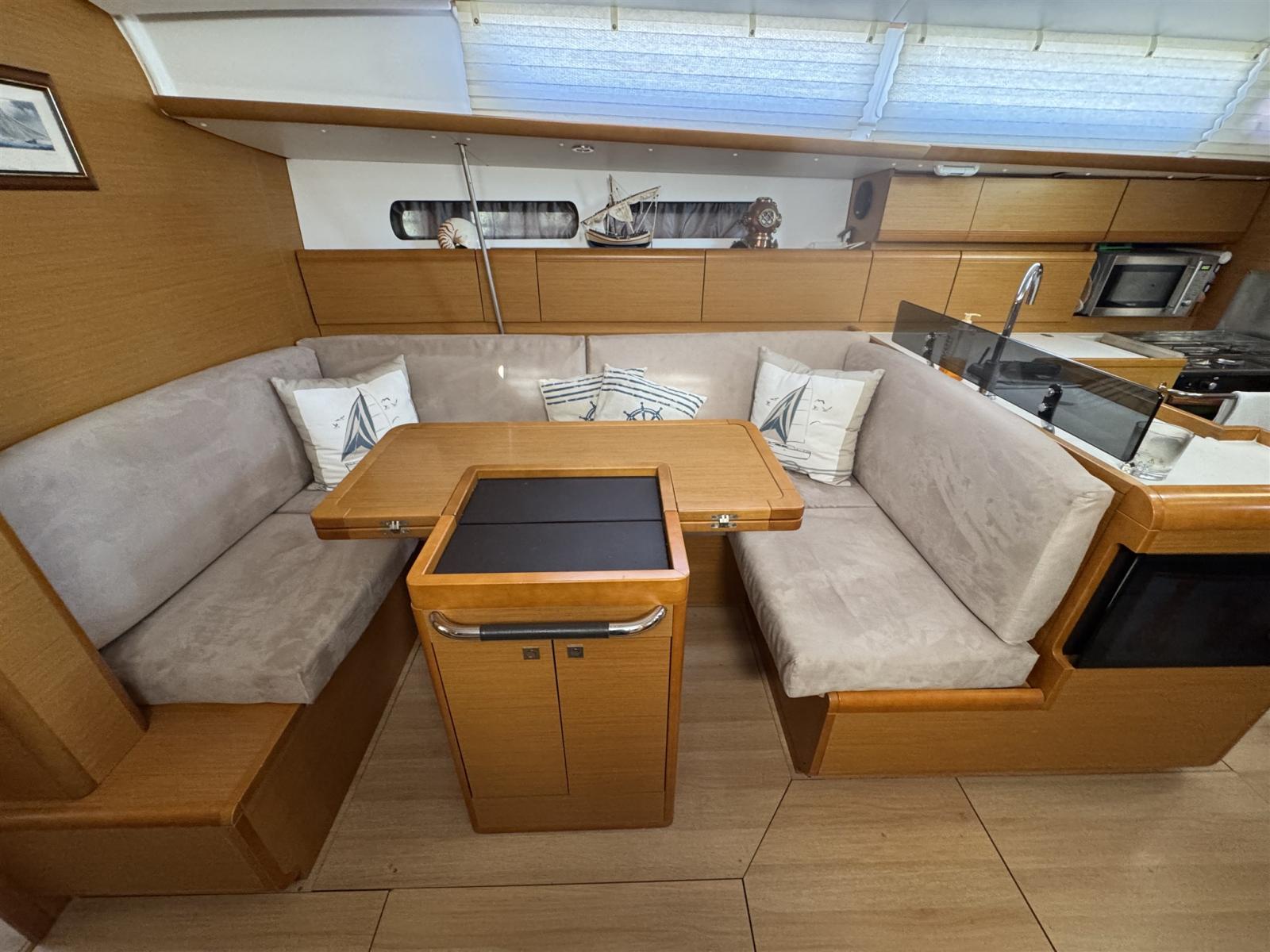 4 Batteries (3 xService 1x moteur), Deck Shower, Twin Steering (avec housses), Bow Thruster (2020), Courtesy Lights, Underwater lights, Auxiliary Engine (Suzuki 2T 2,2CV), Solar panels (sur bimini), Platform, Manual Bilge Pump, Teak Cockpit, Electric Windlass (chaine 50m), Strand rigging (1x19), cockpit table, Tender, Teak Deckhouse.