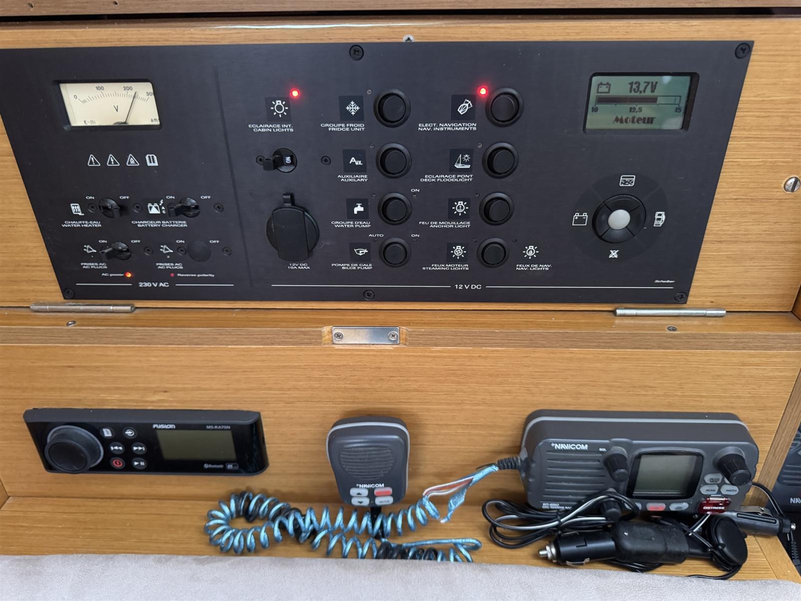Chain counter, Odometer (Raymarine), GPS (Garmin 922 XSV - 2021), Autopilot (Raymarine), Plotter with GPS antenna (Garmin 922 XSV - 2021), Sonar (Garmin 922 XSV - 2021), Wind Station (Raymarine).