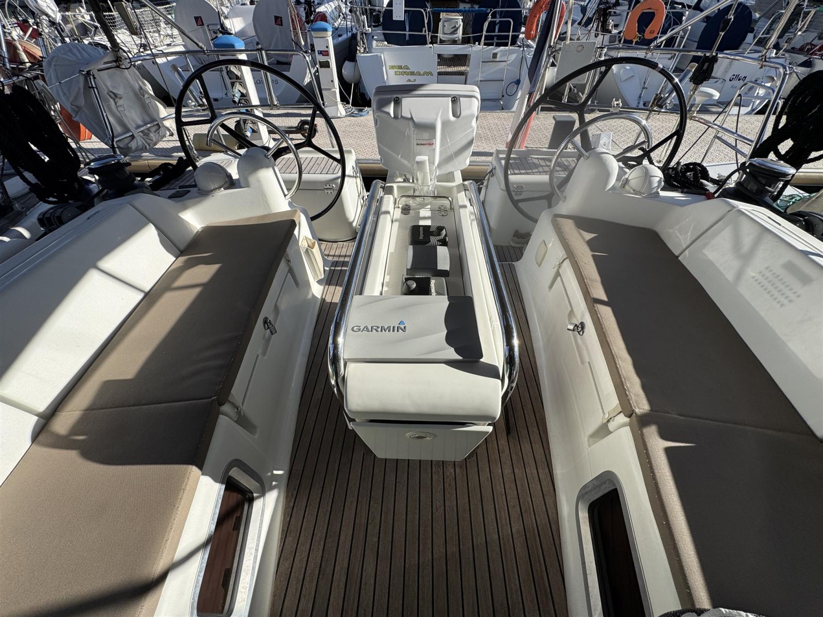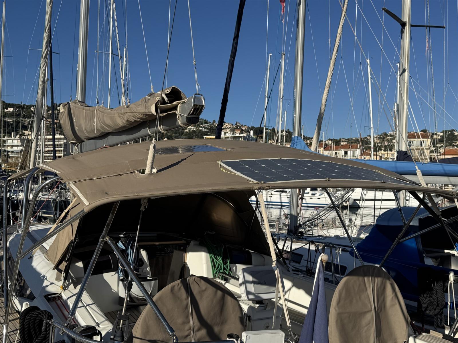 Bow thruster, teak deck and cockpit, double steering wheel, electric winch, solar panel on bimini...
