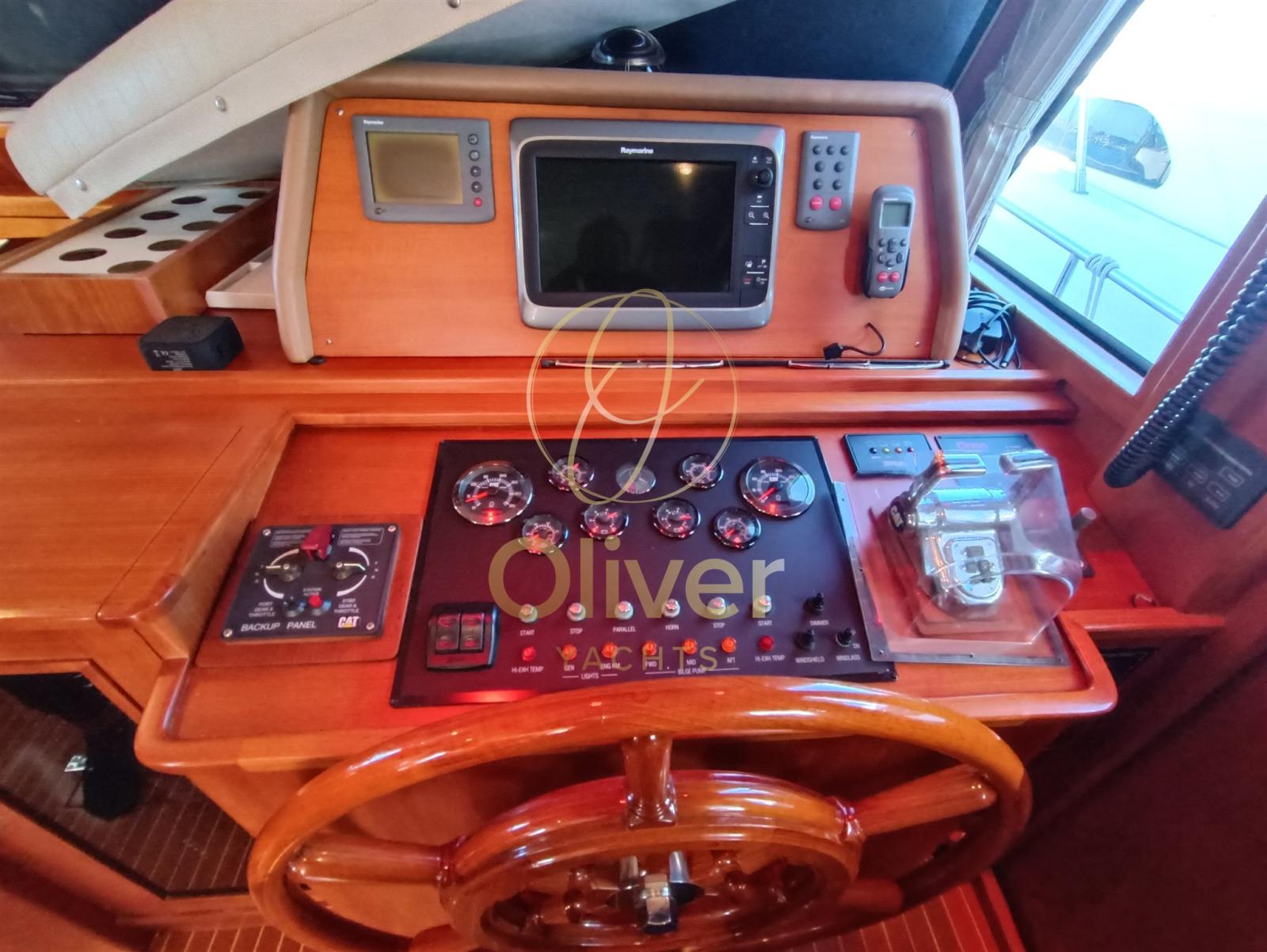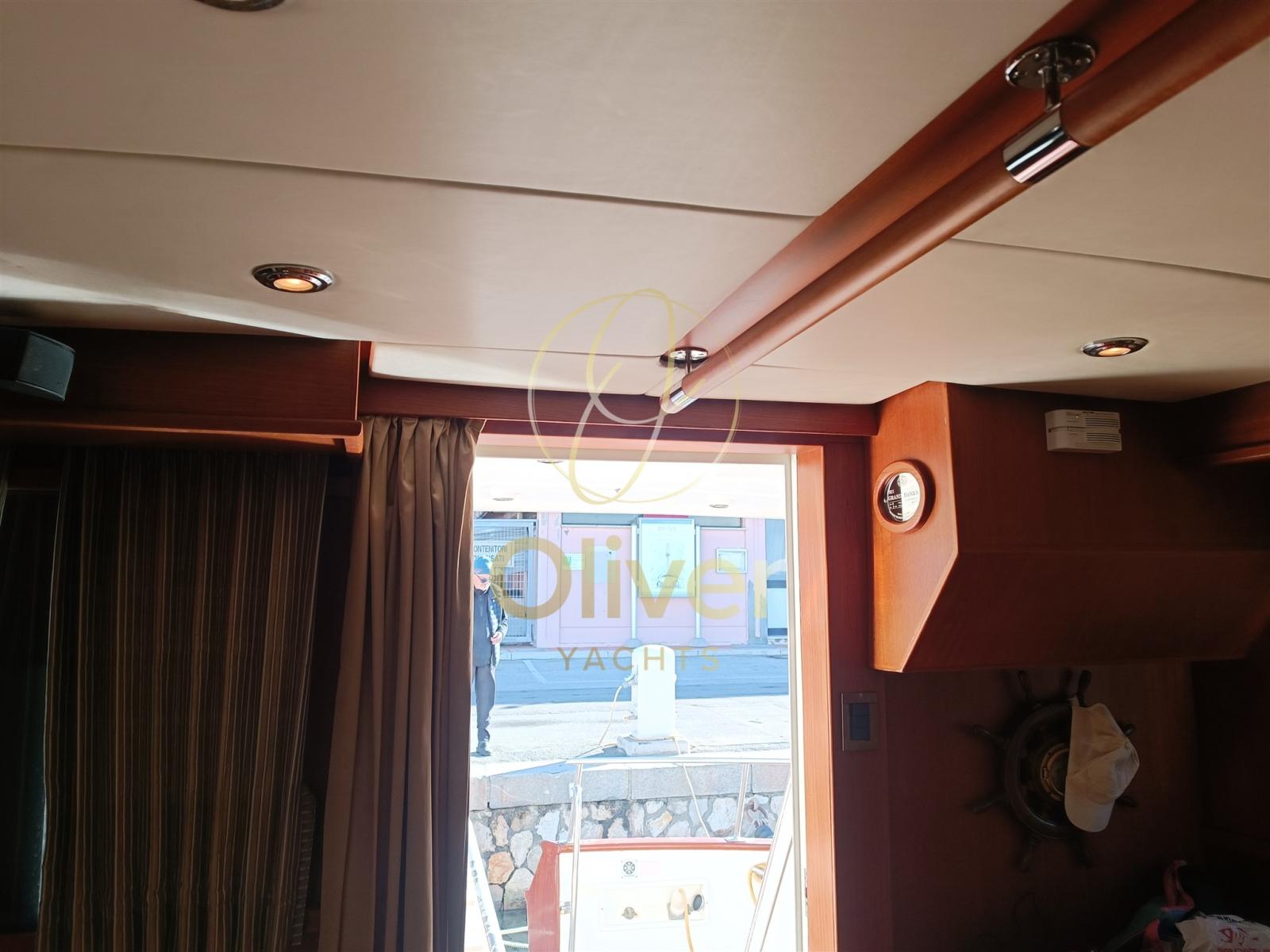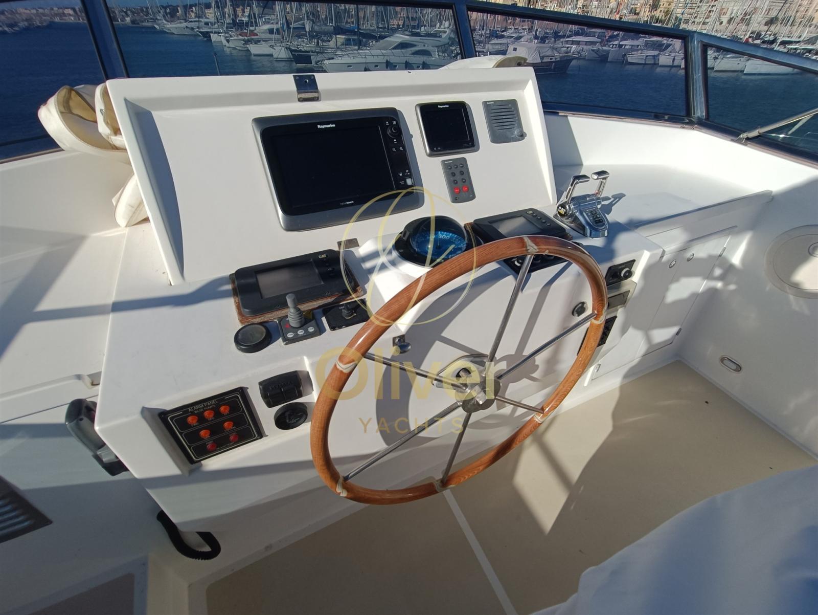Engine Alarm, Bilge Alarm, Water pressure pump, Deck Shower, Twin Steering, Directional Spotlight, Hydraulic Flaps, Davits for tender on fly, Flaps Indicators, Courtesy Lights, Gangway, Automatic Bilge Pump, Teak Cockpit, Shorepower connector, Electric Windlass, swimming ladder, cockpit table, Horn, Stern Winches.