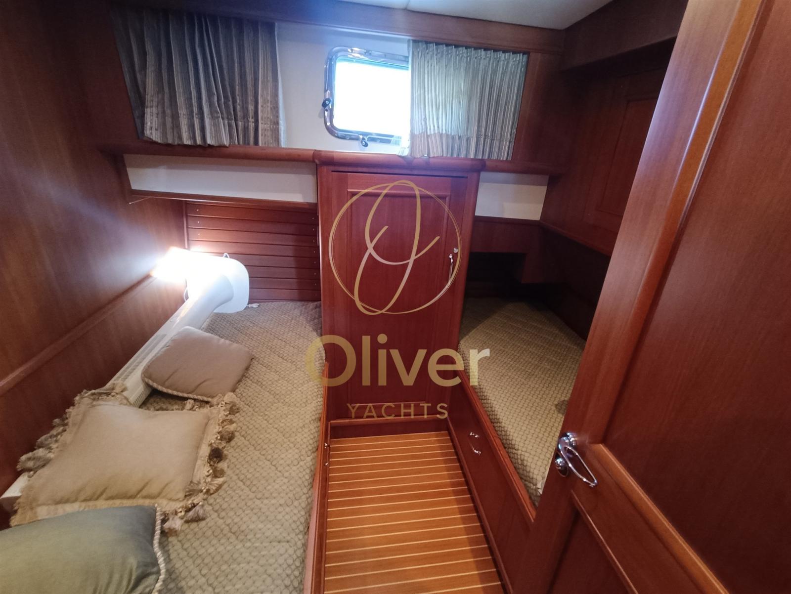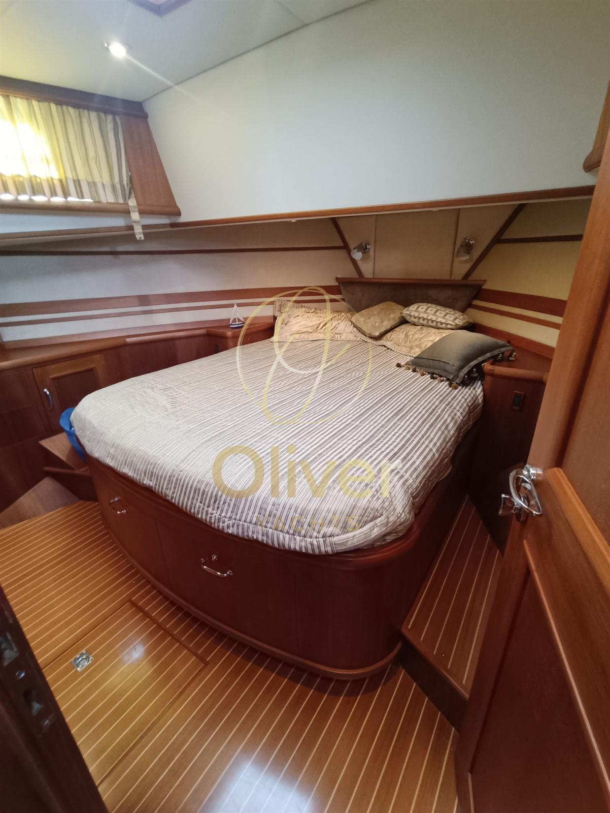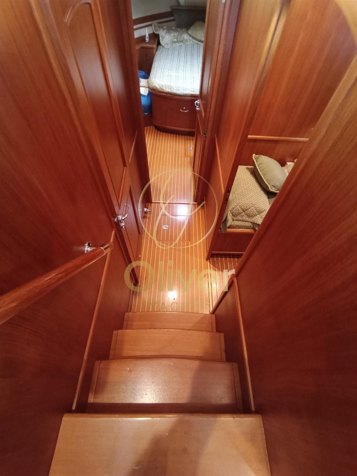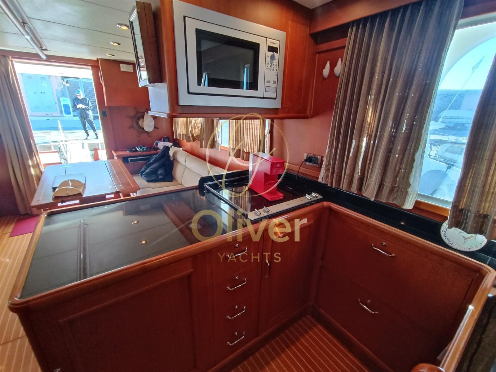 Engine Alarm, Bilge Alarm, Water pressure pump, Deck Shower, Twin Steering, Directional Spotlight, Hydraulic Flaps, Davits for tender on fly, Flaps Indicators, Courtesy Lights, Gangway, Automatic Bilge Pump, Teak Cockpit, Shorepower connector, Electric Windlass, swimming ladder, cockpit table, Horn, Stern Winches.