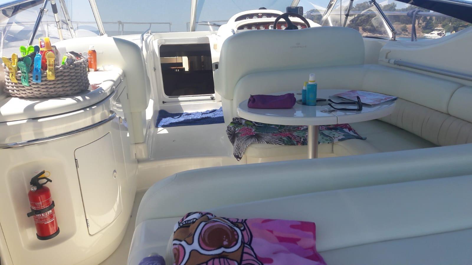Engine Alarm, Bilge Alarm, Anchor (+ 50 Metri di catena), Water pressure pump, Batteries (Motori, Servizi, Generatore), Deck Shower, 2 Hydraulic Flaps, Tender Garage (Con apertura idraulica), Fire Extinguishing System (Manuale), 2 Flaps Indicators, Washbasin in the cockpit, Courtesy Lights, Underwater lights, Platform, Automatic Bilge Pump, Entry door (Al pozzetto), Shorepower connector, Water harbor connector system, Rollbar, Electric Windlass, swimming ladder, cockpit table, Tender (Con motore FB), Bow Winches (Verricello Quick).