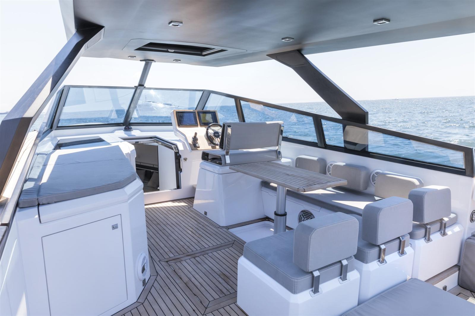 Engine Alarm, Bilge Alarm, Electric Engine Compartment Opening, Water pressure pump, Auto-Trim (Auto dynamic trim interceptor), Folding cleats, Teak Side Decks, Deck Shower, Hydraulic Flaps, Fire Extinguishing System, Flaps Indicators, Washbasin in the cockpit, Courtesy Lights, Underwater lights, Platform (Trasformer di poppa + estensione murate), Automatic Bilge Pump, Entry door, Teak Cockpit, Shorepower connector, Water harbor connector system, Hydraulic Windlass, swimming ladder, cockpit table (a scomparsa), Living Room Foldable Table, Horn, T-Top (con estensione elettrica).
