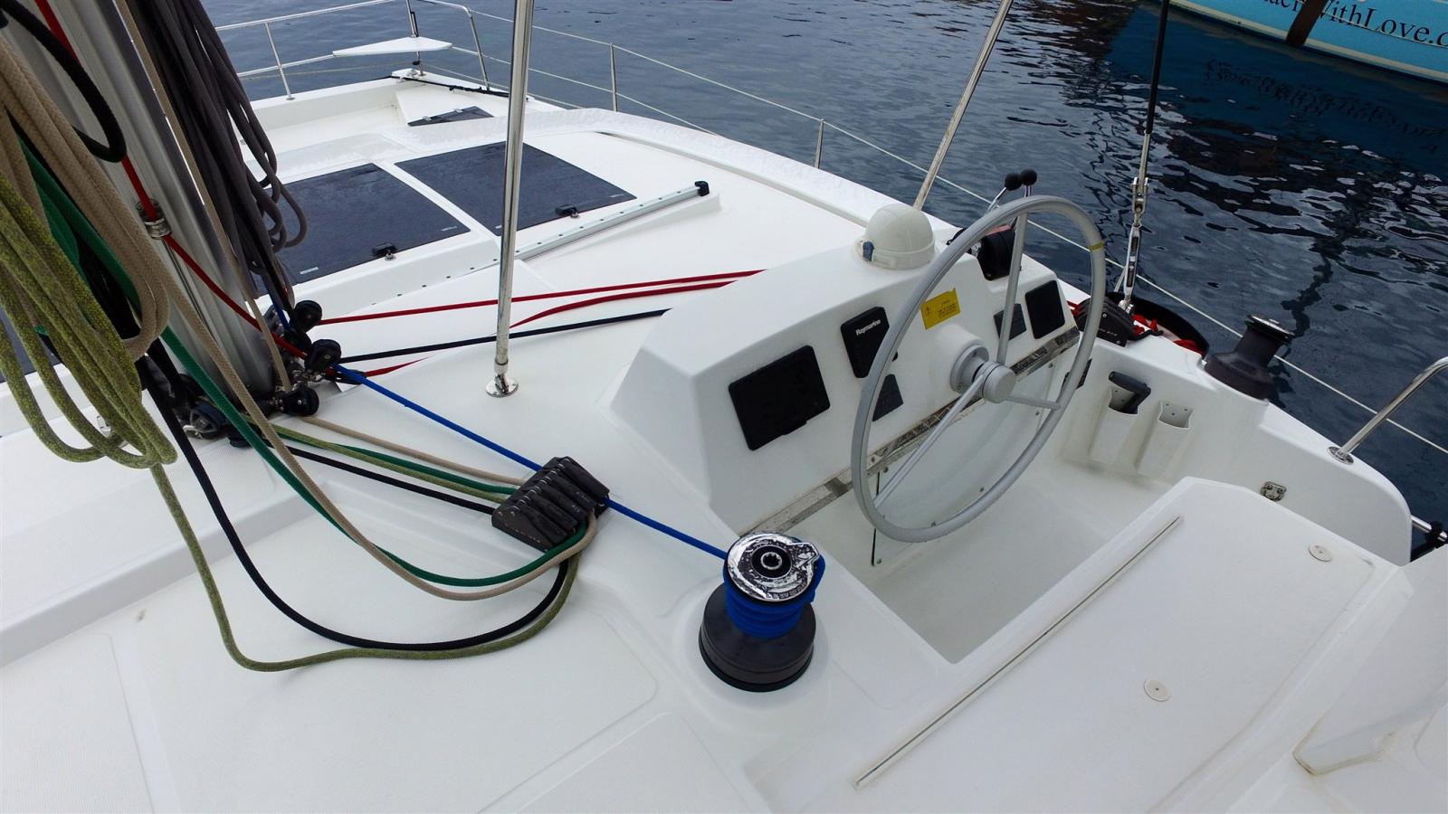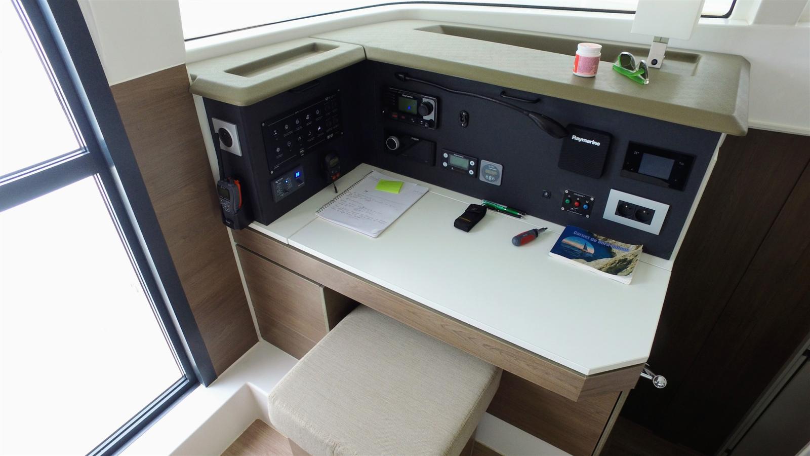 AIS, Rudder angle indicator, Radar Antenna, Chain counter (Quick), DSC vhf (Ray 63), Autopilot (Raymarine P70S), Plotter with GPS antenna (Raymarine AXIOM 7 , Multi I70S), Radar (Quantum 2), VHF Radio (Portable Cobra), Co-pilot seat, Sonar.