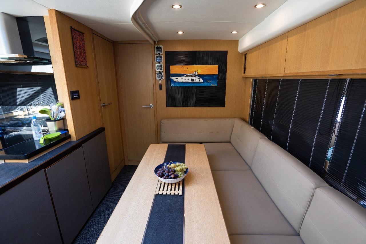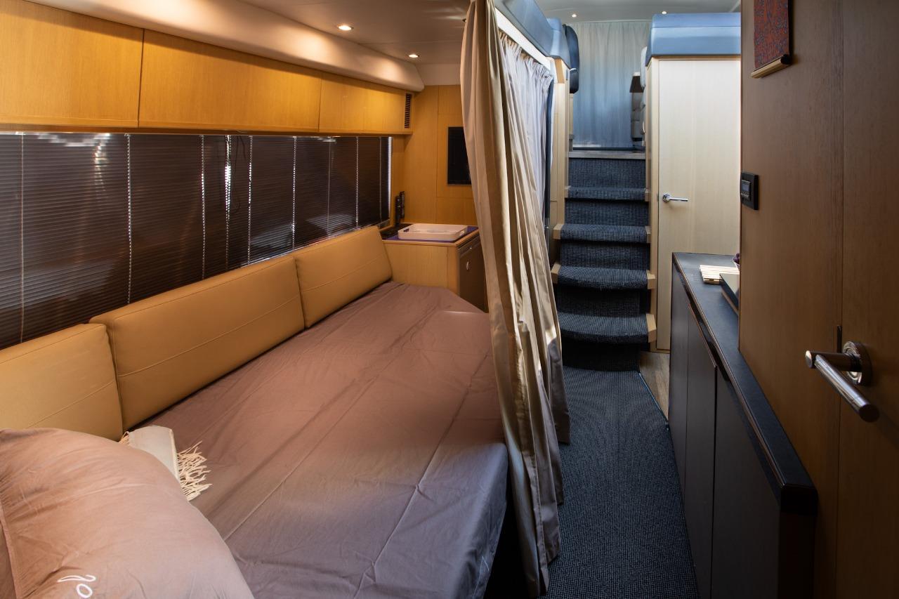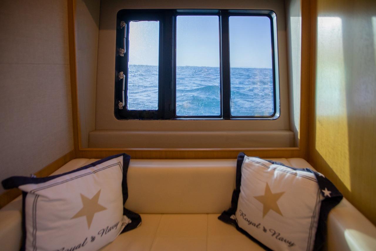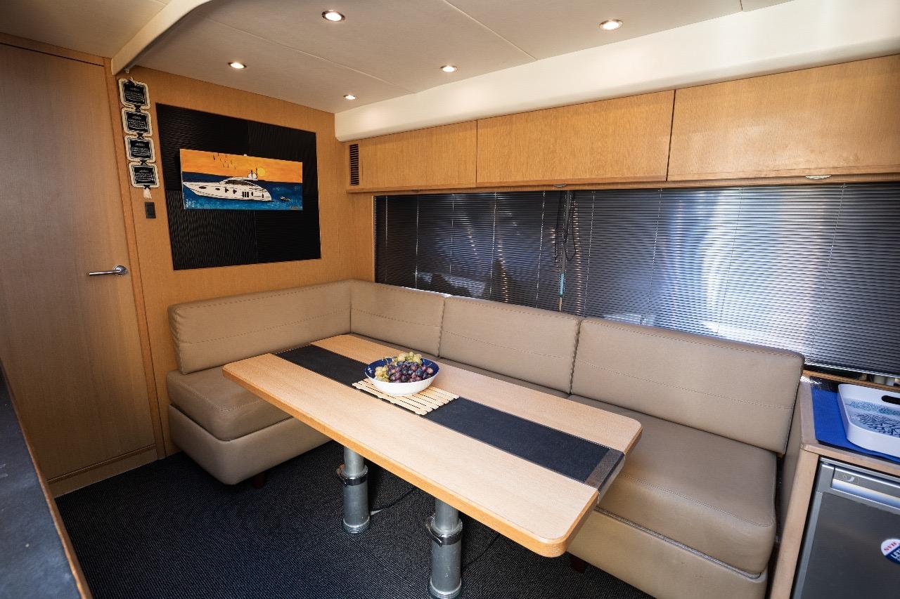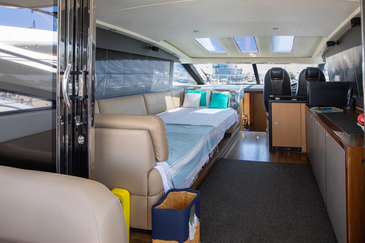 One of the great assets of this model is its fully enclosed deck saloon, which allows for a larger interior space while retaining the feel of a sporty yacht. The sliding glass doors and electric sunroof offer great versatility: full access to the outdoors or comfortable protection, depending on the weather and your preferences.