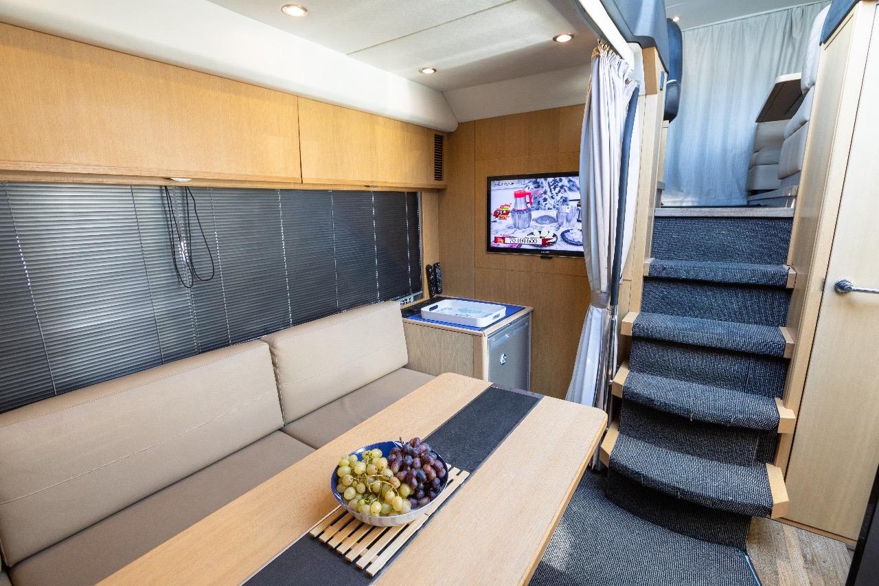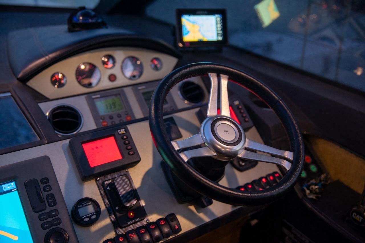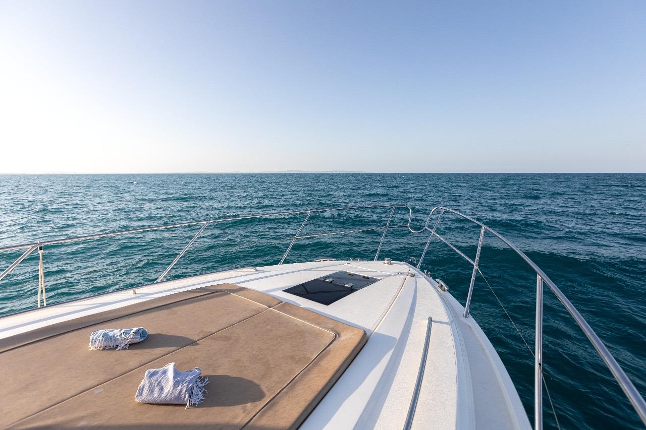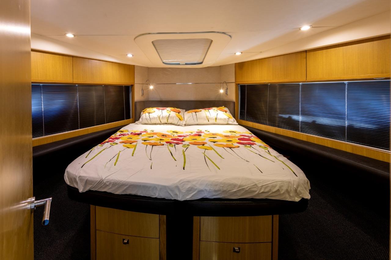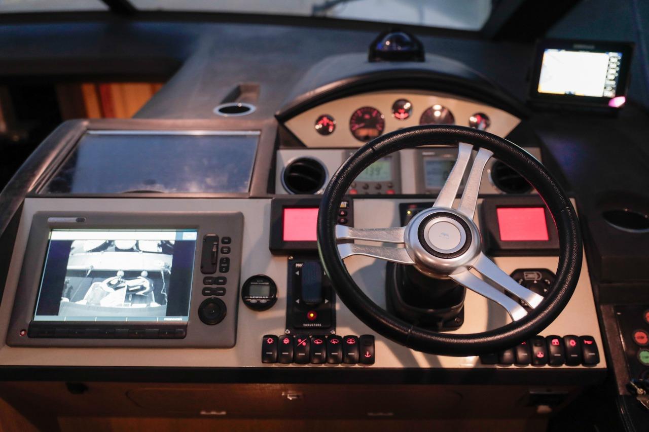 One of the great assets of this model is its fully enclosed deck saloon, which allows for a larger interior space while retaining the feel of a sporty yacht. The sliding glass doors and electric sunroof offer great versatility: full access to the outdoors or comfortable protection, depending on the weather and your preferences.
