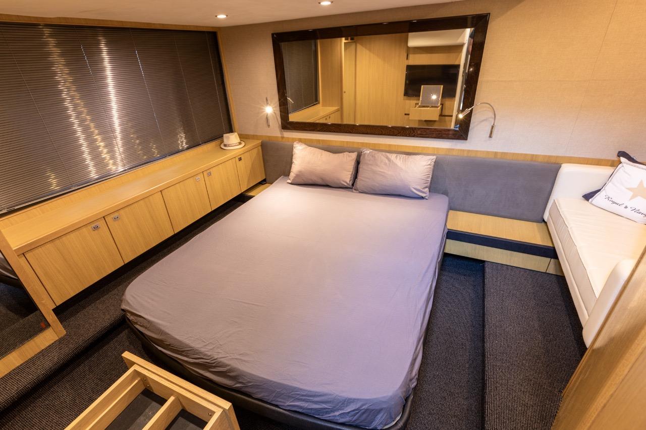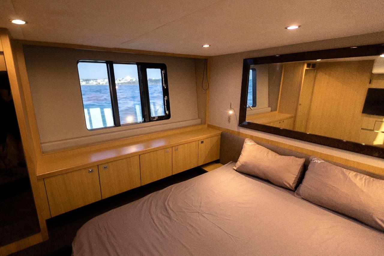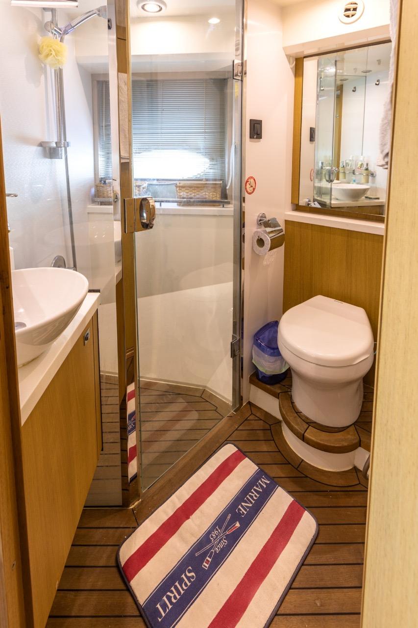 The sleeping area offers comfort worthy of much larger yachts, including a spacious, full-beam master cabin, bathed in light thanks to large side windows, and featuring an en-suite bathroom. The forward VIP cabin also benefits from its own bathroom with a separate shower. Also features a crew cabin.