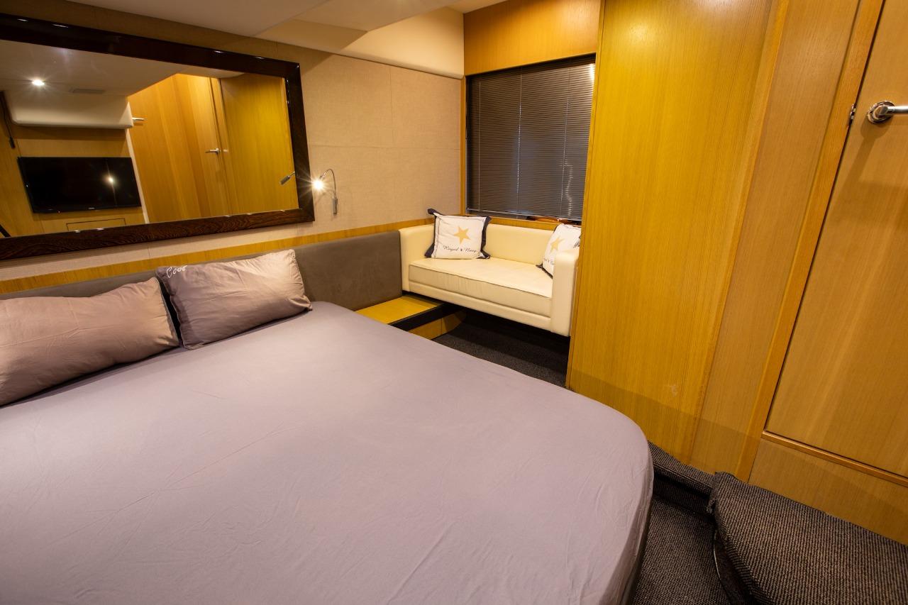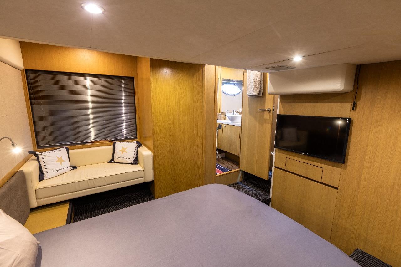 Inside, the Princess expertise is evident, with luxurious finishes, elegant woodwork, and a warm atmosphere. The lower saloon, located opposite the fully equipped galley, can be used as a relaxation area or converted to accommodate occasional guests.