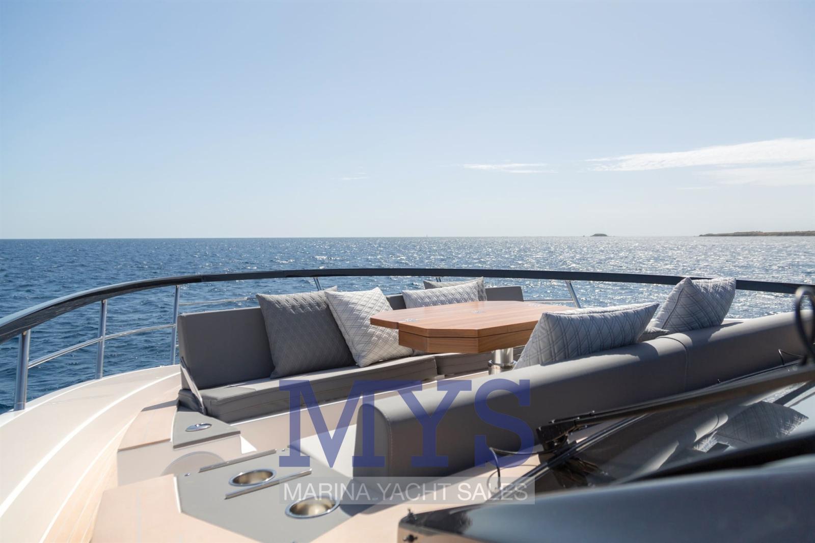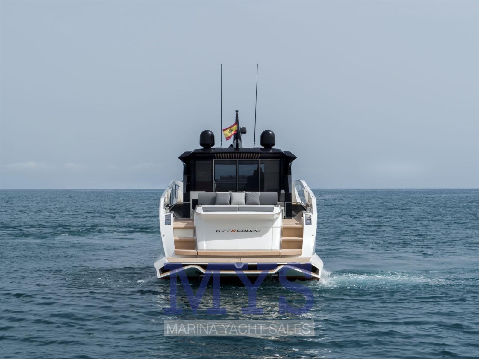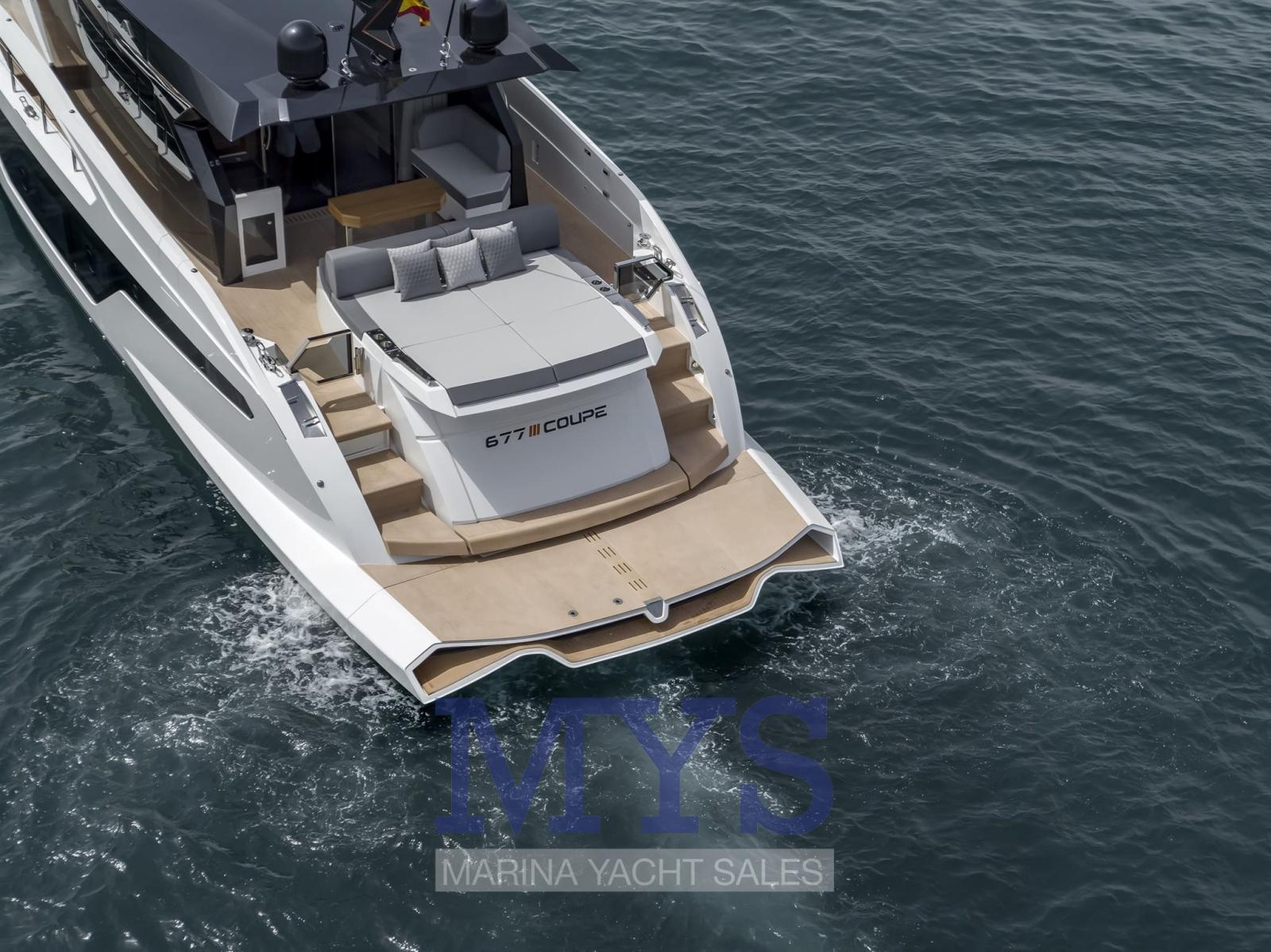 The 677 Coupé defies the standards of its segment, with its 18.94 meters in length, and stands out for its clean and sporty lines that flow throughout the boat, creating a striking and provocative profile. Its inverted bow, a typical feature of the Coupé range, together with its large glass surfaces, blend with the lines of the boat, creating a unique silhouette that will capture the hearts of sports sailing lovers who do not want to give up luxury on board. These large windows stand out not only for their beauty, but also for the integration of the sea into life on board and, together with the retractable roof, will make the sailing experience on the 677 Coupé truly unique.