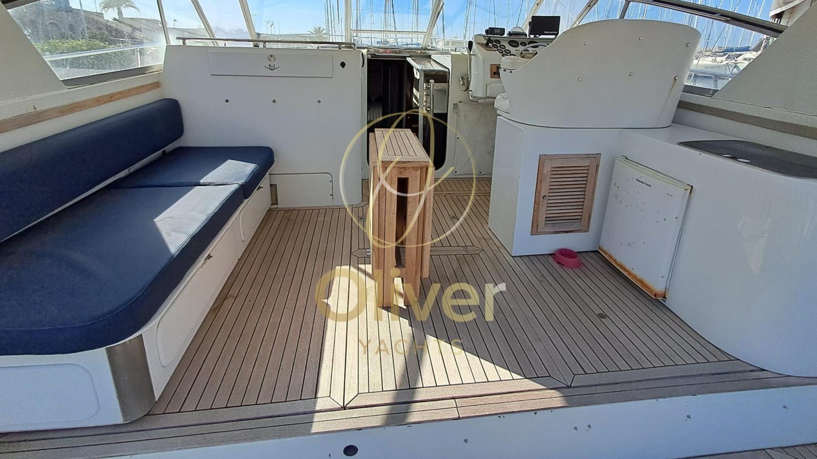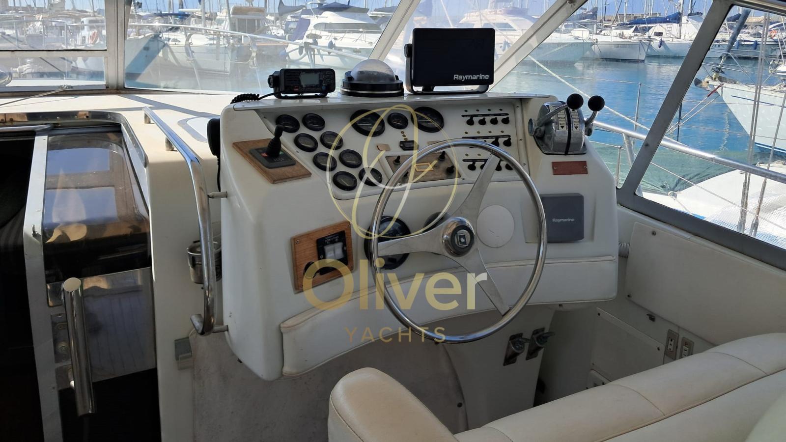 The cockpit is large, covered in teak, and equipped with comfortable padded seats, storage lockers, an oversized stern platform with integrated gangway. The bridge is protected by a canvas windshield and awning, with double seats and good visibility. The controls are dual, with Raymarine instrumentation.