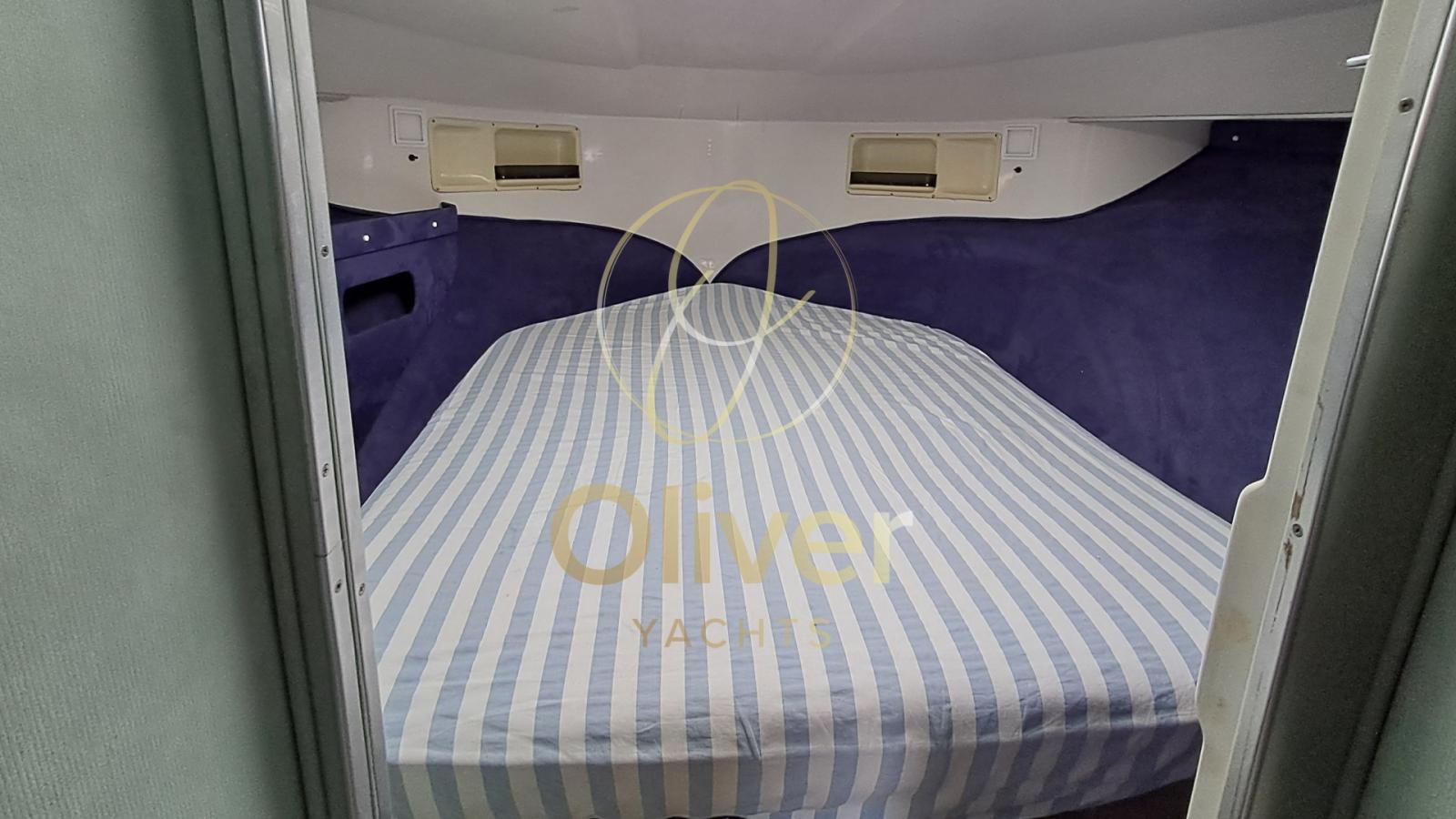 In the bow is the owner's cabin with a V-shaped double bed, side windows and lockers. The walls are covered in fabric and the area is well lit by natural light. The bathroom, located amidships, is equipped with a marine toilet, sink and shower. The electrical system is accessible and well organized in the upper part of the dinette.