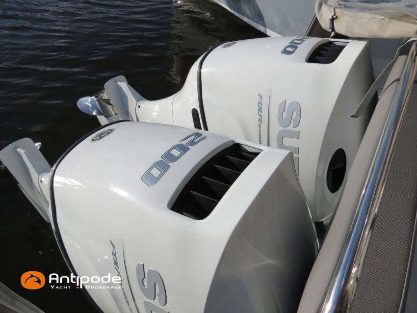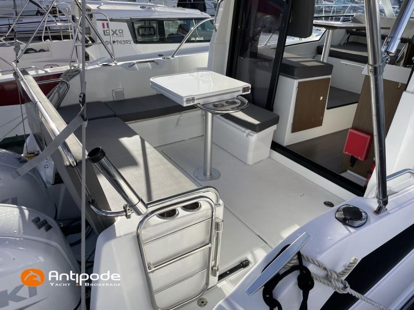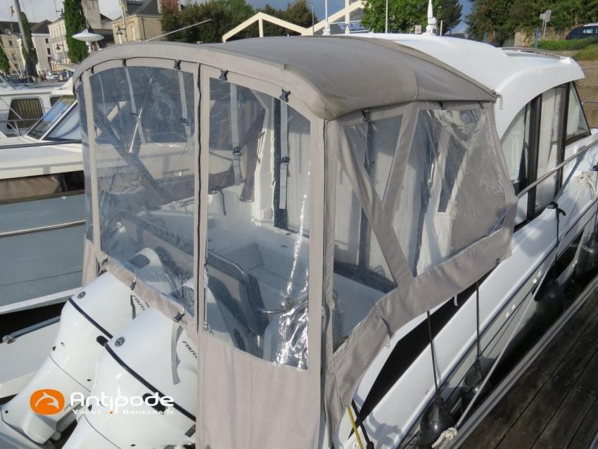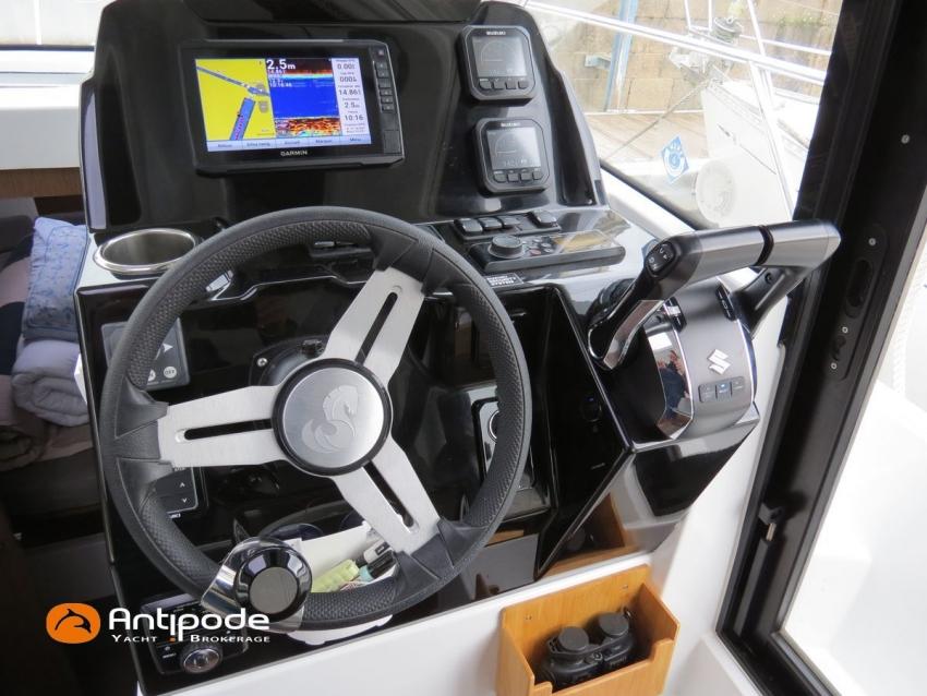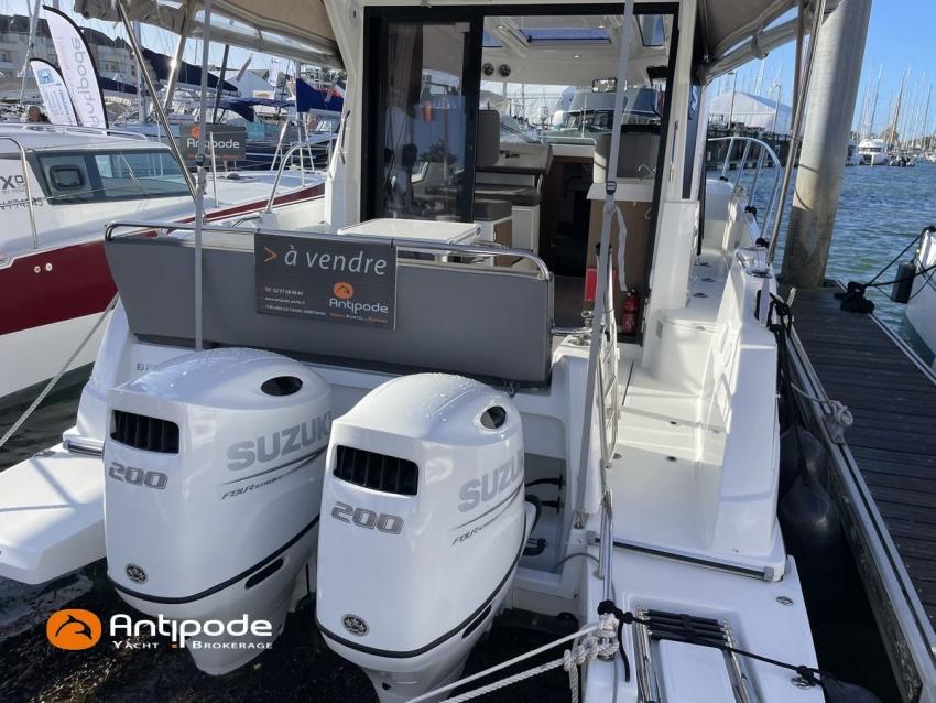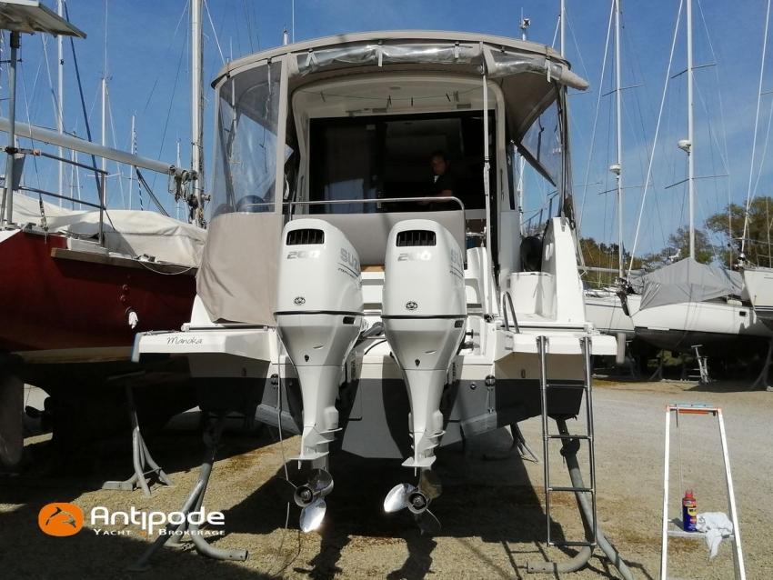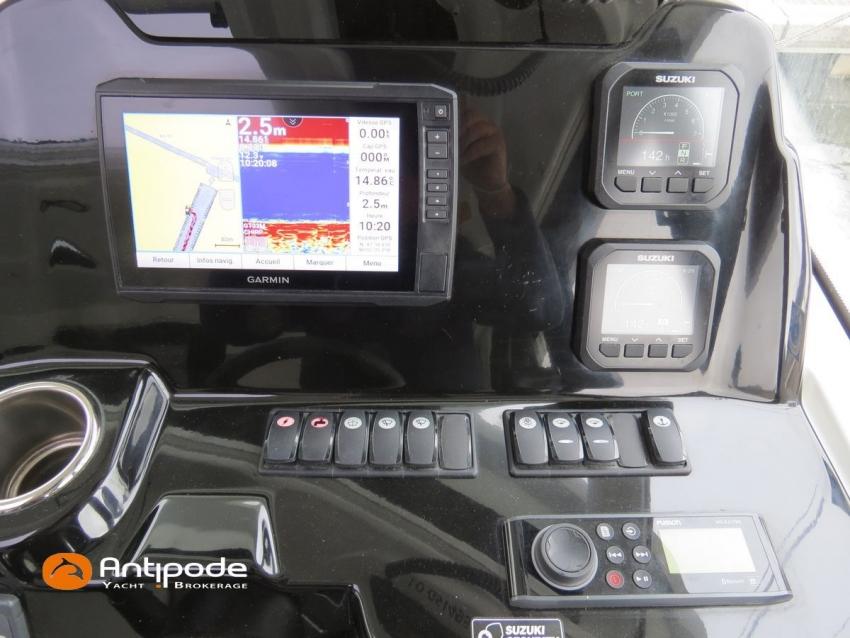 Antares 9 OB, 2022, first hand, Suzuki DF200 APX blanc (x2), 2 x 200 hp (192 hrs), Bow thruster, Elegance layout, Comfort layout, Laminated floorboards, Upholstery : Silvertex sterling & Diamante meteor , Opening port window, Interior curtains, Mosquito screen for opening roof hatches, Original cockpit table (wood) & custom table, Cockpit convertible onto sun bath, Cockpit bimini top, Cockpit cushions, Electric windlass with remote control, Wheelhouse electric windlass remote control, Full cockpit enclosure, Garmin 9 inches GPS and chartplotter, Garmin GT21 - TH depth sensor, Electronic navigation charts, DSC AIS VHF - Garmin 215 i, Fusion audio system - MS-RA70N, Dynamic trim control - Zipwake, Second electrical wiper , Fridge unit 12 V - 60 liters (front opening door), Water heater 220 V (25 liters), Hot and cold pressurized water, 2 burners cooker, 220 V shore power + battery charger - Cristec 25A + 25m lenght cable, AGM service batteries - 2 x 130A, Interior USB & 220 sockets, Battery controller - Victron BMV 702, Holding tank, Extra gauge for holding tank & fresh water, Leds interior lights, 4 men liferaft, 4 men coastal safety equipments, Fob 14 kg anchor + 35m of chain + 40m of rope, Fenders and warps, Located Brittany. For more information or to make an appointment for a visit, contact : Jean-Baptiste Lemaire +33 6 10 25 00 03 - jb@antipode-yachts.com