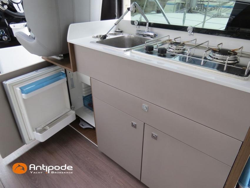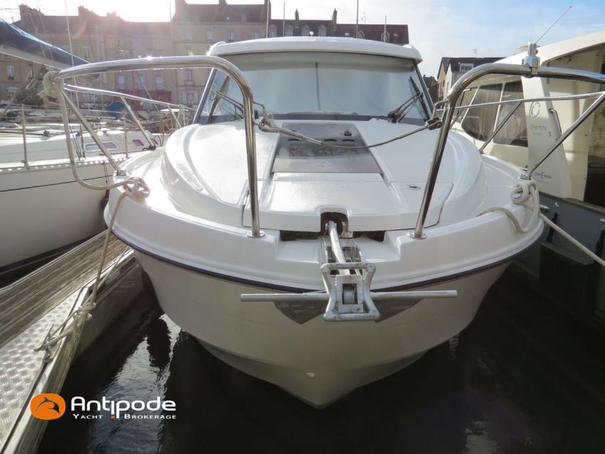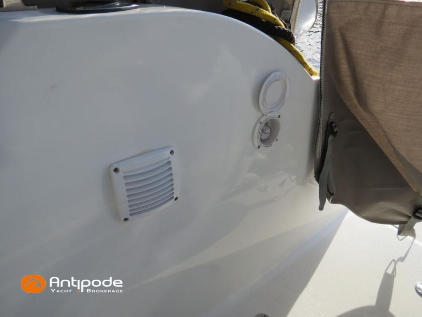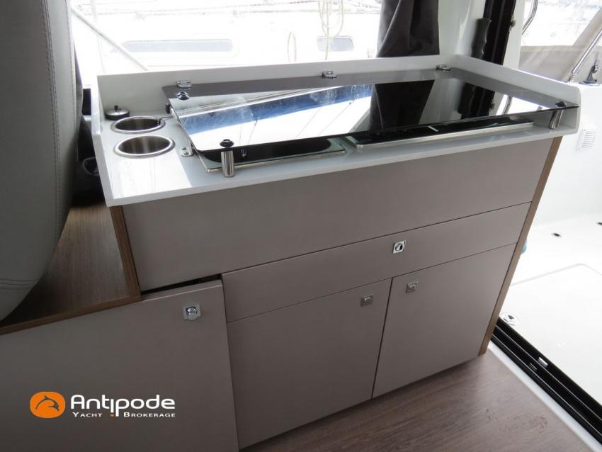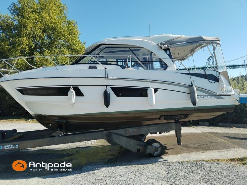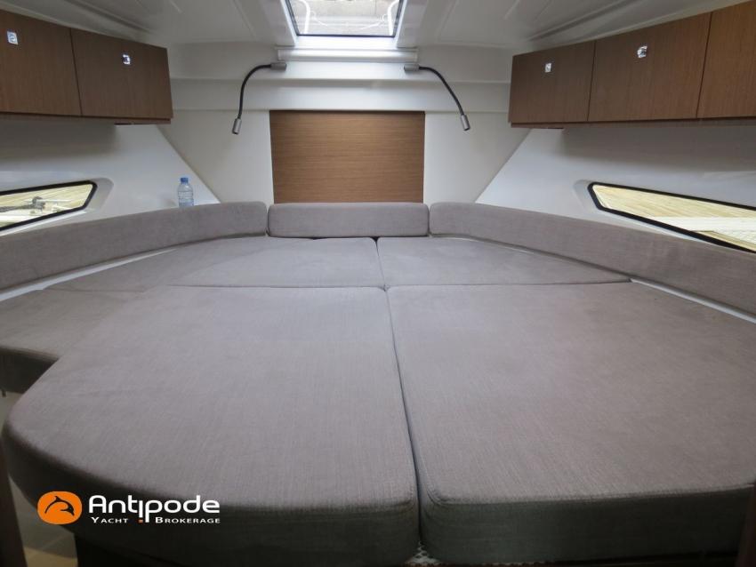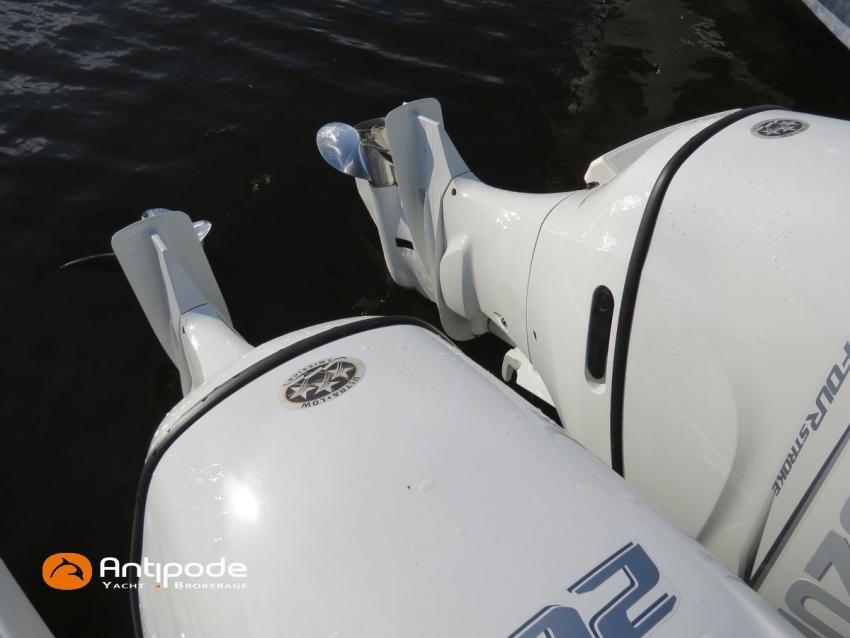 Antares 9 OB, 2022, first hand, Suzuki DF200 APX blanc (x2), 2 x 200 hp (192 hrs), Bow thruster, Elegance layout, Comfort layout, Laminated floorboards, Upholstery : Silvertex sterling & Diamante meteor , Opening port window, Interior curtains, Mosquito screen for opening roof hatches, Original cockpit table (wood) & custom table, Cockpit convertible onto sun bath, Cockpit bimini top, Cockpit cushions, Electric windlass with remote control, Wheelhouse electric windlass remote control, Full cockpit enclosure, Garmin 9 inches GPS and chartplotter, Garmin GT21 - TH depth sensor, Electronic navigation charts, DSC AIS VHF - Garmin 215 i, Fusion audio system - MS-RA70N, Dynamic trim control - Zipwake, Second electrical wiper , Fridge unit 12 V - 60 liters (front opening door), Water heater 220 V (25 liters), Hot and cold pressurized water, 2 burners cooker, 220 V shore power + battery charger - Cristec 25A + 25m lenght cable, AGM service batteries - 2 x 130A, Interior USB & 220 sockets, Battery controller - Victron BMV 702, Holding tank, Extra gauge for holding tank & fresh water, Leds interior lights, 4 men liferaft, 4 men coastal safety equipments, Fob 14 kg anchor + 35m of chain + 40m of rope, Fenders and warps, Located Brittany. For more information or to make an appointment for a visit, contact : Jean-Baptiste Lemaire +33 6 10 25 00 03 - jb@antipode-yachts.com