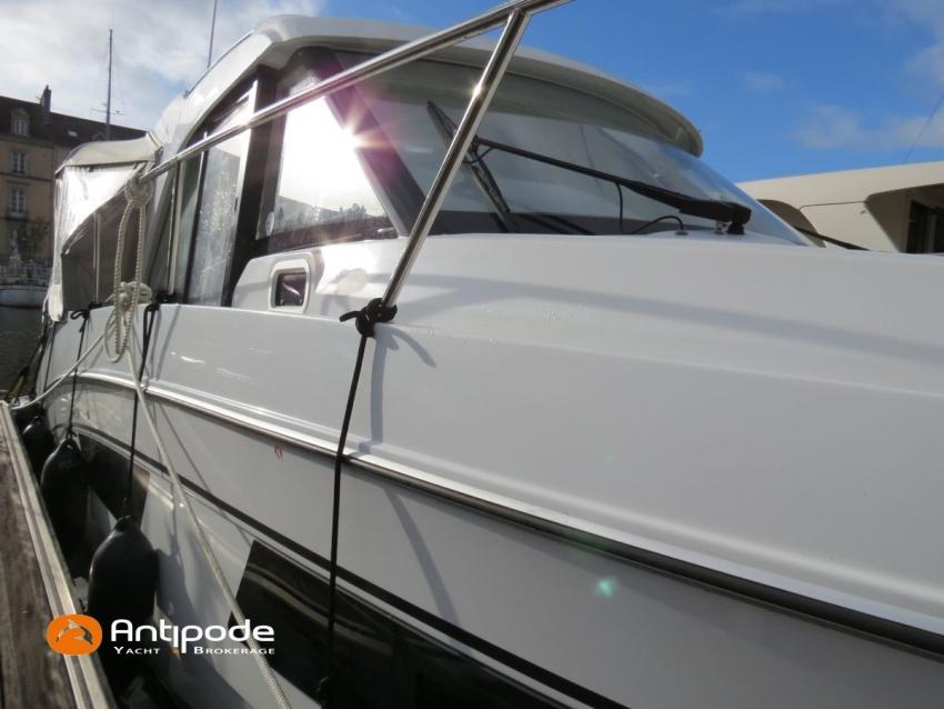 Owner speaks : After many years of semi-open sea sailing, first under sail and then under motor, we decided to call it a day. However, we missed the sea...so we took over a smaller boat (Antarès 7) which quickly proved to be too cramped, which is why we switched to the Antares 9. When it came to life in port, we appreciated the well-adapted layout, with good-sized cabins, an ergonomic bathroom with shower, a functional galley (given the size of the boat) and a well-sized cockpit offering, with the full awning, a very pleasant living space, even in gloomy weather. There's also a large cockpit locker and plenty of storage space, including high side cabinets in the forward cabin. When sailing, you'll appreciate the comfortable helm station, combined with a comfortable crew bench seat and excellent visibility. A side door also provides convenient access to the outside, with a rare capacity for ventilation that is much appreciated by the pilot on sunny days. An excellent hull makes for serene sailing, with reasonable fuel consumption at 6-7 kts and 20-22 kts and a high top speed of 38 kts. We sailed from La Rochelle to Loctudy in complete safety and, when the sea state was favourable, enjoyed satisfactory average speeds of over 20 knots.
