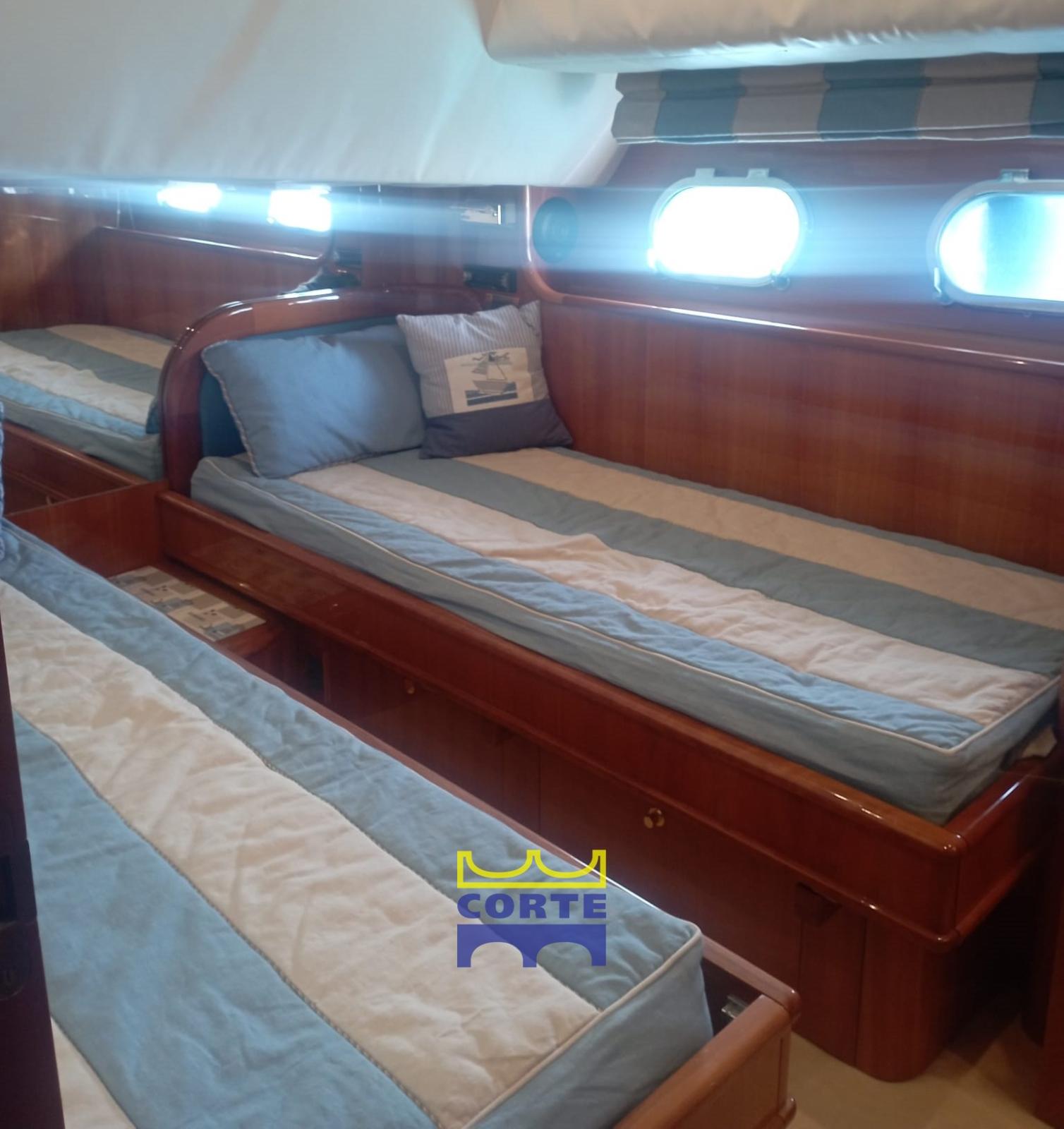 Fume/Gas Detector, Engine Alarm, Bilge Alarm, Water pressure pump, Teak Side Decks, Deck Shower, Twin Steering, Directional Spotlight, Hydraulic Flaps, Davits for tender on fly, Fire Extinguishing System, Courtesy Lights, Gangway (elettroidraulica a scomparsa), Platform (di poppa in teak), Automatic Bilge Pump, Entry door, Side door, Teak Cockpit, Shorepower connector, Water harbor connector system, Electric Windlass, swimming ladder, cockpit table, Tender, Horn, 2 Stern Winches, Bow Winches.