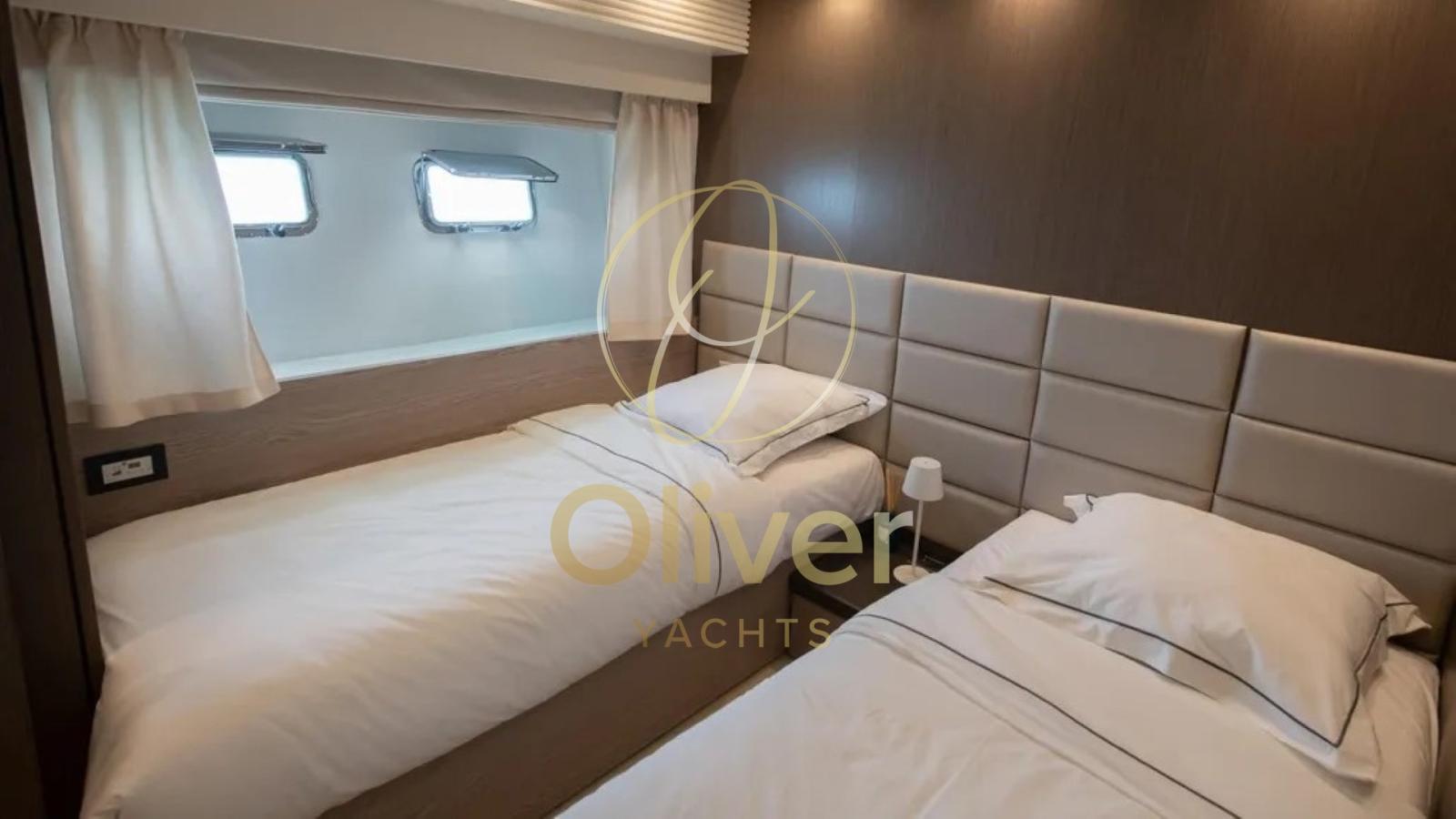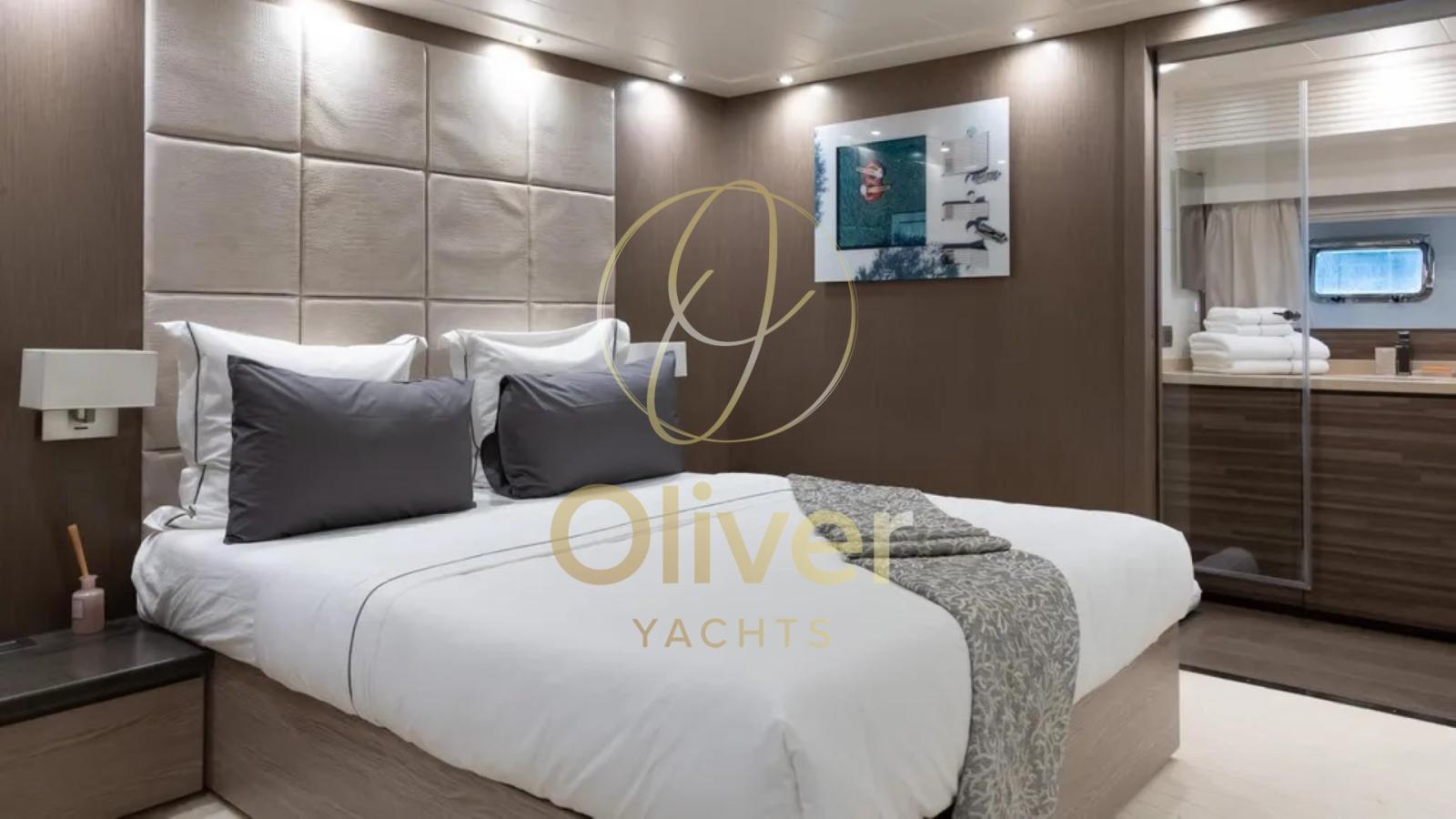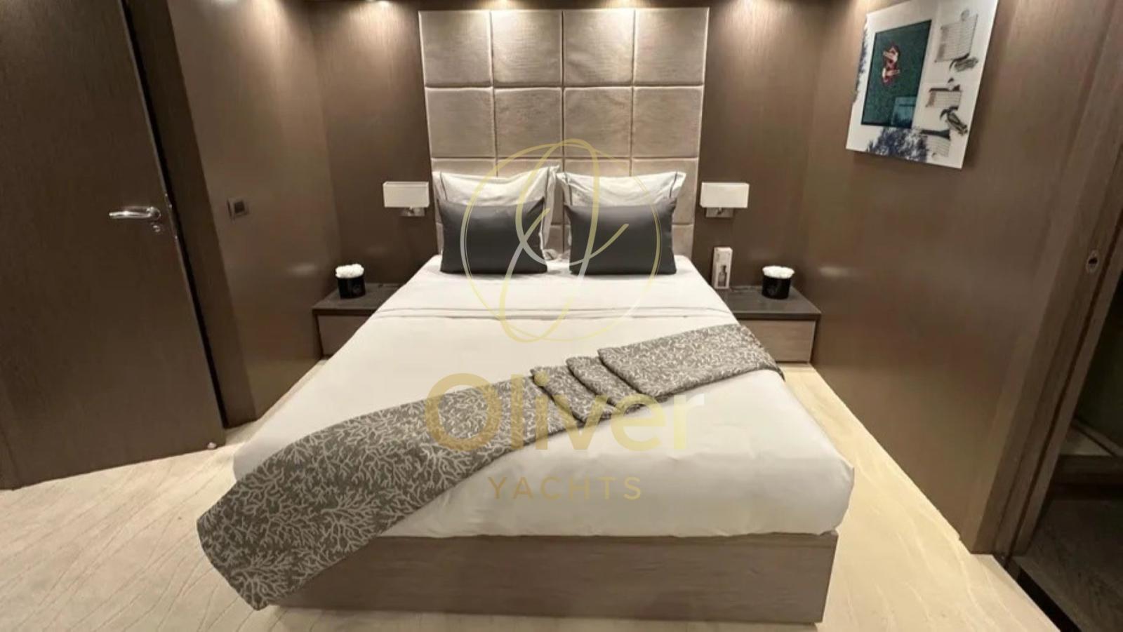 The owner's seat, located amidships, is a true full-beam suite with desk, walk-in closet and en suite bathroom. The VIP cabin, also with an en-suite bathroom, is finished with custom-made wardrobes. The two double cabins offer single beds, smart wardrobes and en-suite bathrooms with showers. In total, the boat comfortably accommodates 9/10 guests in 4 cabins. The crew area includes 2 cabins with 4 beds and dedicated services, ensuring operability and discretion.