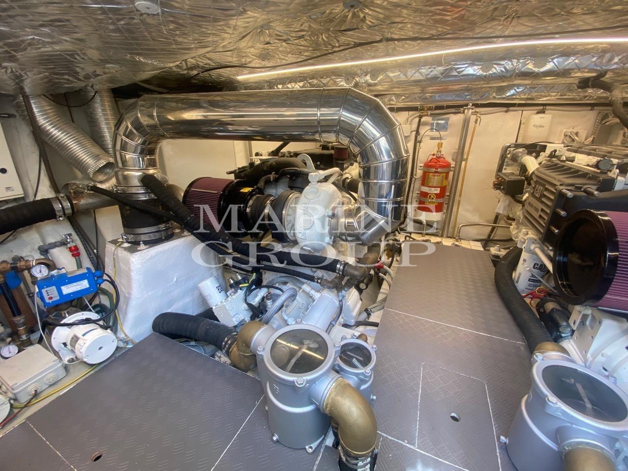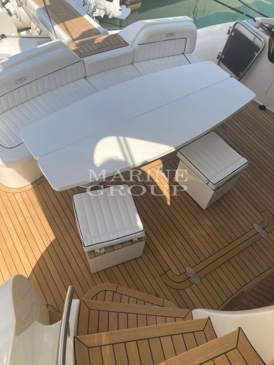Speakers, Satellite TV Antenna, Air Conditioning, BBQ/ Grill, Bimini (on the fly), Boiler, Reversible air conditioning, Freezer, Cockpit cover (Norwegian), Complete cushions, Stern cushions, Bow cushions, Flybridge cushions, Cockpit cushions, Oven (combined), External refrigerator, Indoor refrigerator, TV system, Inverter, Dishwasher, Washing machine, Blinds, Ceramic hob (4 burners), Internal sockets 12v, Internal sockets 220v, AM/FM radio, Stereo, 3 Camera (1 cockpit 2 engine room), Console cover, Seat cover, Awning, 4 TVs, Radar antenna, Battery charger, Electronic engine control, Deck shower, Double wheelhouse, Stern thruster, Bow thruster, Electric flaps, Underwater lights, Gangway (hydraulic), Entrance door, Teak cockpit, 220V dock socket, Shore water intake, Electric windlass, Swimming ladder, Cockpit table (convertible into a sundeck).