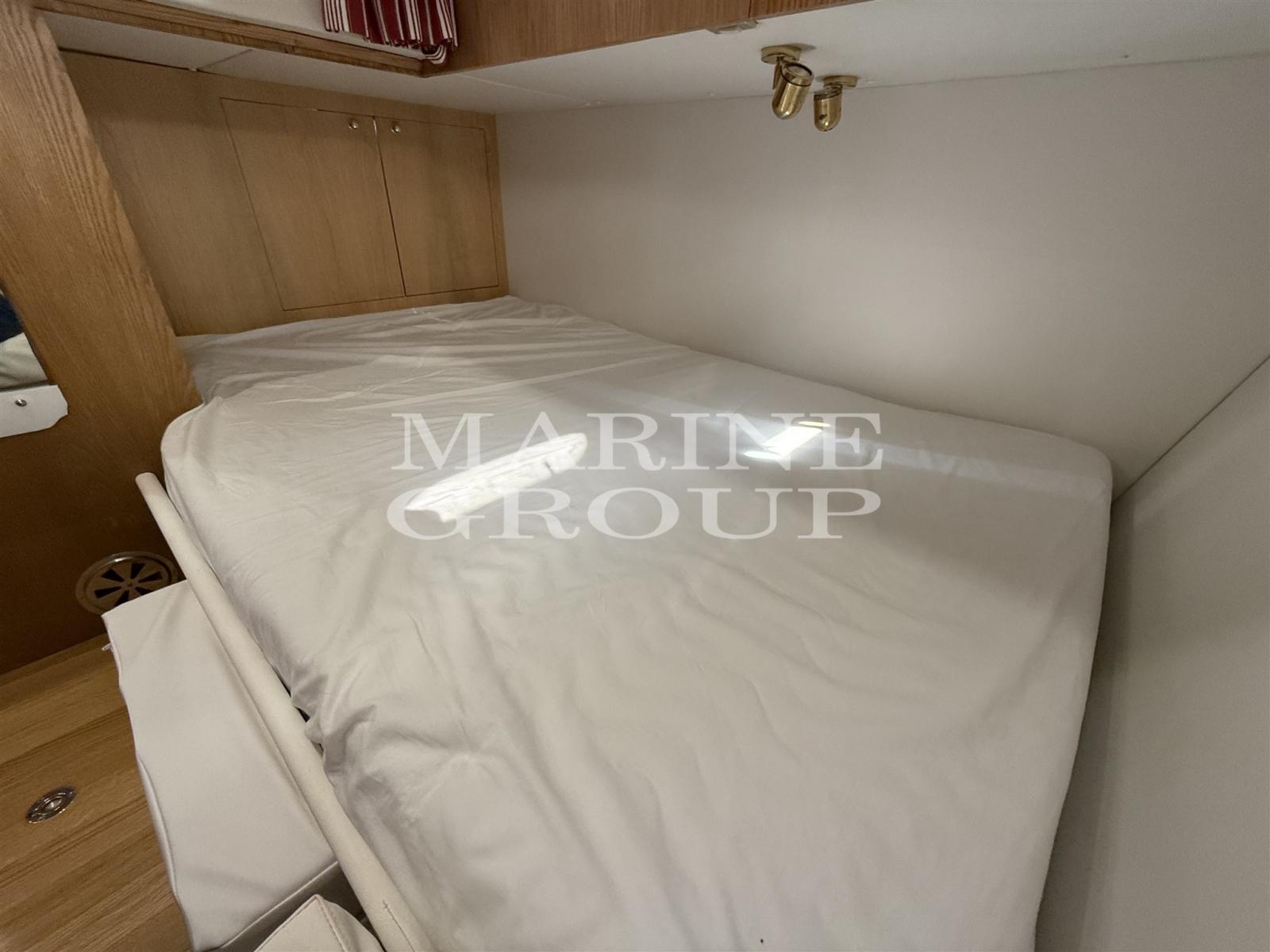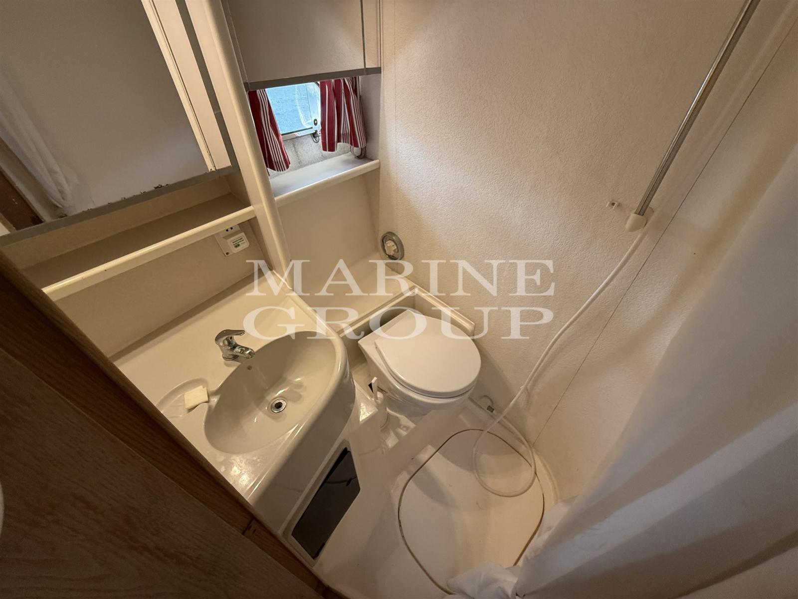 Interiors in light wood; convertible dinette with comfortable "C" shaped seat and dining table; Fully equipped "L" shaped kitchen; Owner's cabin in the bow with double bed and en-suite bathroom; Guest cabin amidships modified into double + private bathroom with double access.