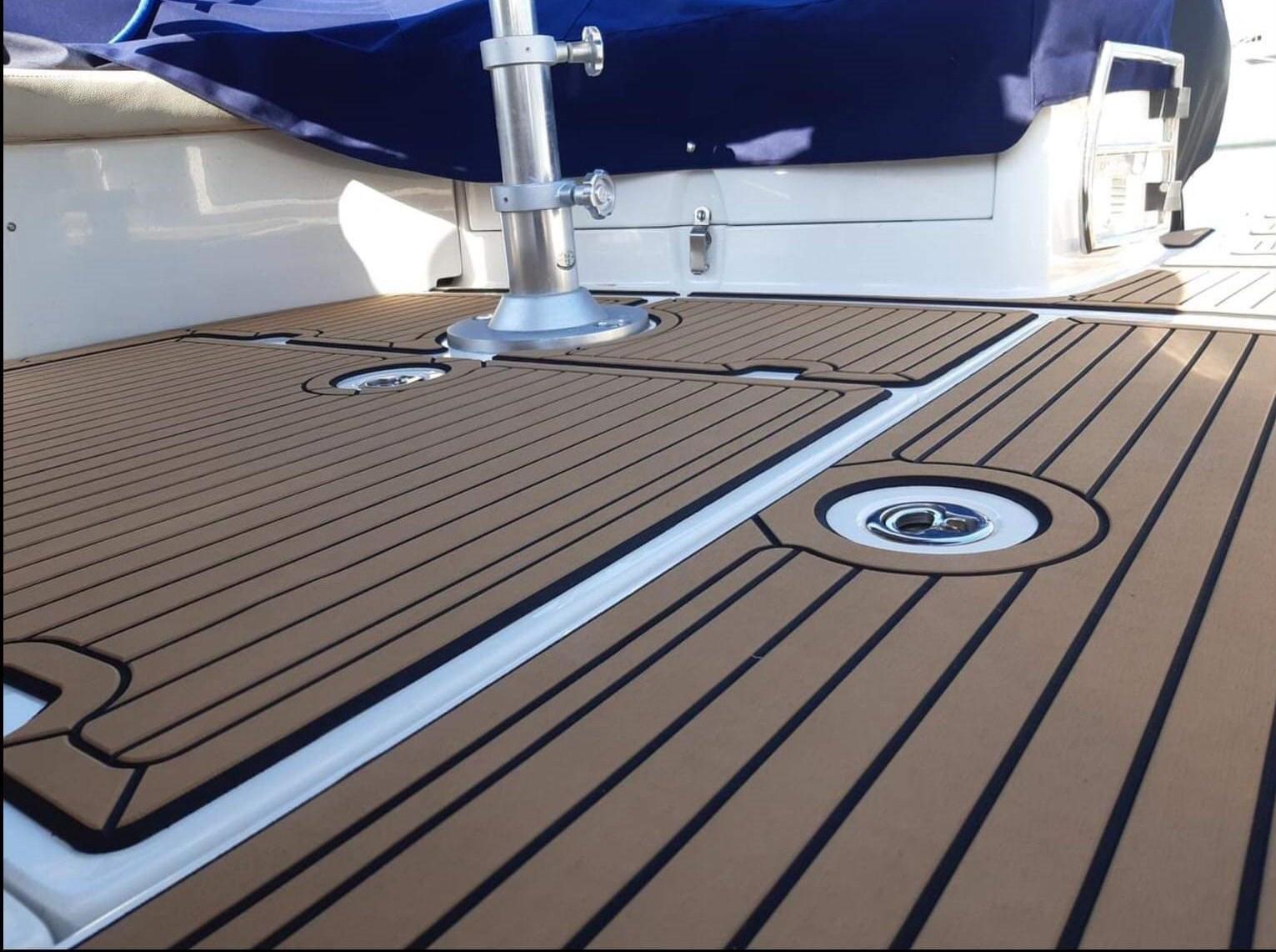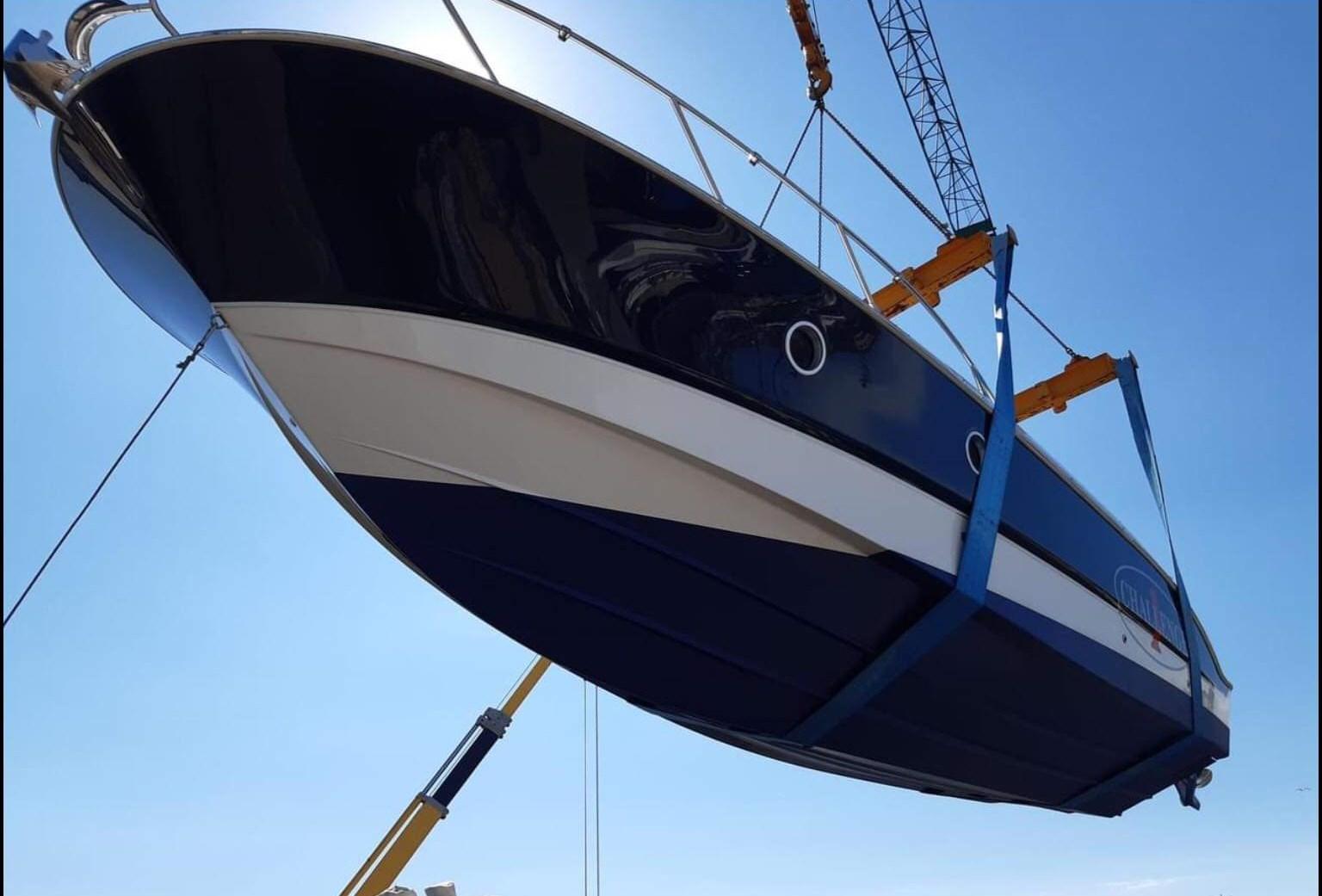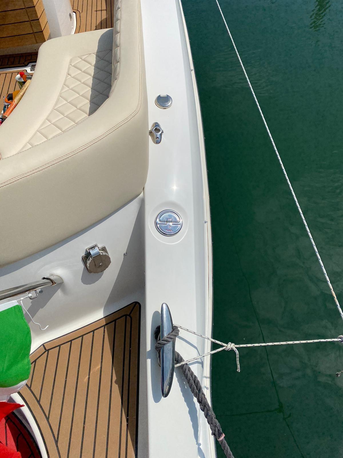 Engine Alarm, 3 Batteries, Teak Side Decks, Special Colour (blu verniciatura 2023), Deck Shower, Hydraulic Flaps, Flaps Indicators, Washbasin in the cockpit, Gangway, Platform, Manual Bilge Pump, Entry door, Teak Cockpit, Shorepower connector, Water harbor connector system, Electric Windlass, swimming ladder, cockpit table, Tender, Horn.