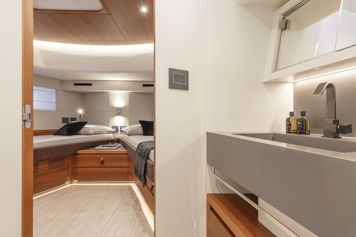 The E60 is equipped with lots of sleeping accommodation. Like the Master cabin which is positioned in the center of the boat with an impressive size, thanks to using the entire width of the boat. The VIP cabin, positioned in the bow of the boat with provision for a private bathroom, is available in a double bed or two single beds depending on the needs of the client. The third cabin has two large single beds and a large bathroom. Also striking is the crew cabin, which is accessible from behind the sun deck at the back of the boat, equipped with two beds, a toilet and direct access to the engine room. If I did that