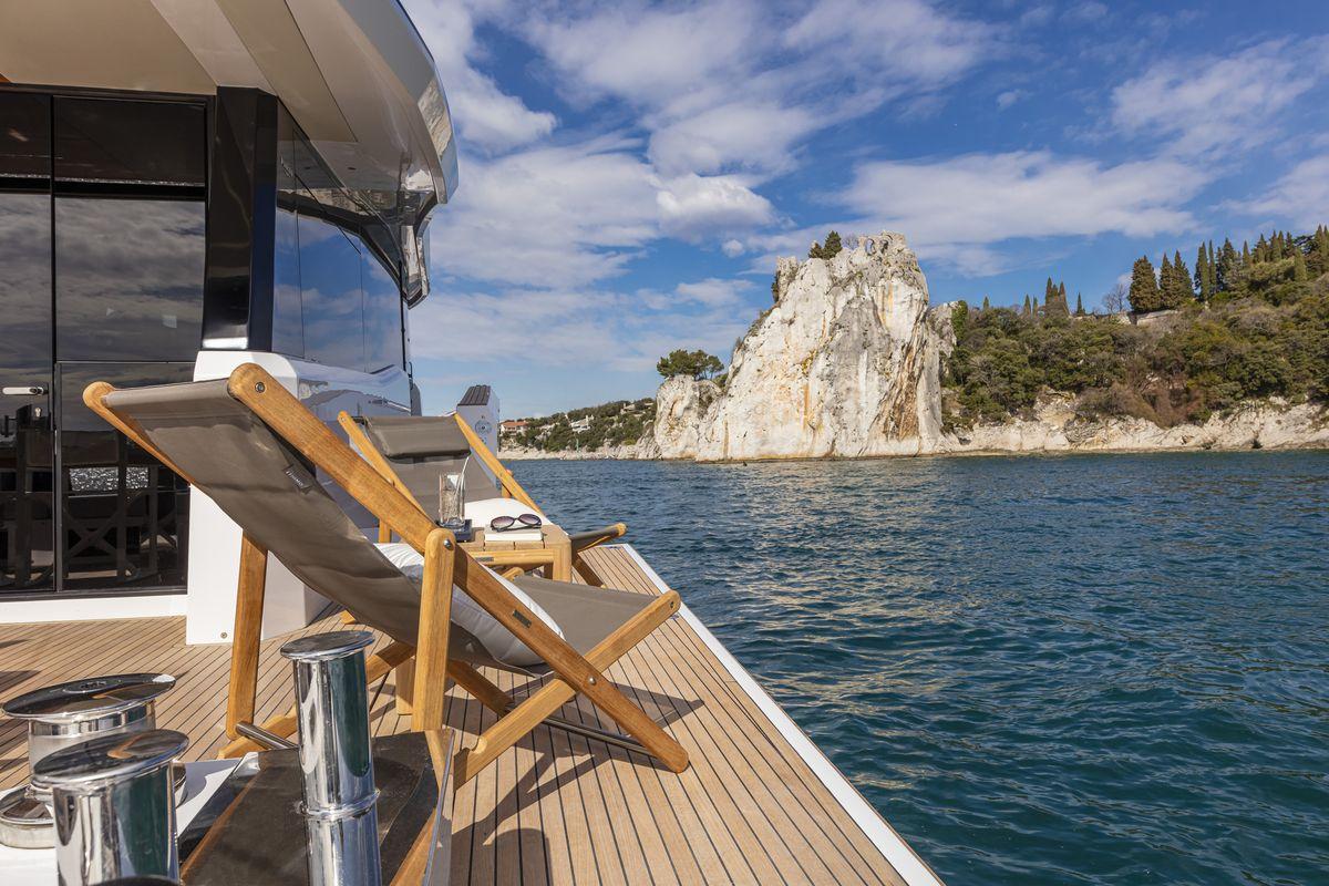 With regard to the outside deck, the provision of maximum living space has been taken into account. This is made possible by, among other things, the returning Walk-around concept. And the possibility to open the outside area at the back of the boat creating a large terrace of 33 m2. The boat is also optionally available with a fly bridge. And that's a