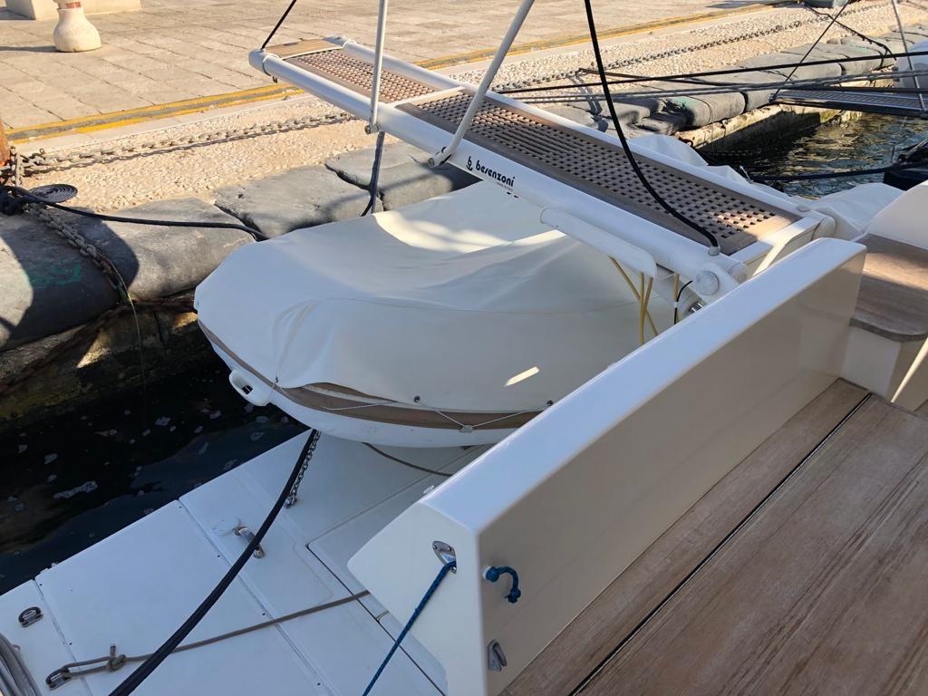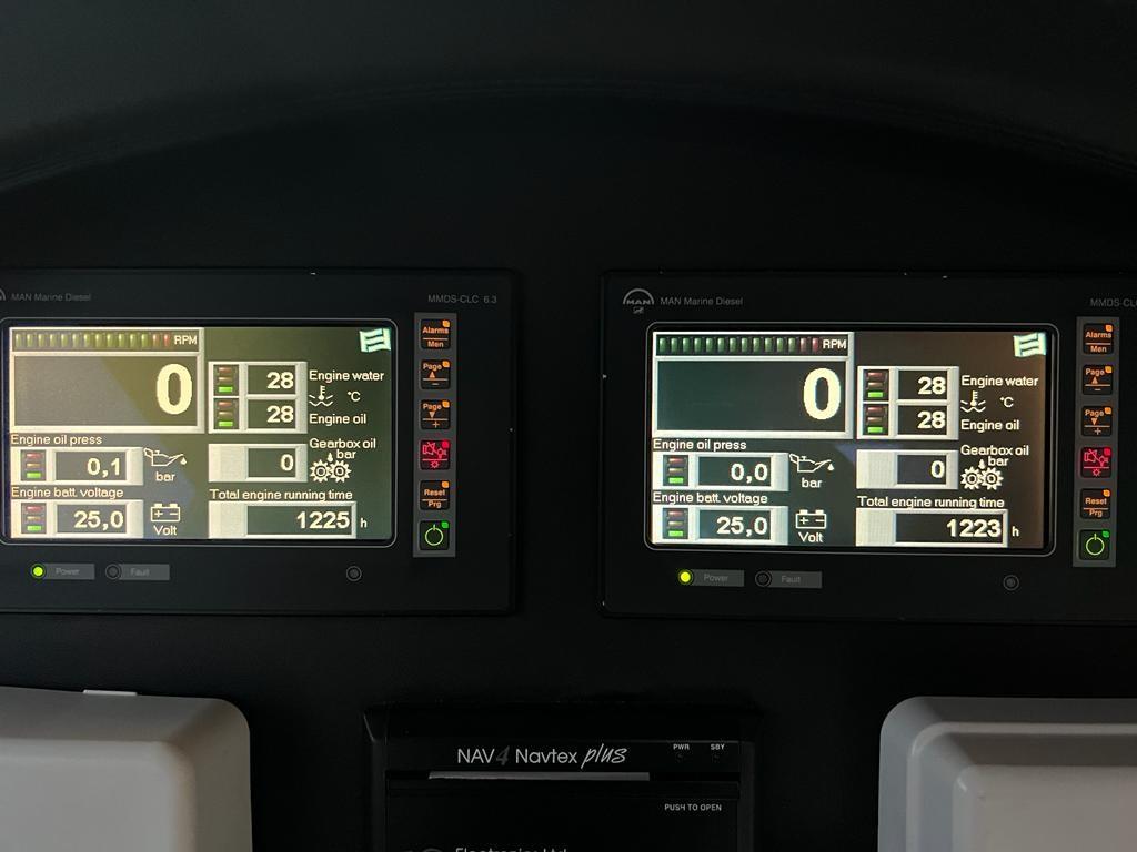 Engine Alarm, Bilge Alarm, Anchor (Ultra Anchor 27 kg + catena 100 mt), Spare shaft, Water pressure pump (doppia), 8 Batteries (nuove 2022), Deck Shower, 2 Secondary Propeller, Hydraulic Flaps, Fire Extinguishing System (revisione 2025), Flaps Indicators, Washbasin in the cockpit, Courtesy Lights, Underwater lights, Gangway (Besenzoni), Platform, Manual Bilge Pump, Entry door, Teak Cockpit, Shorepower connector, Water harbor connector system, Voltage Rectifier, Electronic instrumentation repeater, Electric Windlass, swimming ladder, cockpit table, Horn, 2 Stern Winches.