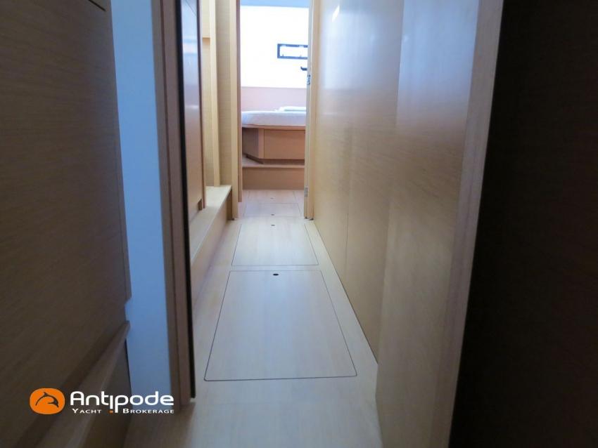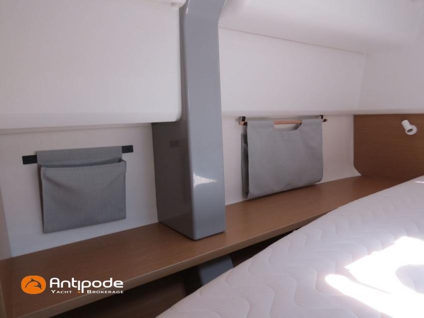 EXCESS 14, 2023, privatly owner boat, first hand, never chartered, possible marina berth Brittany, 2 X Yanmar, 2 X 57 hp (480 hrs), Sail Away package, Interior layout version 3 cabins, Starboard hull : extra berth in forward storage room, Port hull : extra berth in front peack, 3 heads (toilets + shower), Standard interior woodwork + optionnal Valley foorboards, Galley : optionnal work top Kerrock, 1 electric winch to starboard - Harken, Electric winch for adjustment main sail sheet track - Flatwinder Harken, Aft GRP davits for tender (grey), Double folding seat at starboard helmstation, GRP wheels (orange) - Carbonautica, Full cockpit enclosure - Charcoal Grey, Wood cockpit table (in lieu of standard GRP table) incl.extension, Cockpit cushions grey, Cockpit chain counter and remote control, Pulse Line rigging (extended mast + 1,76 m), Sail area extended to 135 sqm (+ 12 sqm compared with standard rig), Black covering on mast, Dyneema running rigging, Square head triradial main sail, Exrp laminated grey Ekko - Elvstrom, Genoa Ekko Grey - Elvstrom, Code 0 Pulse Line (86 sqm - 14 extra sqm compared to standard), black UV strip - Elvstrom, Asymetric spinnaker 191 sqm - Elvstrom, Spinnaker snuffer, Electronic navigation package - Garmin, In board autopilot - Garmin, GPS and chartplotter (starboard cockpit) - Garmin GPS MAP 12 , Electronic navigation charts, AIS Transponder CLASS B (emission and reception) - AIS 500 Raymarine, VHF B & G V 100 B, Engines batteries 2 X 50 amp AGM, Service batteries 6 X 95 amp AGM, Engines alternators 12 V 125 amp, 12 V to 220 V Inverter - 2 KVA, 3 x Electric toilets (sea water), Extra water tank (+ 300 liters), watermaker 120 l/h, Sea water foot pump, Deck washing pump sea and fresh water), Leds navigation lights, Leds interior and exterior lights, Liferaft, Anchor 20 kg + chain D 10 X 75 m , Located Brittany. For more information or to make an appointment for a visit, contact : Jérôme Le Joubioux +33 6 07 45 71 73 - jerome@antipode-yachts.com