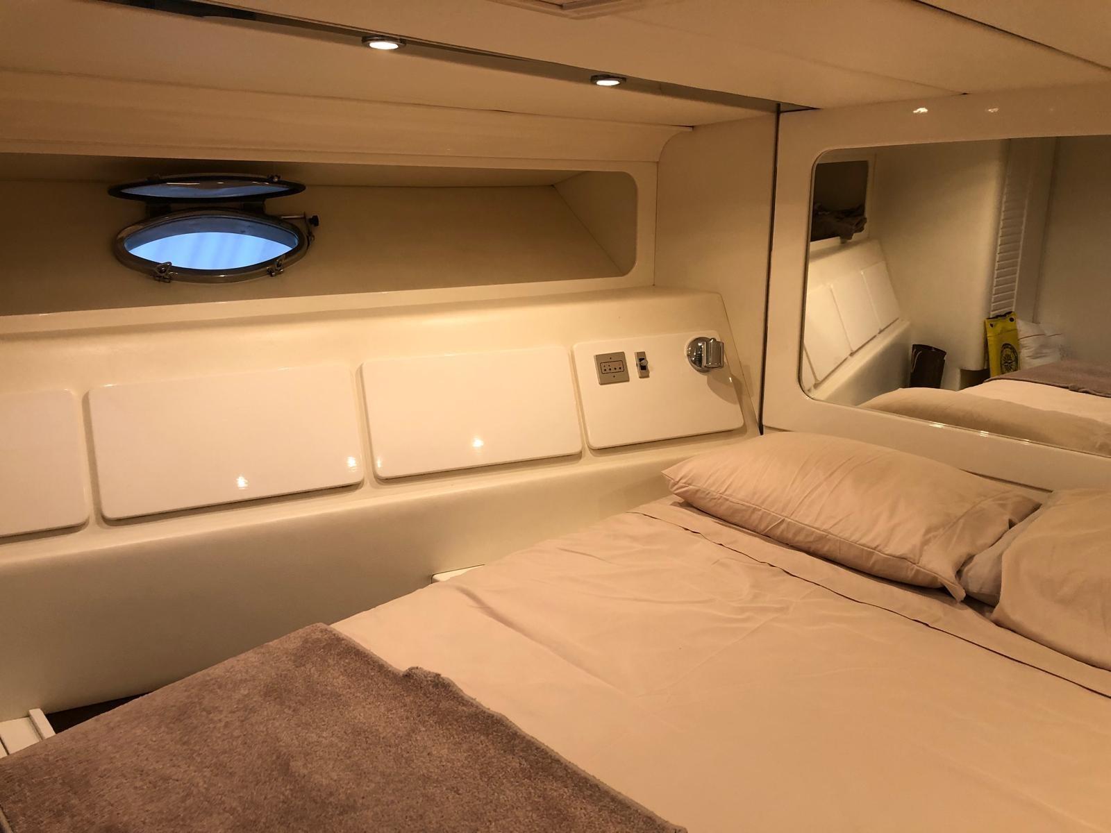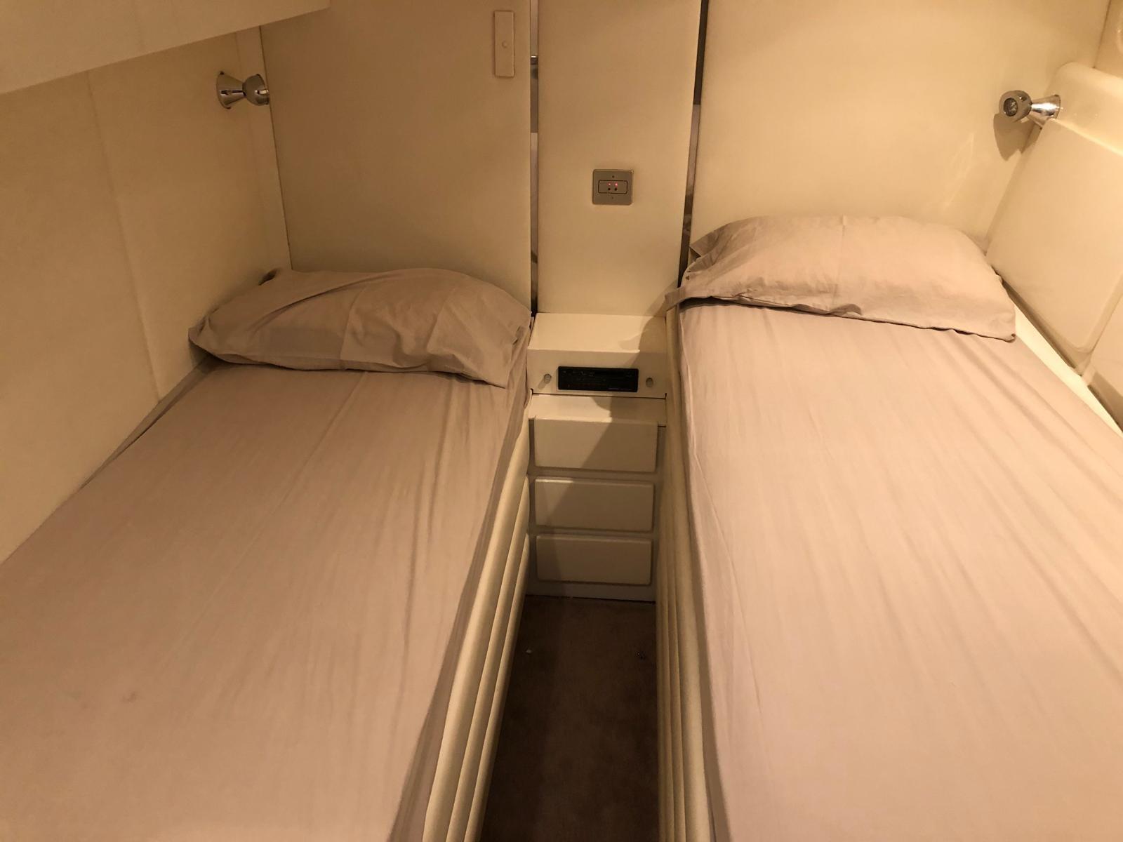 Master cabin with double bed and bathroom - guest cabin with two flat beds and bathroom - convertible dinette.