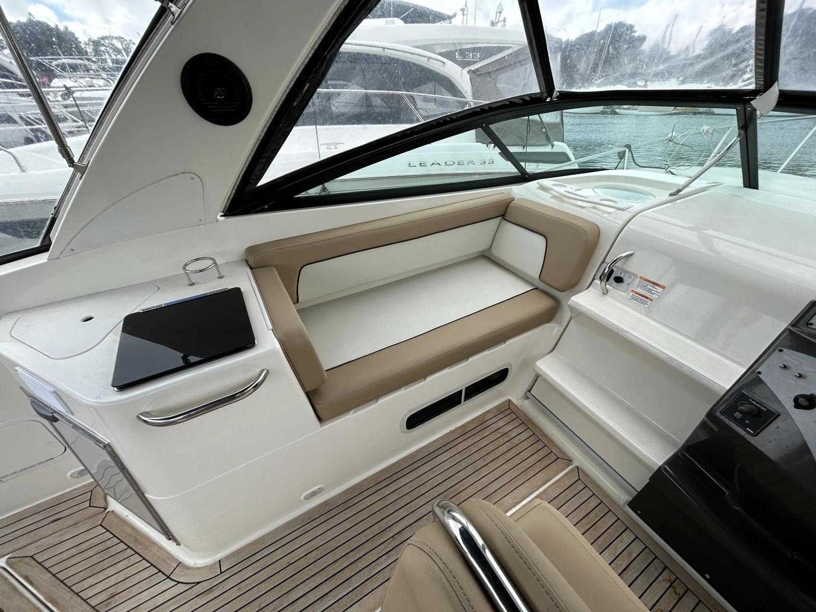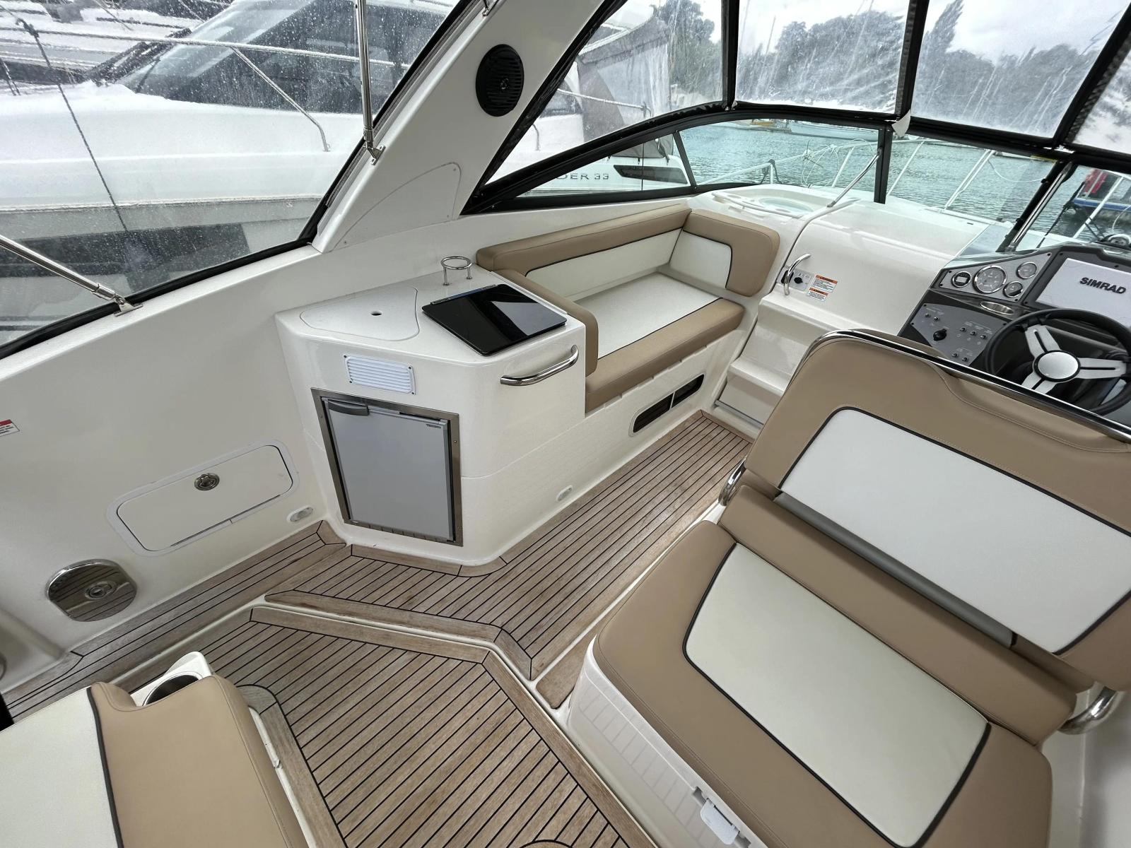 2018 Bayliner Ciera 8 powered by a Mercruiser 6.2L petrol engine. This is a clean example of this popular model. Finished in all-white gelcoat with contrasting black canvas, this Ciera 8 is a sporty looking 4-berth cruiser. She has a huge cockpit featuring a wet bar and aft sunpad conversion, and lots of seating. Her helm is well laid out and she is fitted with Simrad electronics and a bowthruster.