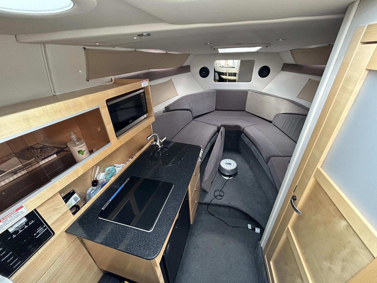 The galley offers a stove, sink, microwave and refrigerator.