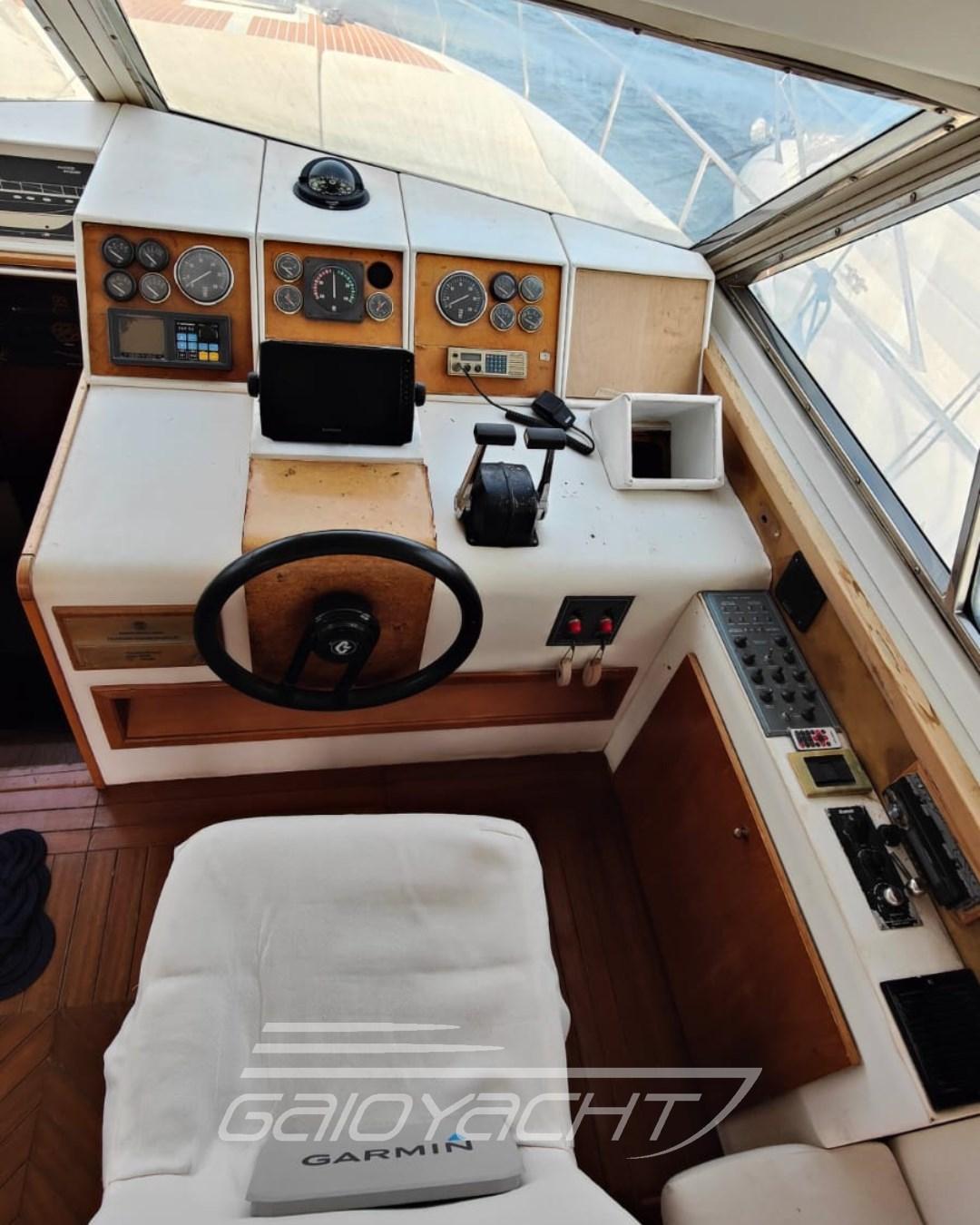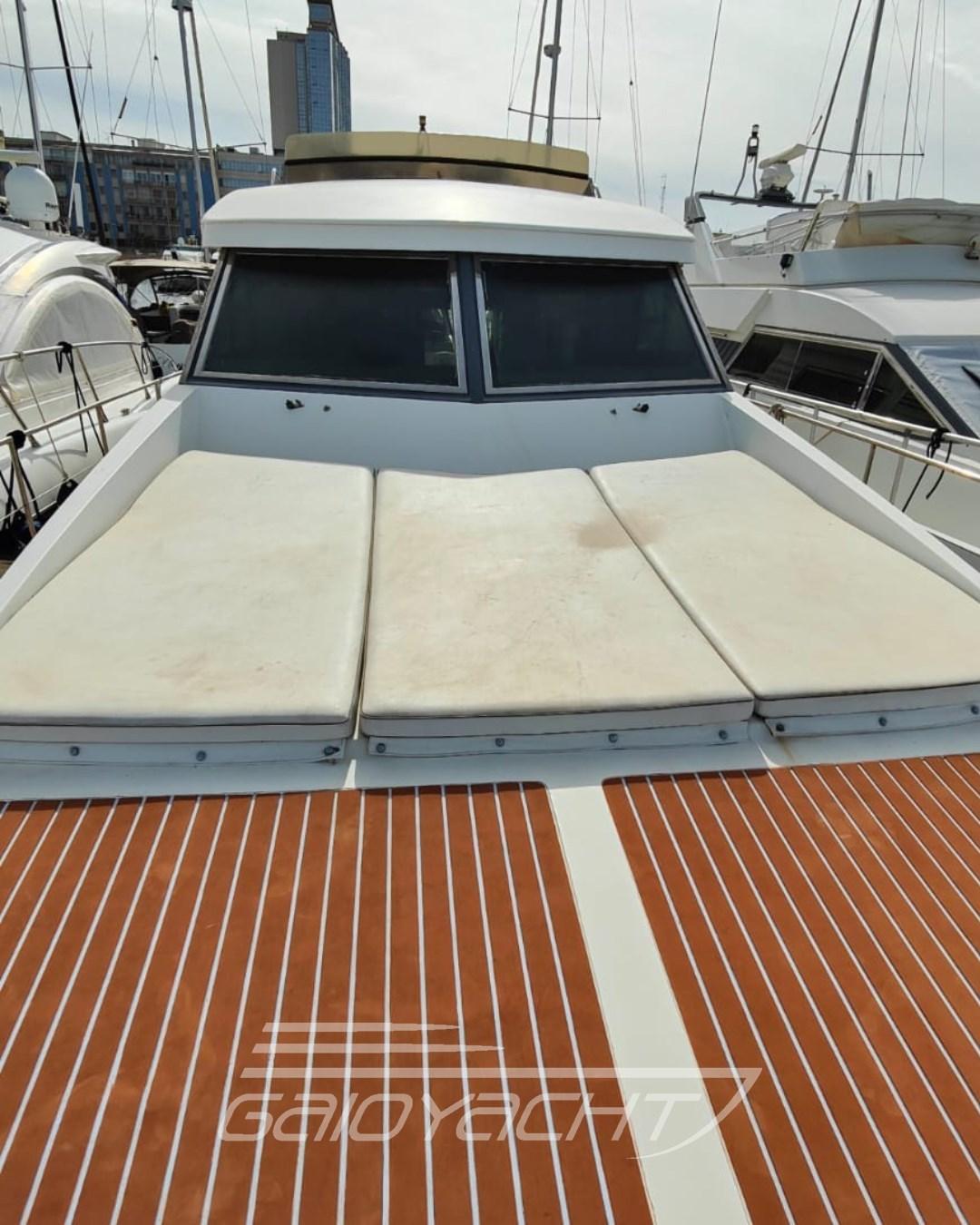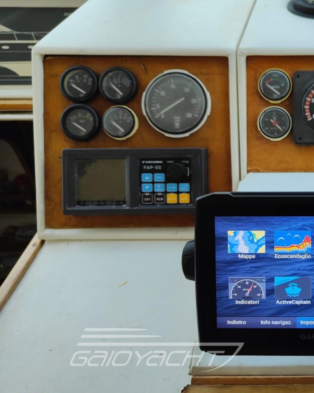 Engine Alarm, Bilge Alarm, Water pressure pump, 4 Batteries (2 Motori + 2 Servizi AGM), Teak Side Decks (S teack), Deck Shower, Twin Steering, Hydraulic Flaps, Fire Extinguishing System, Anchor Chain Washdown, Gangway (Besenzoni), Automatic Bilge Pump, Entry door, Teak Cockpit, Shorepower connector, Water harbor connector system, Voltage Rectifier, Electric Windlass, swimming ladder, Saddles for tender, cockpit table (Amovibile), Horn.