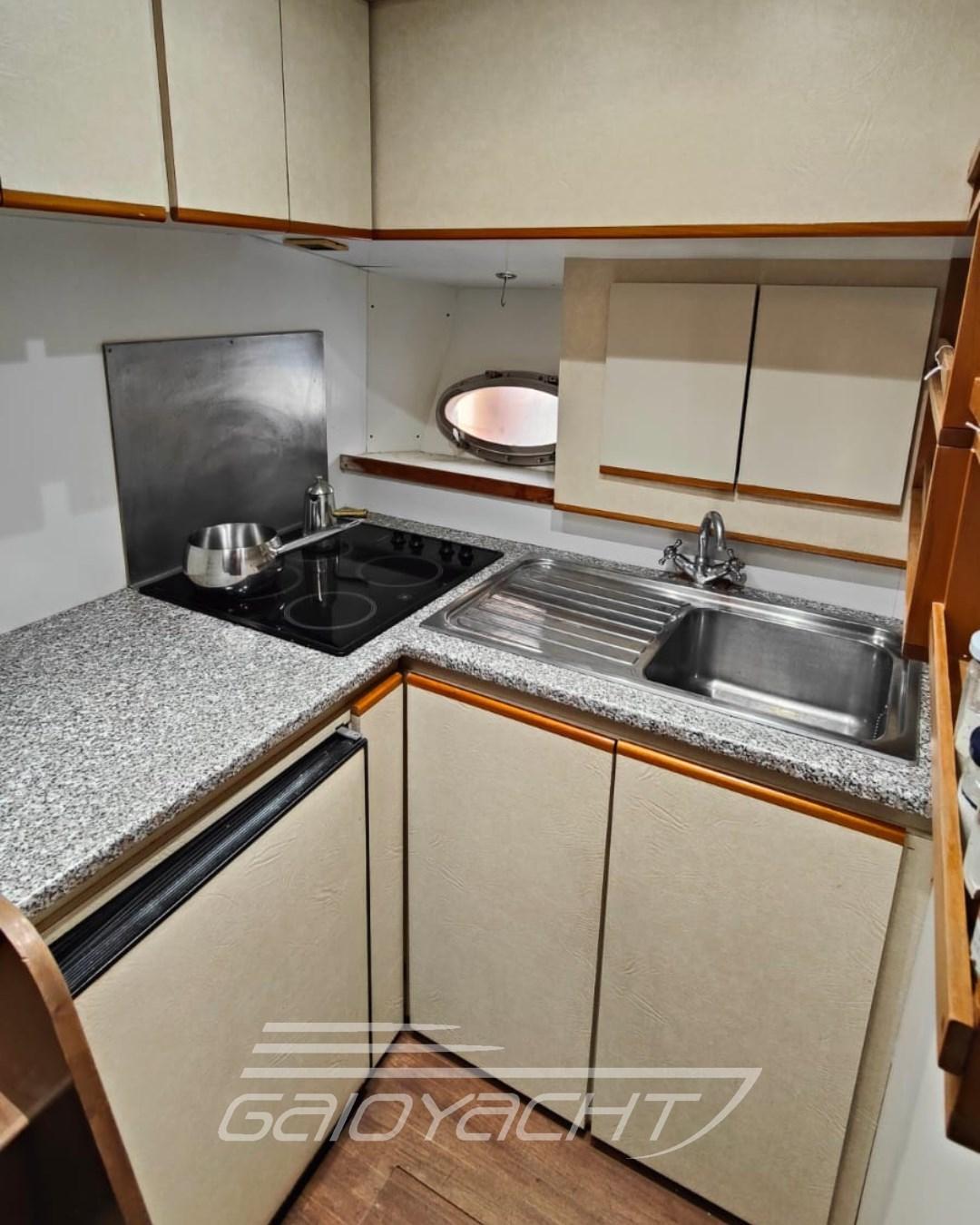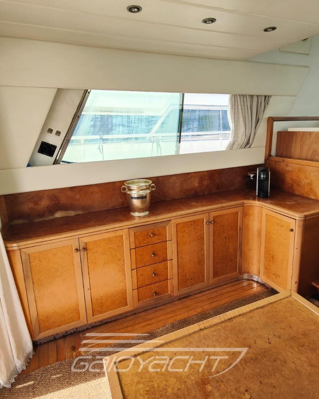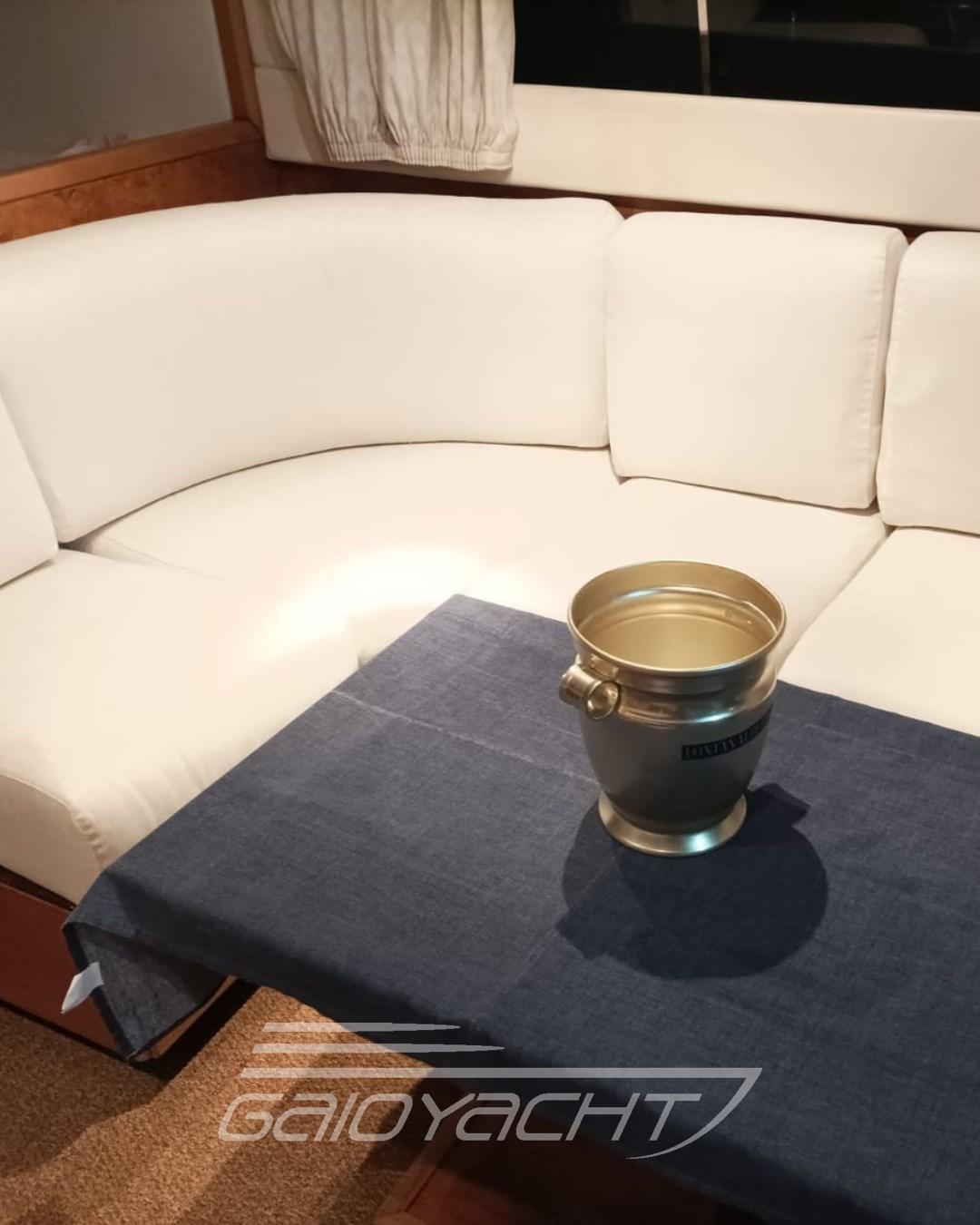 Engine Alarm, Bilge Alarm, Water pressure pump, 4 Batteries (2 Motori + 2 Servizi AGM), Teak Side Decks (S teack), Deck Shower, Twin Steering, Hydraulic Flaps, Fire Extinguishing System, Anchor Chain Washdown, Gangway (Besenzoni), Automatic Bilge Pump, Entry door, Teak Cockpit, Shorepower connector, Water harbor connector system, Voltage Rectifier, Electric Windlass, swimming ladder, Saddles for tender, cockpit table (Amovibile), Horn.