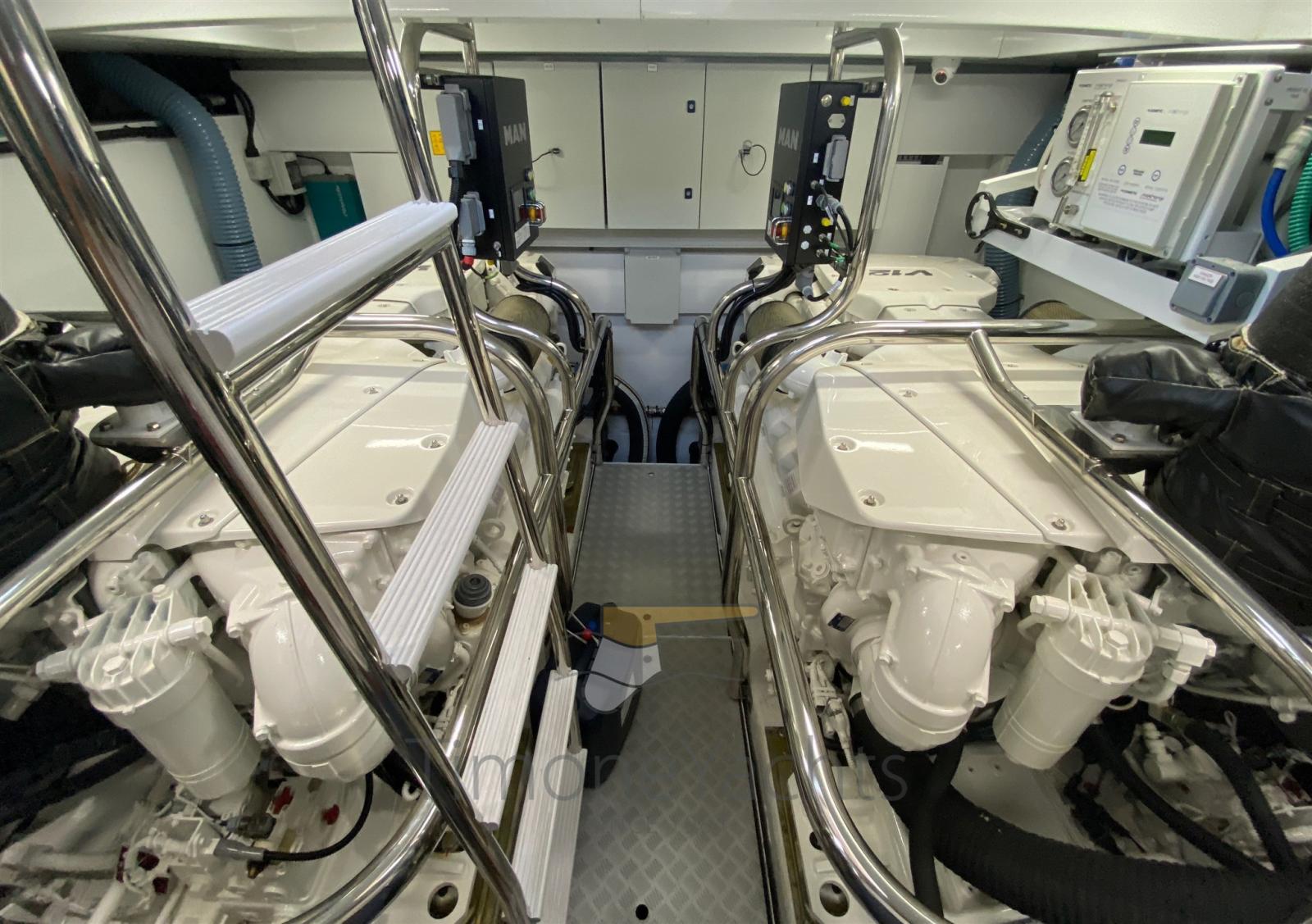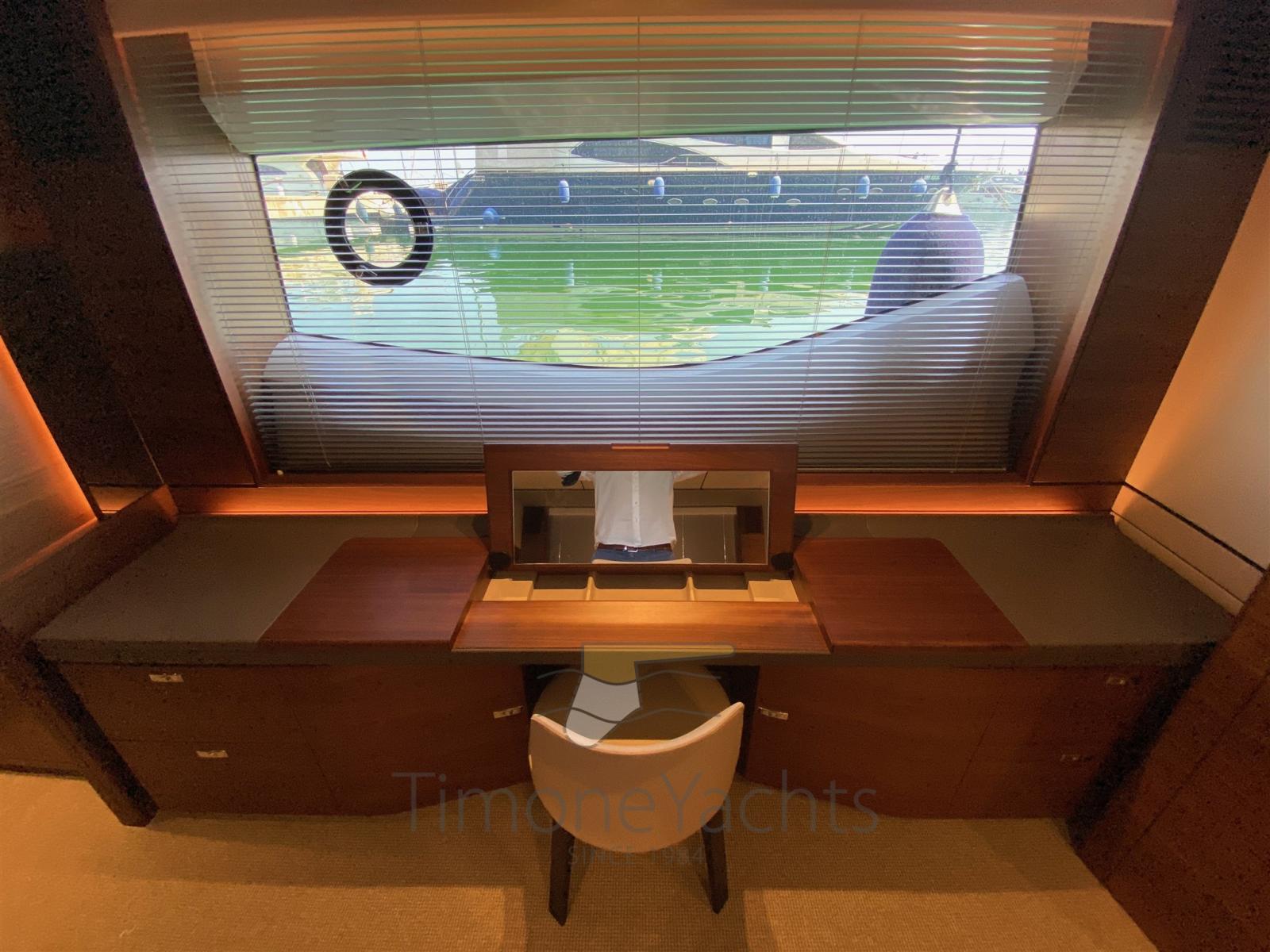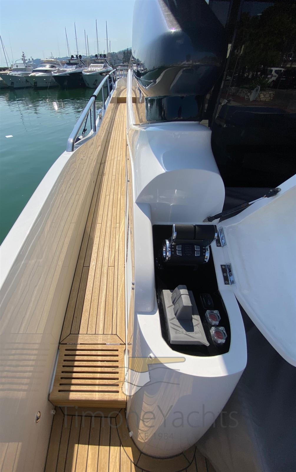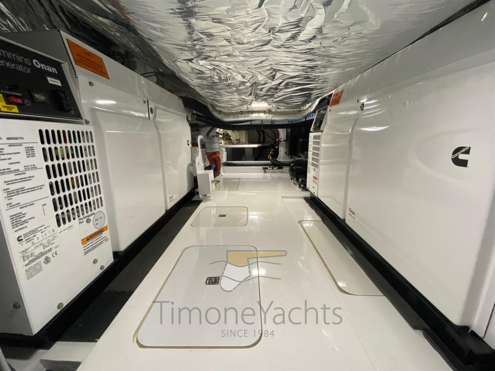 Fume/Gas Detector, 2 Engine Alarm, Bilge Alarm, Auto Dynamic Trim Interceptor, Water pressure pump, Teak Side Decks, Deck Shower, Twin Steering, Directional Spotlight, Hydraulic Flaps, Tender Garage, Tender Crane (sul Fly), Fire Extinguishing System, Flaps Indicators, Anchor Chain Washdown, Washbasin in the cockpit, Courtesy Lights, Underwater lights, Gangway (elettroidraulica), Platform (elettroidraulica), 5 Automatic Bilge Pump, Entry door, Side door, Teak Cockpit, Shorepower connector, Voltage Rectifier, Rollbar, Electric Windlass, swimming ladder, Stabilizers (Seakeeper), cockpit table, Horn, 2 Stern Winches, Bow Winches.