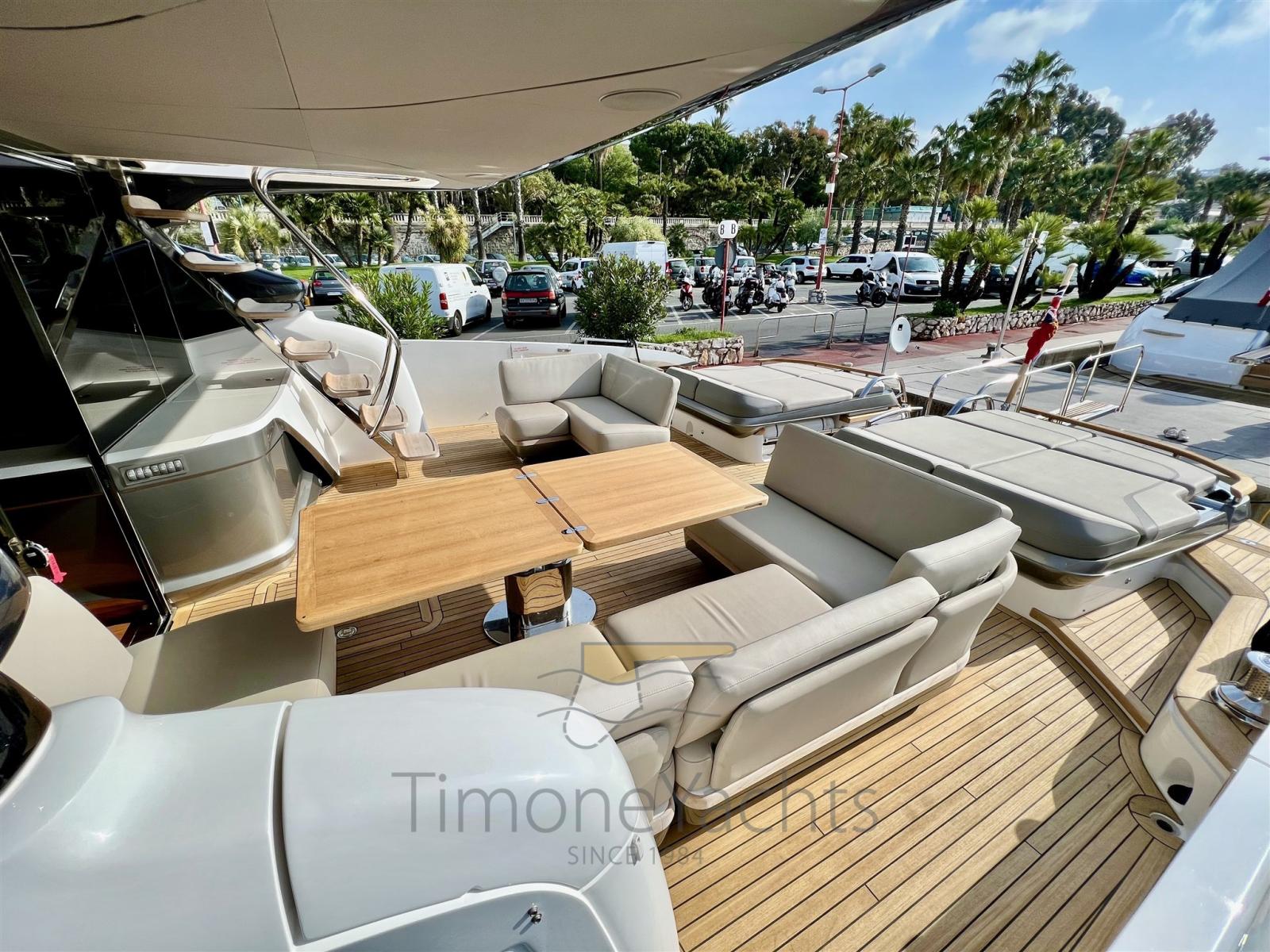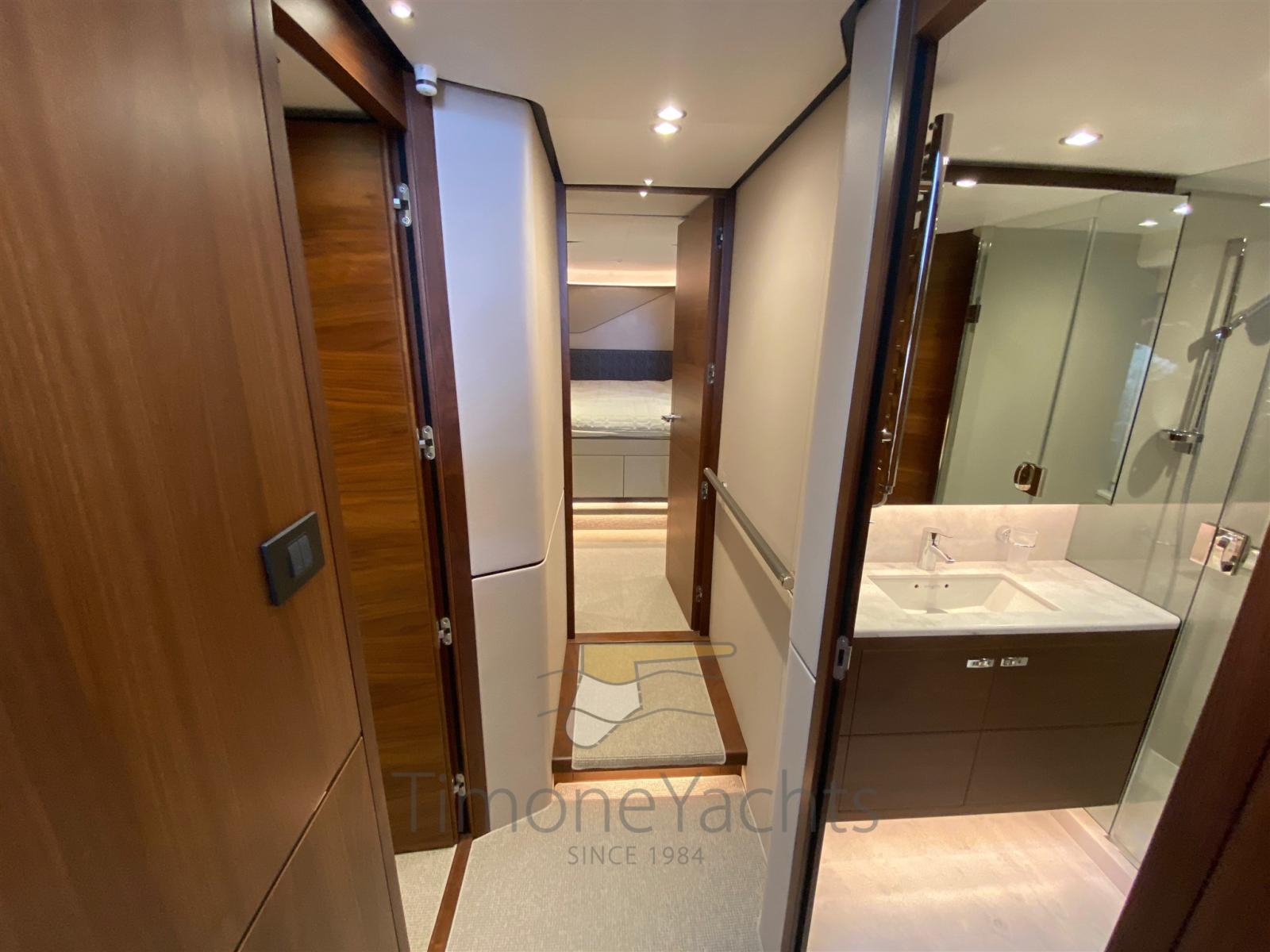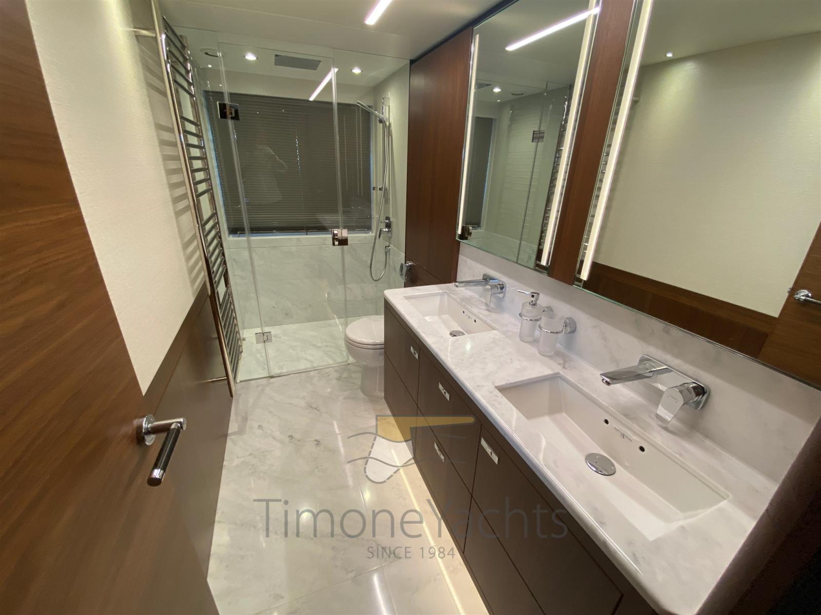 Fume/Gas Detector, 2 Engine Alarm, Bilge Alarm, Auto Dynamic Trim Interceptor, Water pressure pump, Teak Side Decks, Deck Shower, Twin Steering, Directional Spotlight, Hydraulic Flaps, Tender Garage, Tender Crane (sul Fly), Fire Extinguishing System, Flaps Indicators, Anchor Chain Washdown, Washbasin in the cockpit, Courtesy Lights, Underwater lights, Gangway (elettroidraulica), Platform (elettroidraulica), 5 Automatic Bilge Pump, Entry door, Side door, Teak Cockpit, Shorepower connector, Voltage Rectifier, Rollbar, Electric Windlass, swimming ladder, Stabilizers (Seakeeper), cockpit table, Horn, 2 Stern Winches, Bow Winches.