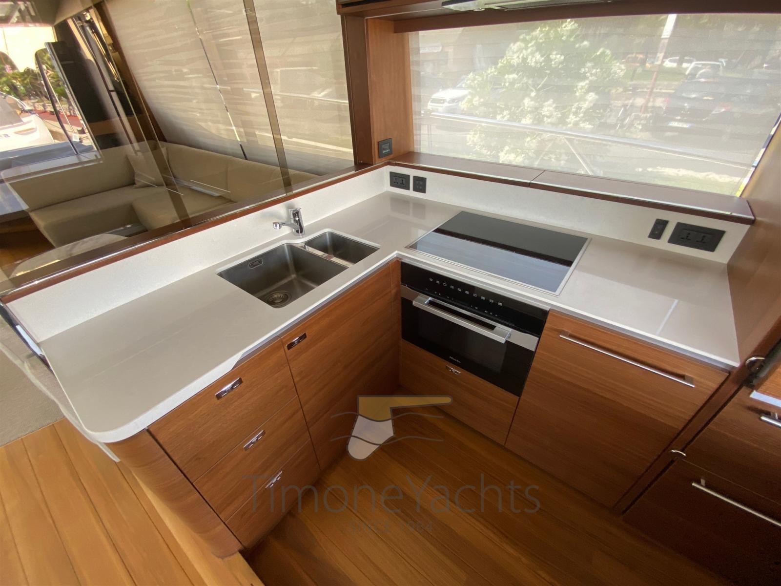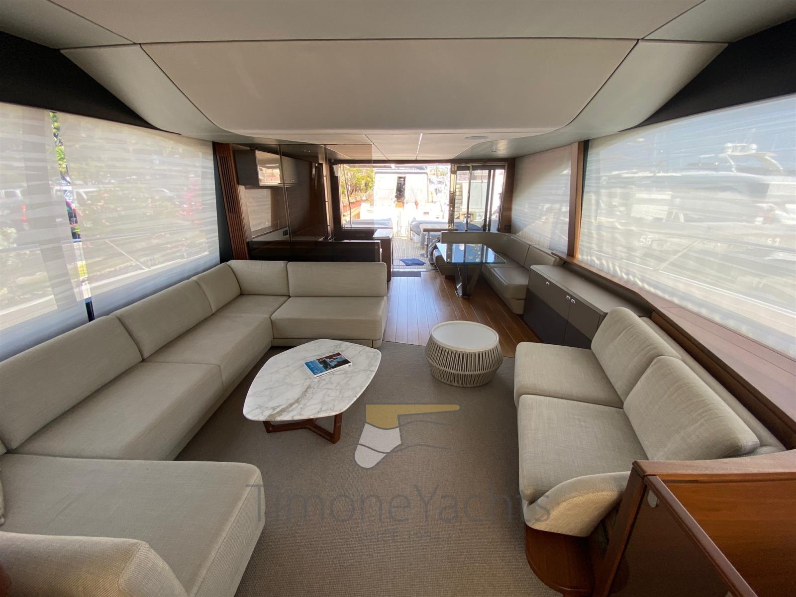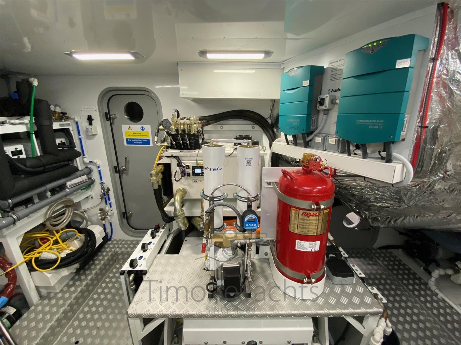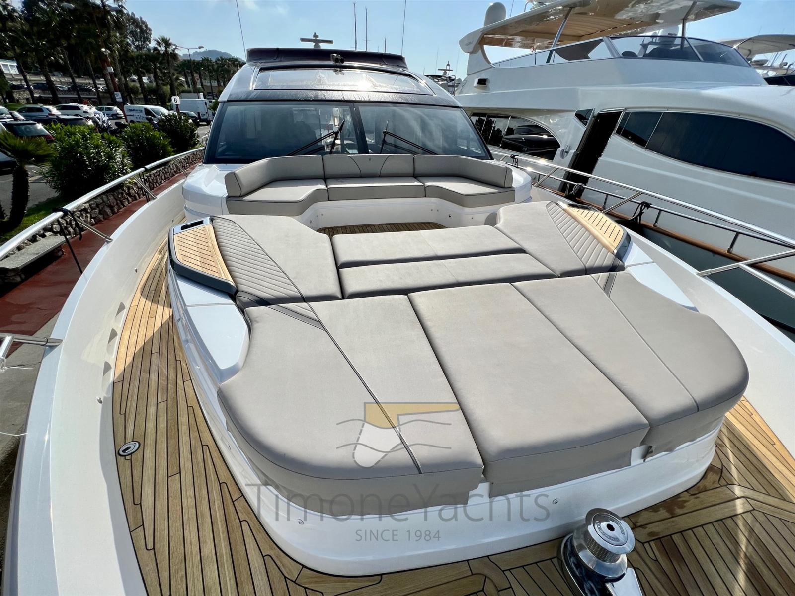 Fume/Gas Detector, 2 Engine Alarm, Bilge Alarm, Auto Dynamic Trim Interceptor, Water pressure pump, Teak Side Decks, Deck Shower, Twin Steering, Directional Spotlight, Hydraulic Flaps, Tender Garage, Tender Crane (sul Fly), Fire Extinguishing System, Flaps Indicators, Anchor Chain Washdown, Washbasin in the cockpit, Courtesy Lights, Underwater lights, Gangway (elettroidraulica), Platform (elettroidraulica), 5 Automatic Bilge Pump, Entry door, Side door, Teak Cockpit, Shorepower connector, Voltage Rectifier, Rollbar, Electric Windlass, swimming ladder, Stabilizers (Seakeeper), cockpit table, Horn, 2 Stern Winches, Bow Winches.