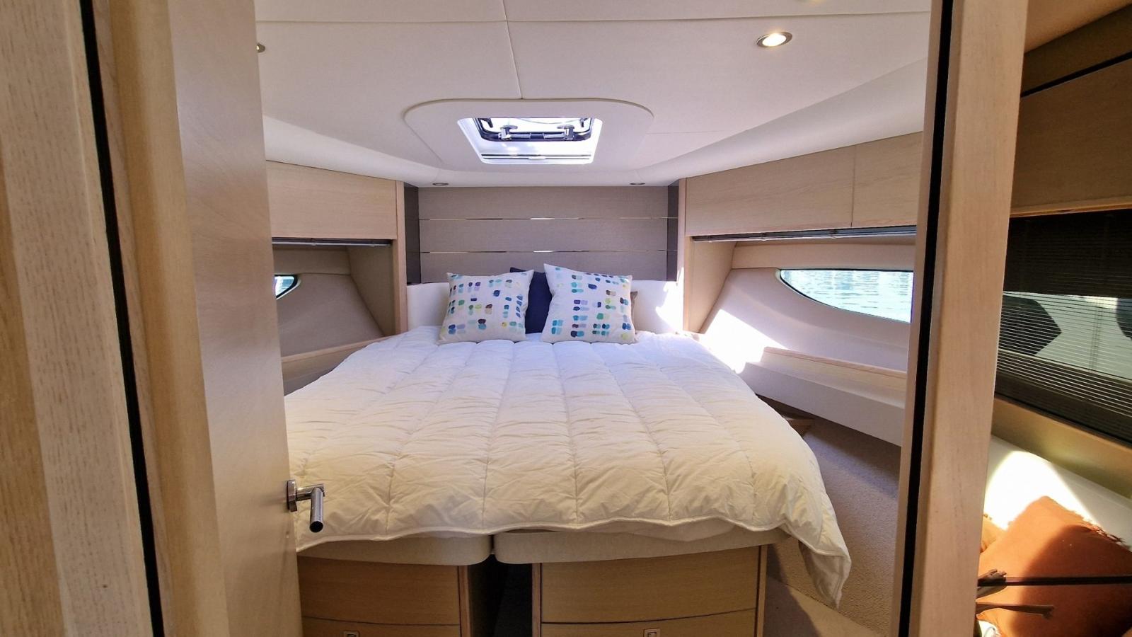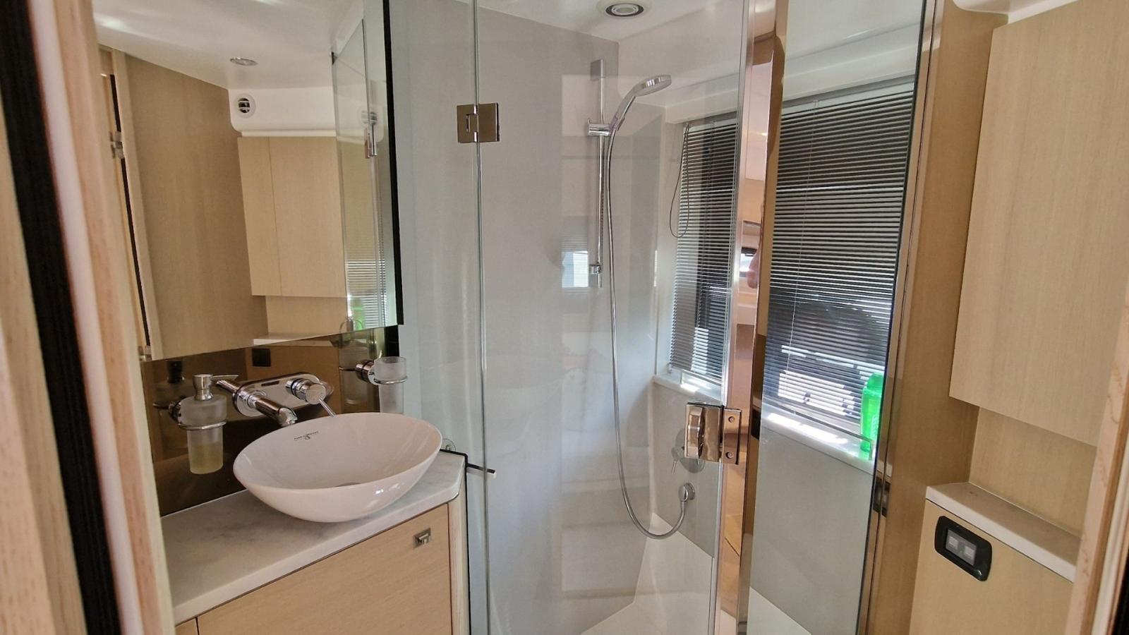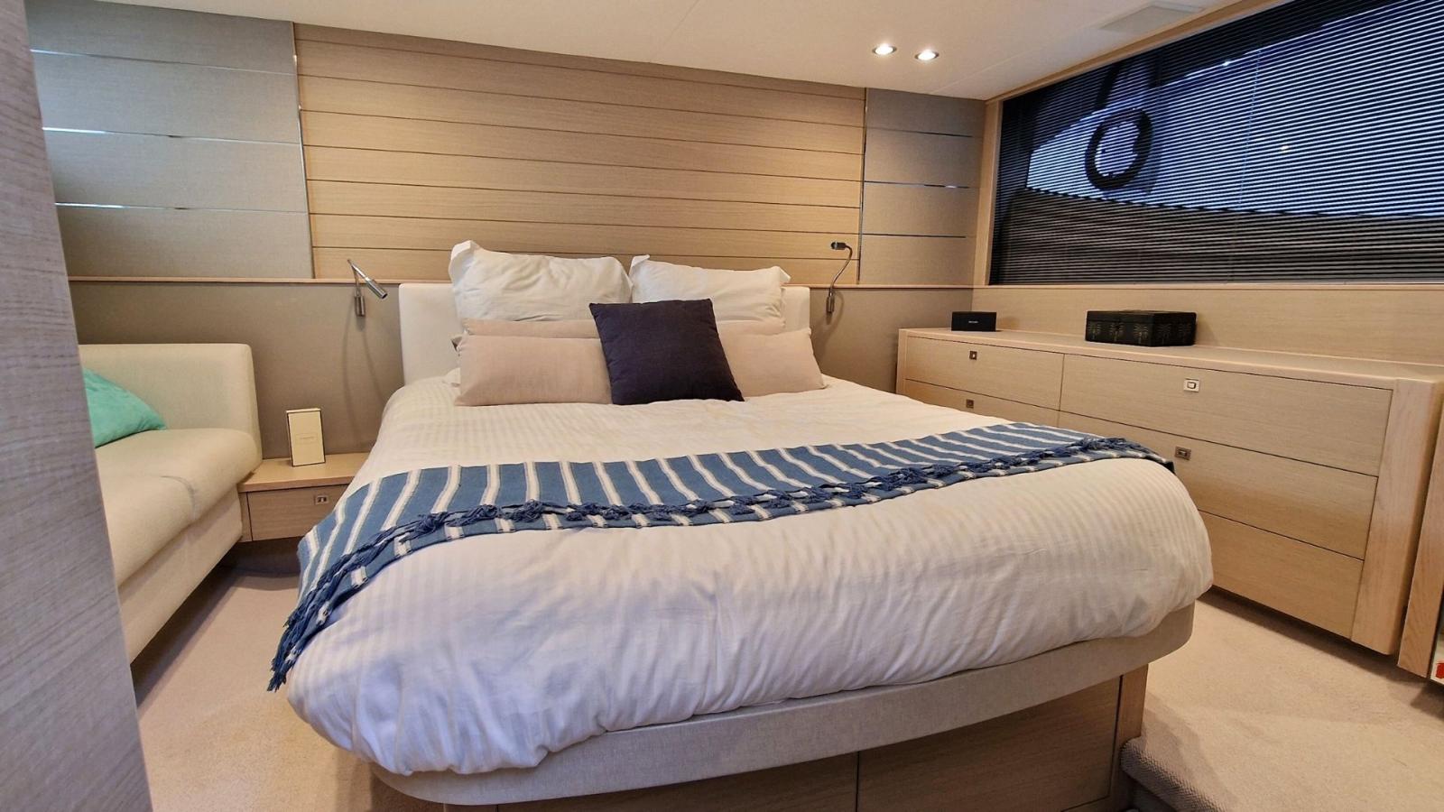 Inside, the V50 features a luxurious full-beam master cabin with ensuite, a forward guest cabin with convertible twin/double beds, and a convertible lower salon that can accommodate extra guests. The layout is ideal for a family, two couples, or small charter groups.