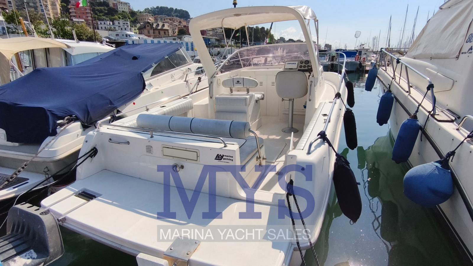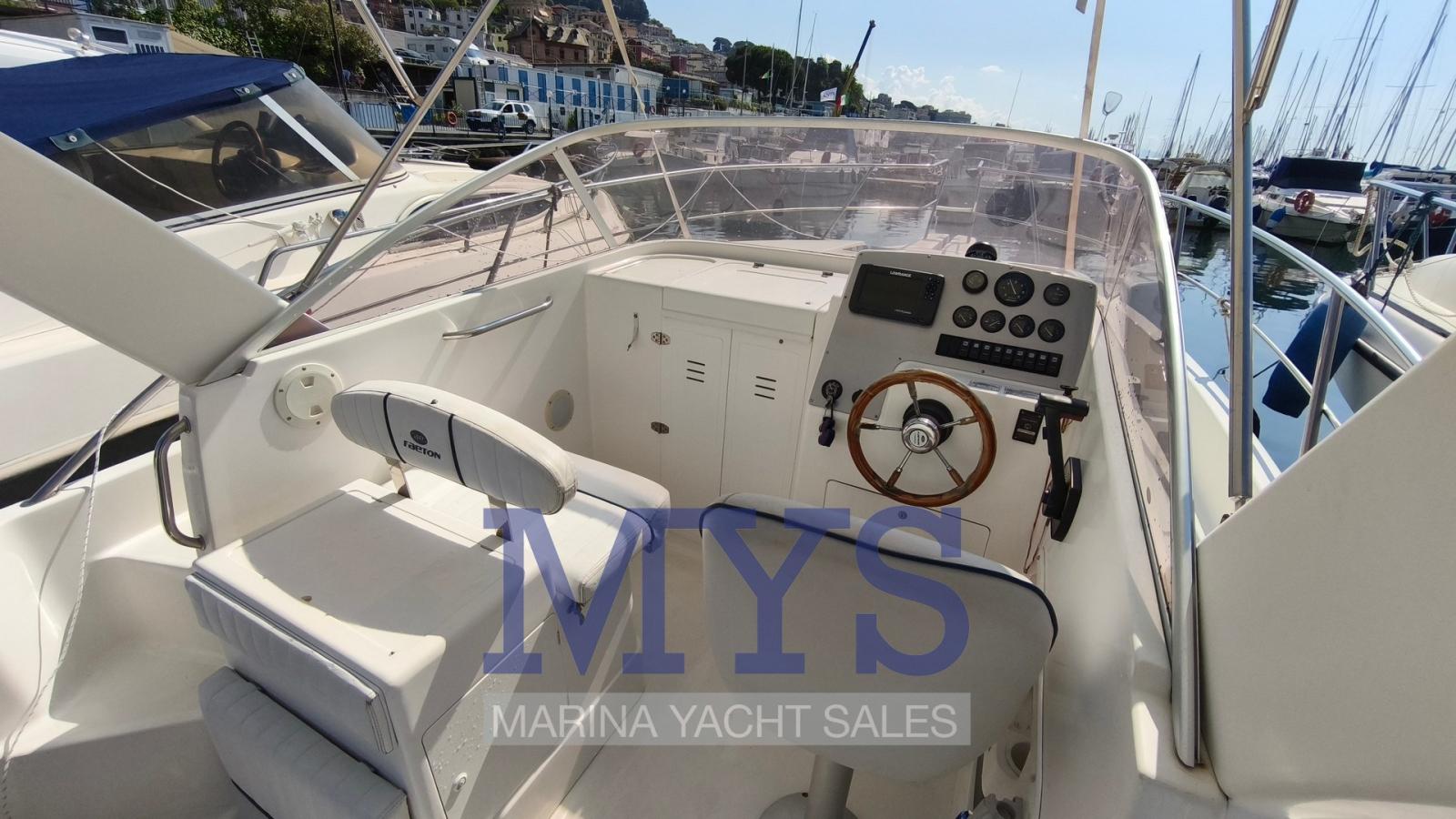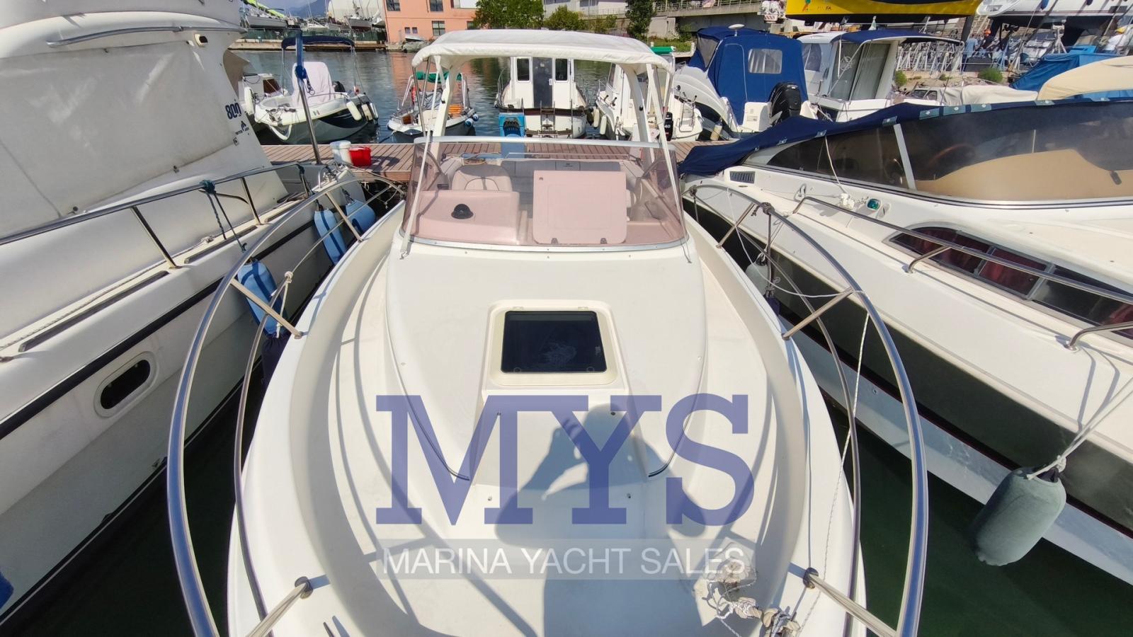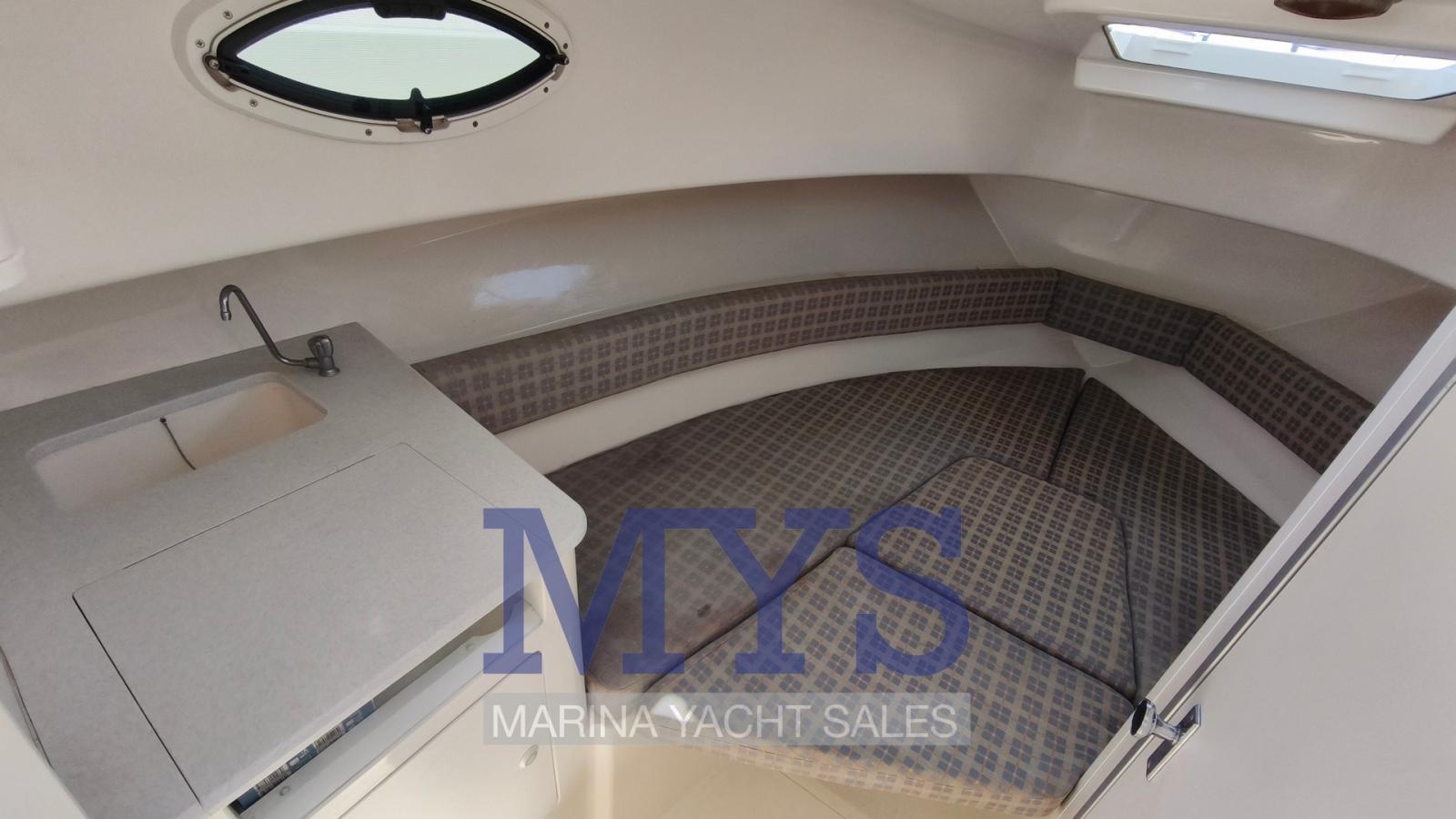 Engine Alarm, Anchor (kg 7,5 + 50 mt di catena), Water pressure pump, 2 Batteries (x 100 Ah), Deck Shower, Washbasin in the cockpit, Courtesy Lights, Automatic Bilge Pump, Entry door, Shorepower connector, Rollbar, Electric Windlass, swimming ladder, Outboard Engine Support Bracket, Horn.