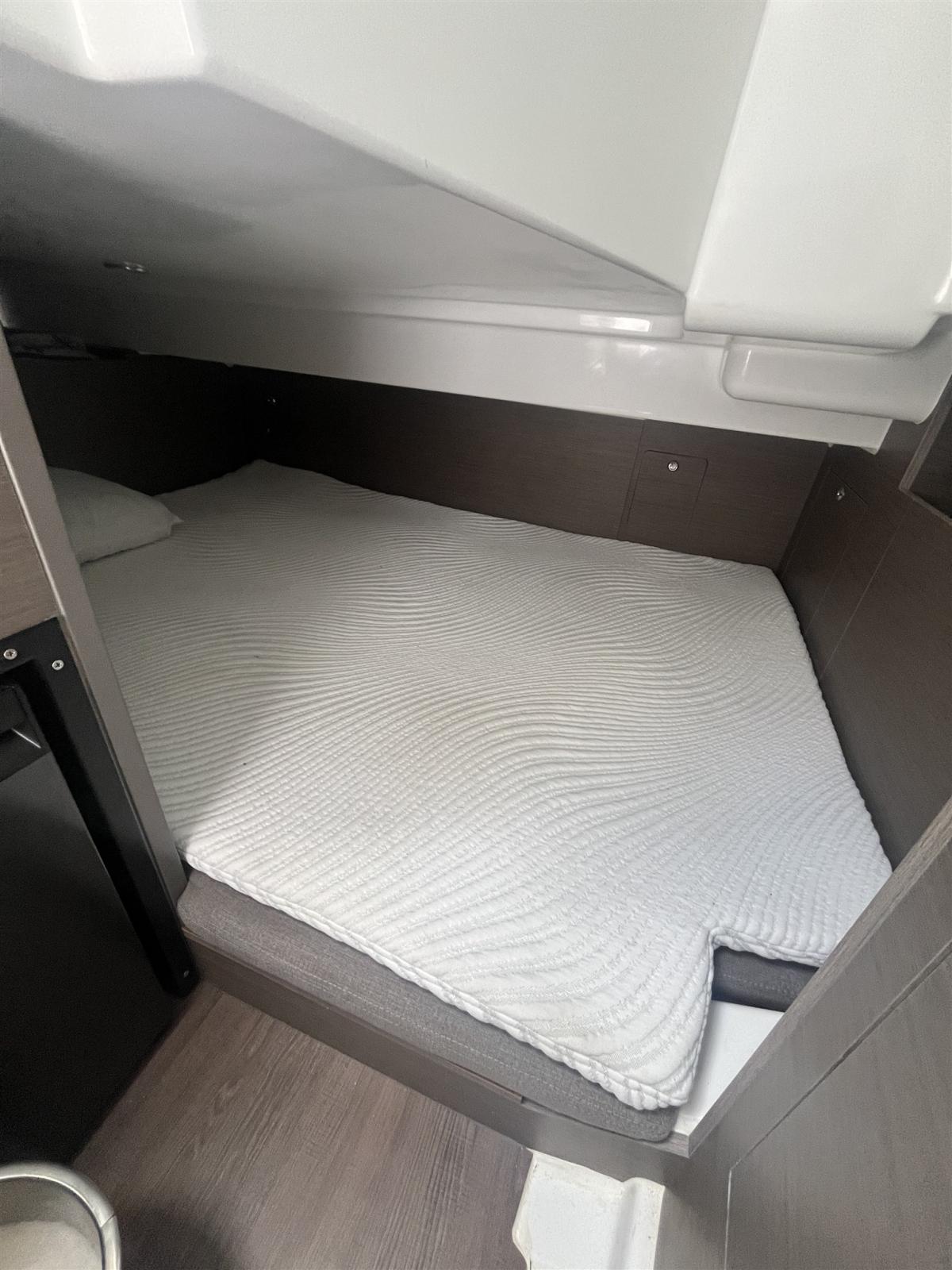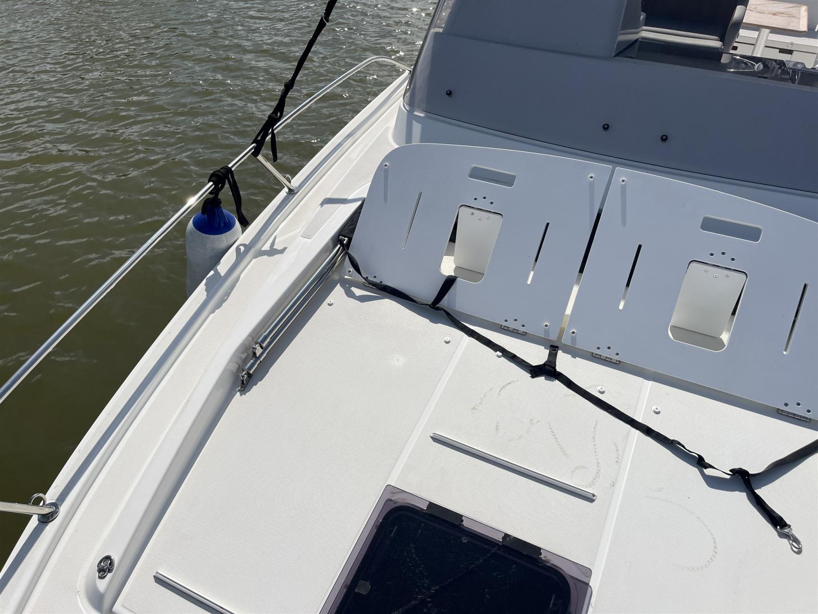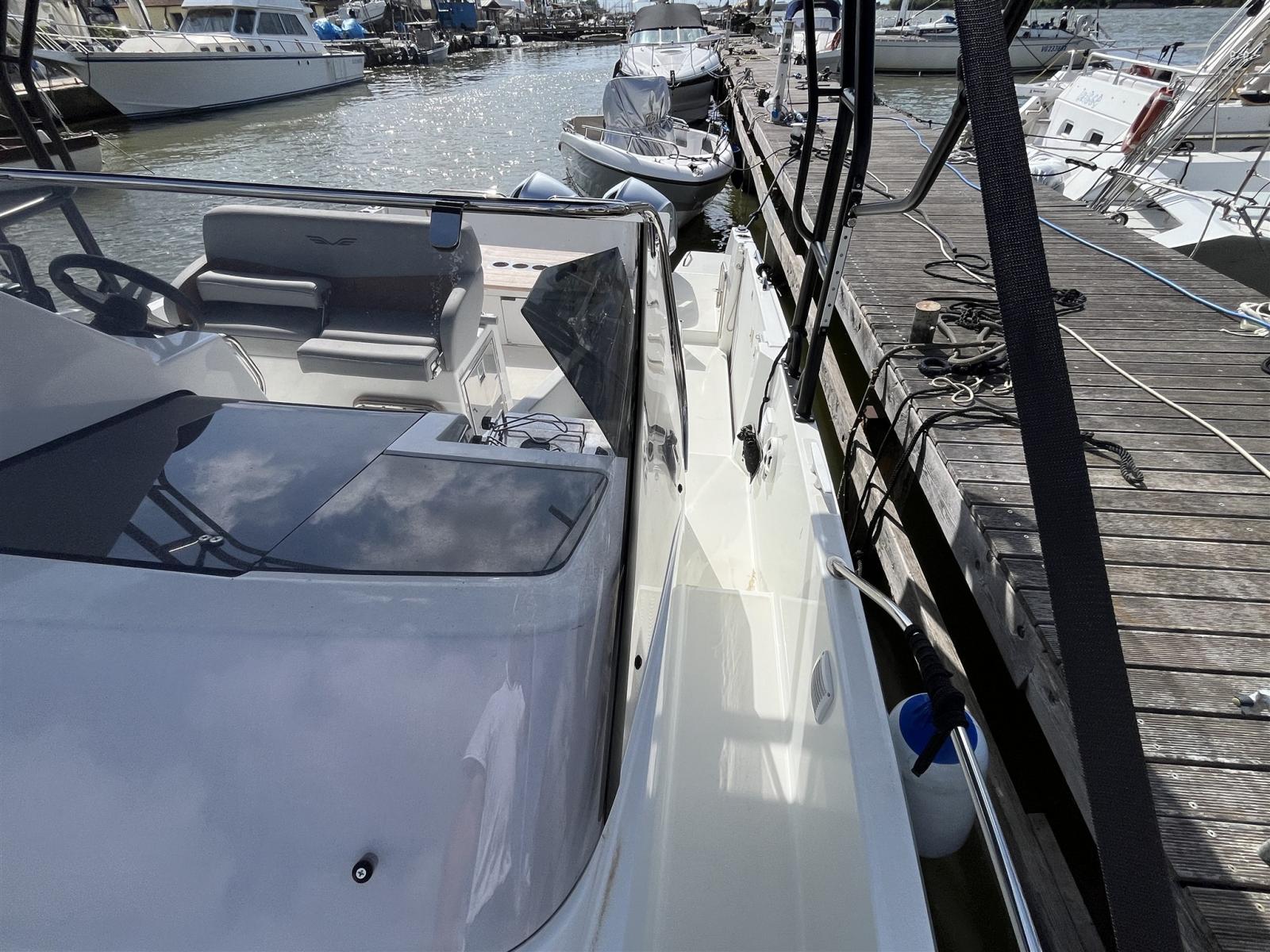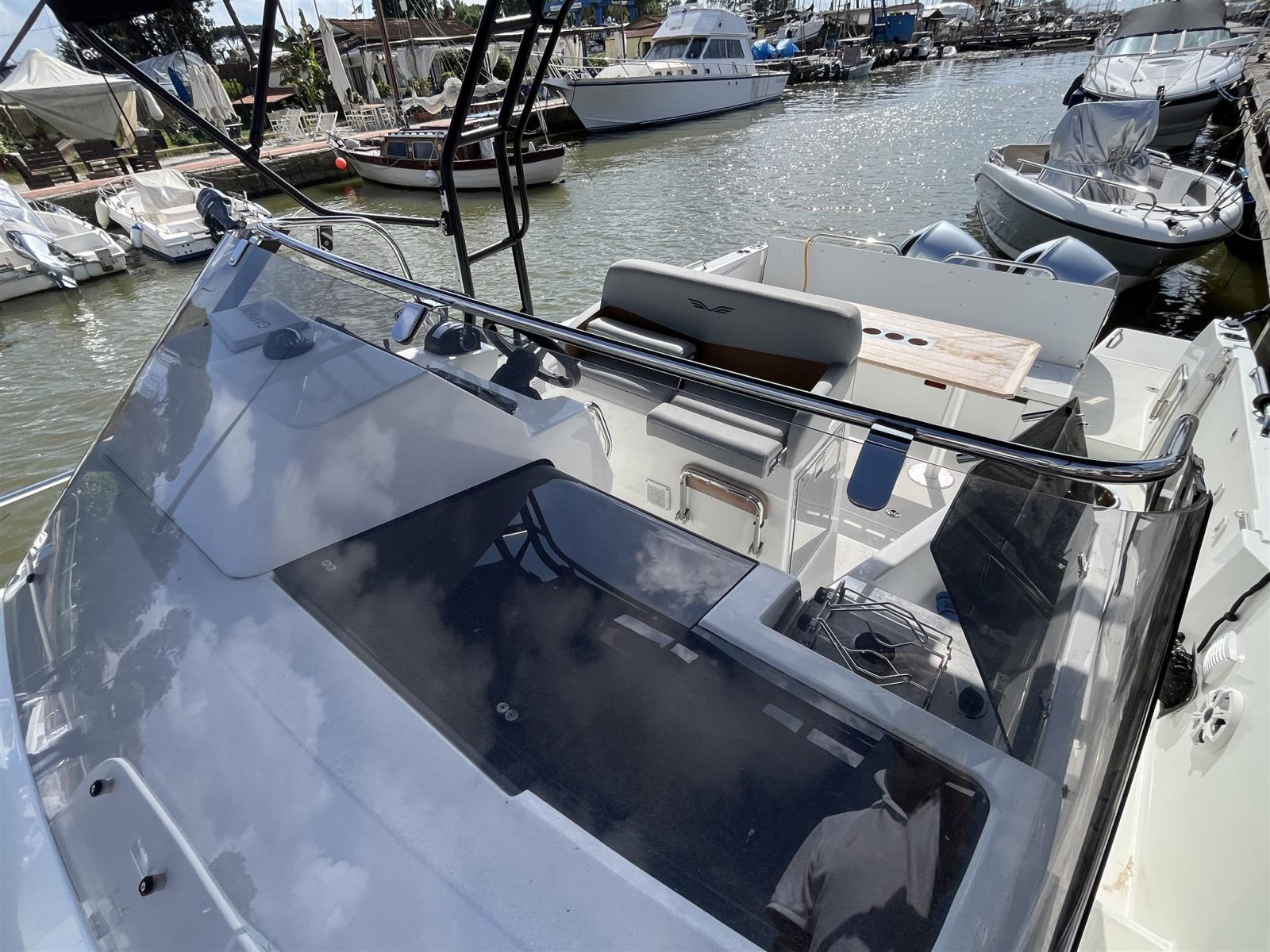 Elegance version; comfort equipment: electric winch, oversized platforms, internal kitchen sink, boiler, imp.220 with battery charger, complete internal toilet with internal shower, external gas stove, internal fridge; bow dolphin with swimming ladder; sun awning at the bow; Bluetooth stereo speakers; smaller cockpit table that cannot be transformed into a sundeck; headrest bow sunbathing cushions; side platform that can be opened with a swimming ladder; internal separating curtain; mediation of 5% + VAT 22% to be paid by the buyer (VAT is calculated on the amount of the mediation).