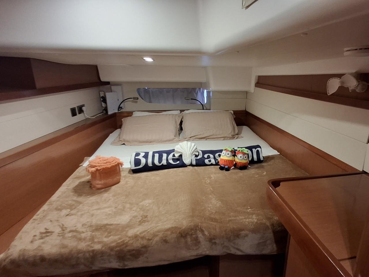 Four cabins with four shower rooms, and one forepeak skipper cabin, elegant saloon with panoramic portholes, U-shaped bench seat and large saloon table.