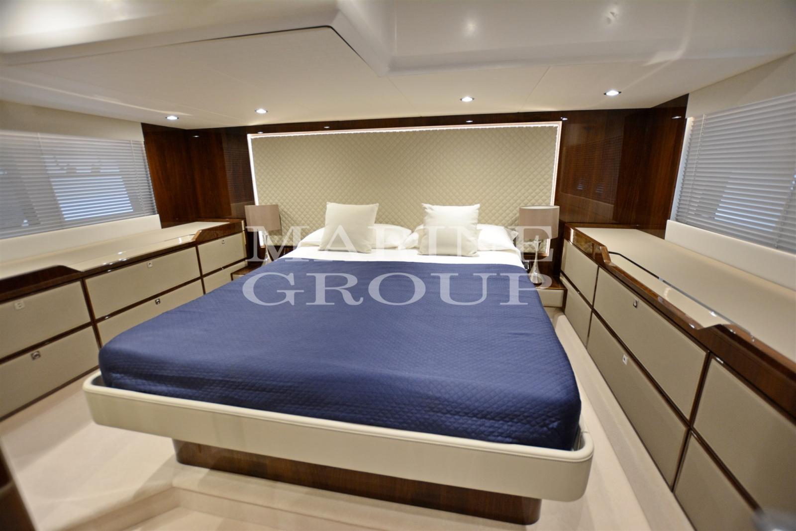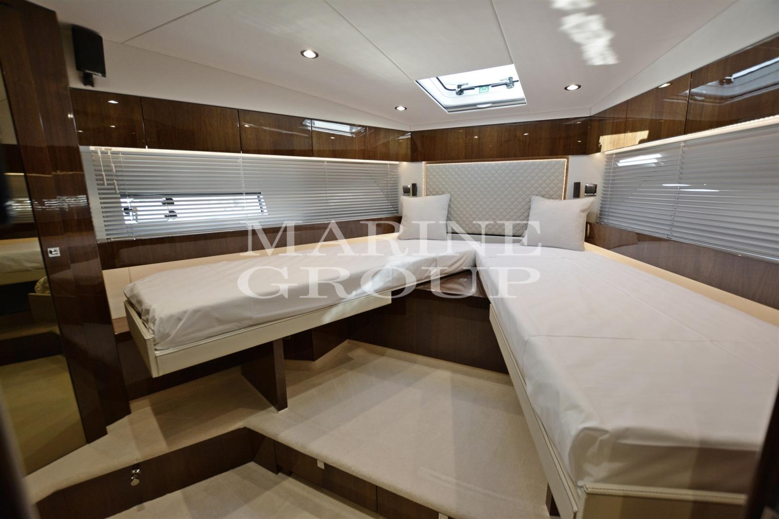 Upgrade of polished walnut interiors and wooden dinette floor - Dinette with leather sofa that converts into a bed and TV - Kitchen equipped with column fridge, pantry cabinet, ceramic hob, combined oven - Owner's cabin amidships with double drawer upgrade, wardrobe and bathroom and suite - VIP cabin in the bow with single beds that can be converted into a double bed - Guest bathroom with double access door