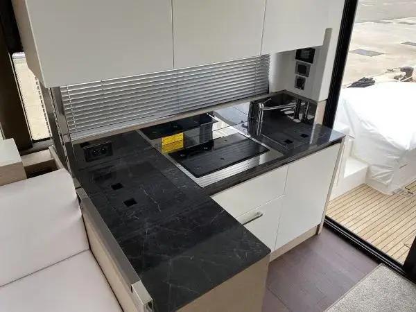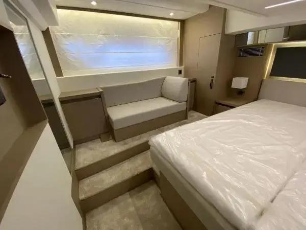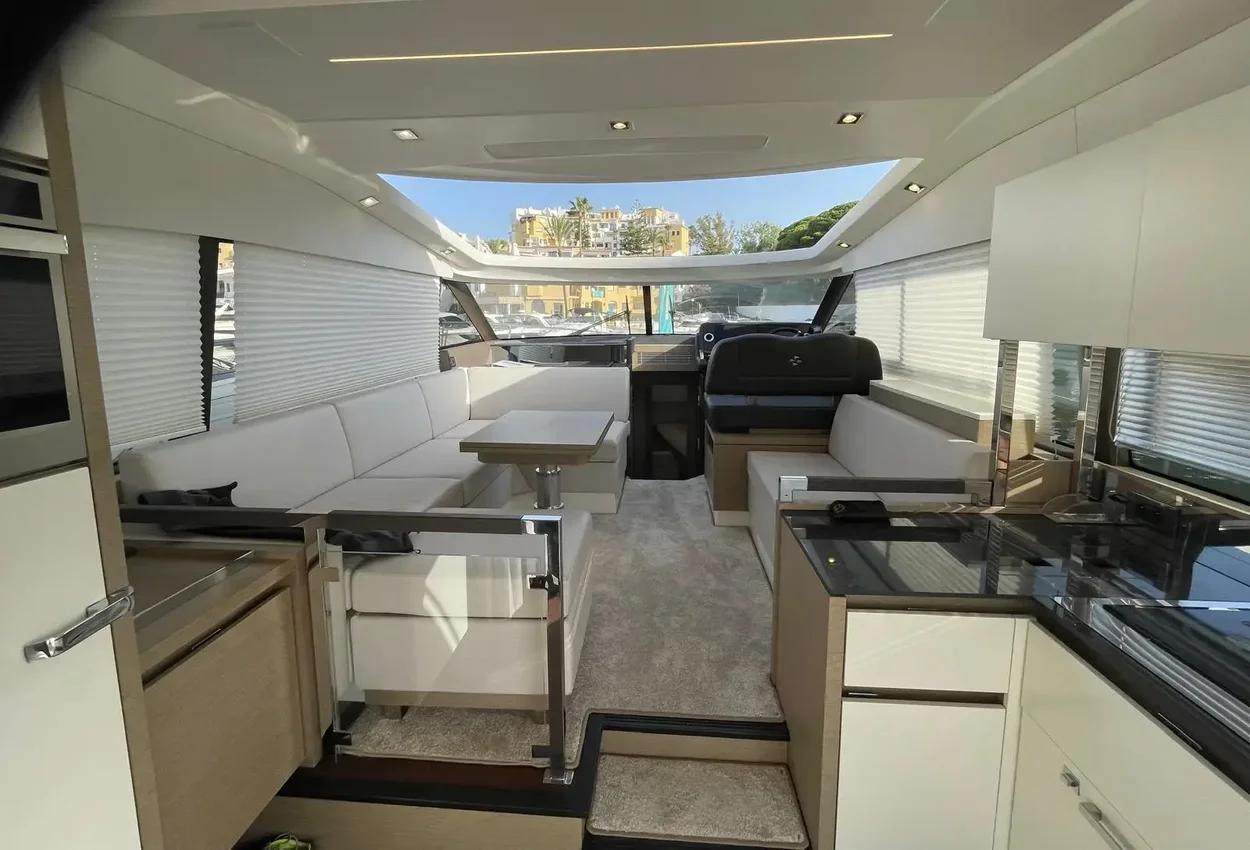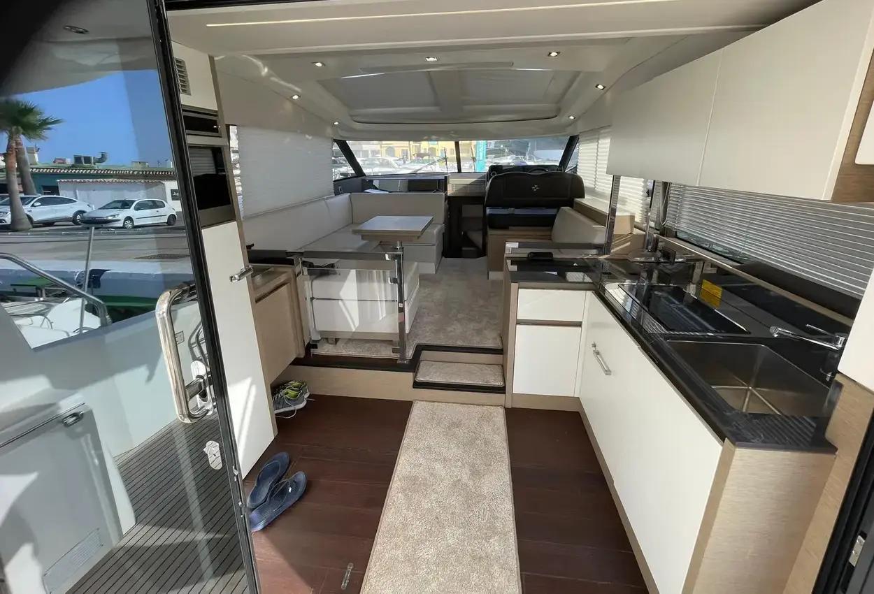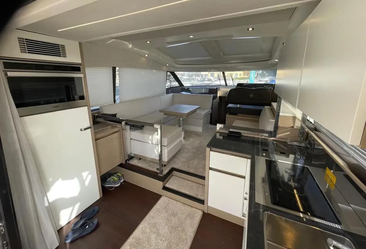 This sporty version integrates the concept that is so dear to PRESTIGE. With her remarkable sporty look, the PRESTIGE 460S benefits from an incomparable design, open to the exterior. Adaptable to suit your needs, the large opening sunroof and immense sliding glass door aft can be used to modulate the living space. The PRESTIGE 460S allows one to enjoy an enhanced exterior space when fully opened and a more protected living space when closed. It is worth noting the enhanced modular design, featuring the new L-shaped cockpit, which transforms into a very large sundeck.